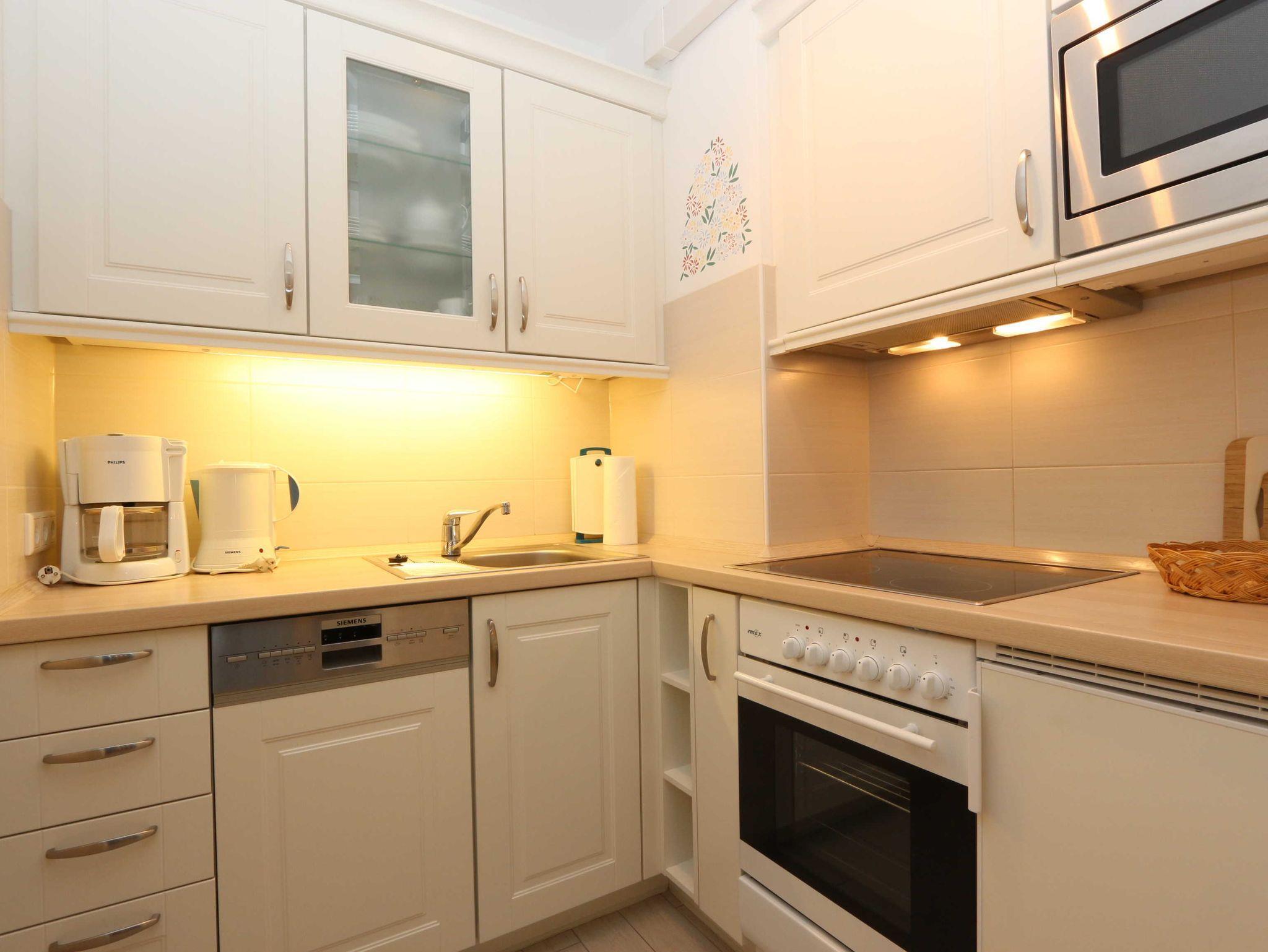• Die Einbauküche verfügt über ein 4-Platten-Glaskeramikkochfeld, Bachofen, Mikrowelle, Kühlschrank mit Gefrierfach, Wasserkocher, Kaffeemaschine, Toaster und ausreichend Geschirr.
