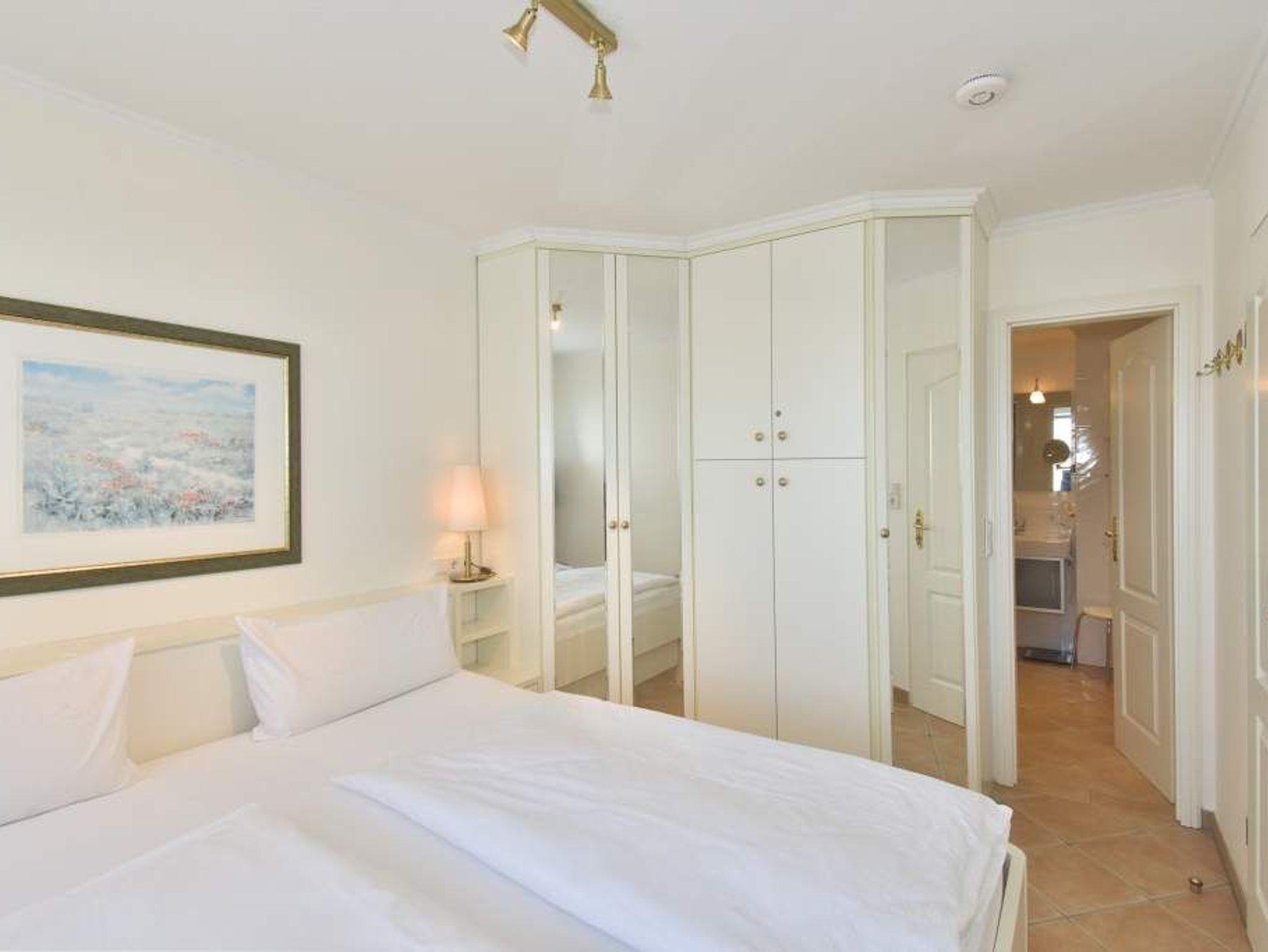 Das Schlafzimmer (mit einem weiteren Austritt zur Dachterrasse) erreicht man durch das Wohnzimmer. Hier befinden sich ein Doppelbett (zwei Einzelmatratzen 0,90 x 2,00 m), ein großer geräumiger Kleiderschrank und ein Zugang zum Duschbad/WC.