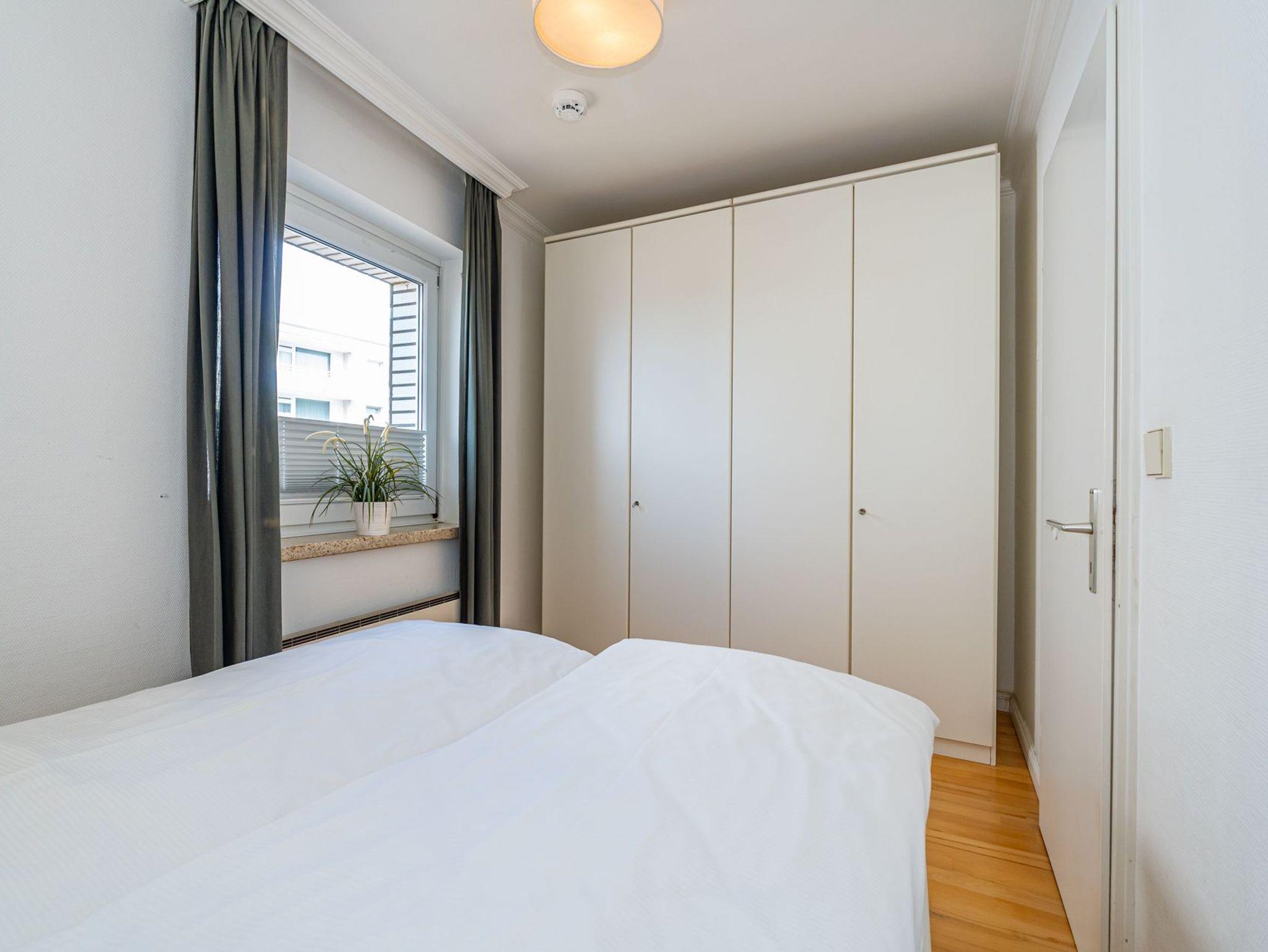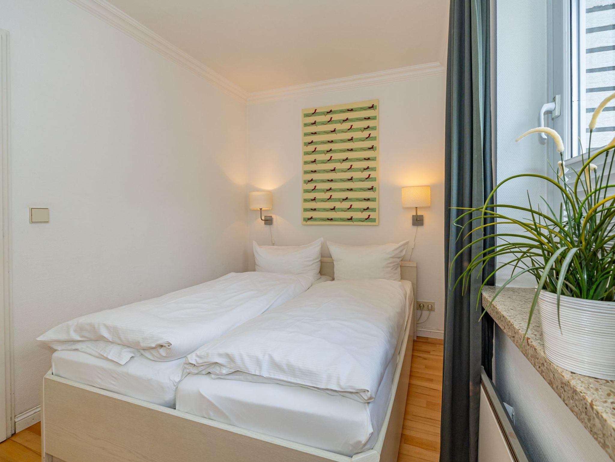 Gut ausgestattete 2-Zimmer-Nichtraucher-Ferienwohnung, ca. 41 qm in der 2. Etage mit Meerblick und Westbalkon (Nachmittagssonne mit Balkonmöbeln und Auflagen) für 2 Personen.