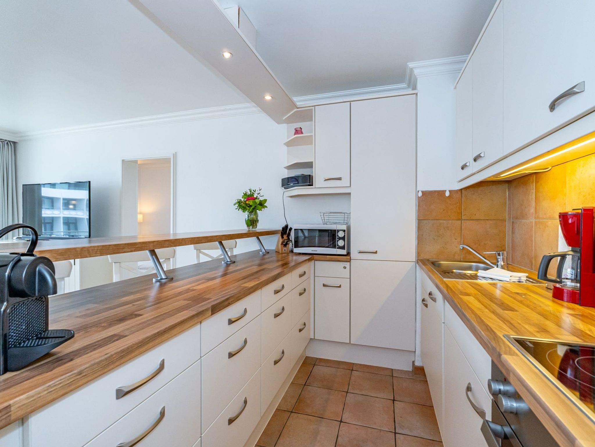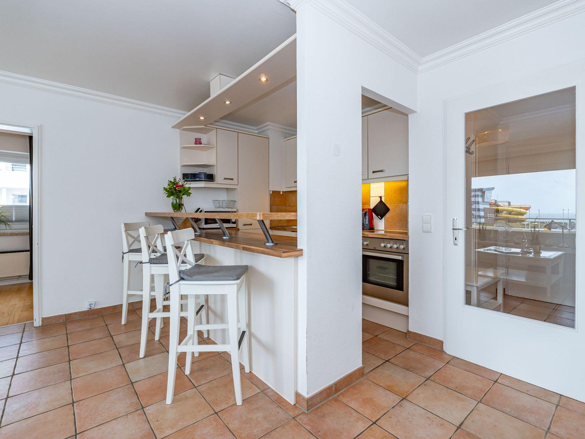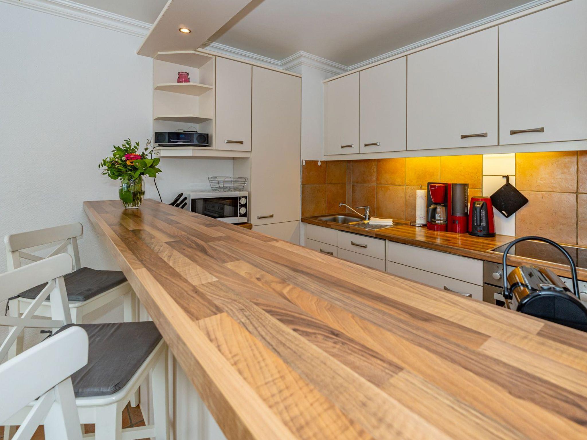 Die zum Wohnraum hin offene, vollausgestattete Küche ist mit Geschirrspüler, Mikrowelle, Backofen, Ceranfeld (mit 4 Kochfeldern), Nespresso-Maschine und Kühlschrank mit Gefrierfach ausgestattet. Kaffeemaschine, Wasserkocher und Toaster gehören zur Grundausstattung.