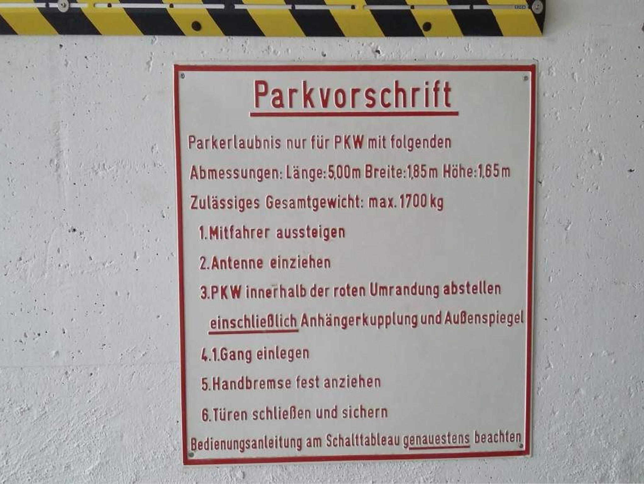 Für Klein- bis Mittelklassewagen steht ein kostenfreier PKW-Stellplatz in der Tiefgarage zur Verfügung. Der PKW darf folgende Maße nicht überschreiten: Länge 5,00 m (einschl. Anhängerkupplung), Höhe: 1,65 m (einschl. Dachaufbauten u. Antenne), Breite: 1,85 m (einschl. Außenspiegel), Gewicht 1.700 kg. Die Parkspur bietet nur Platz für Reifen bis 45 cm Breite. Der PKW wird zum Einparken in einen Autoaufzug abgestellt.