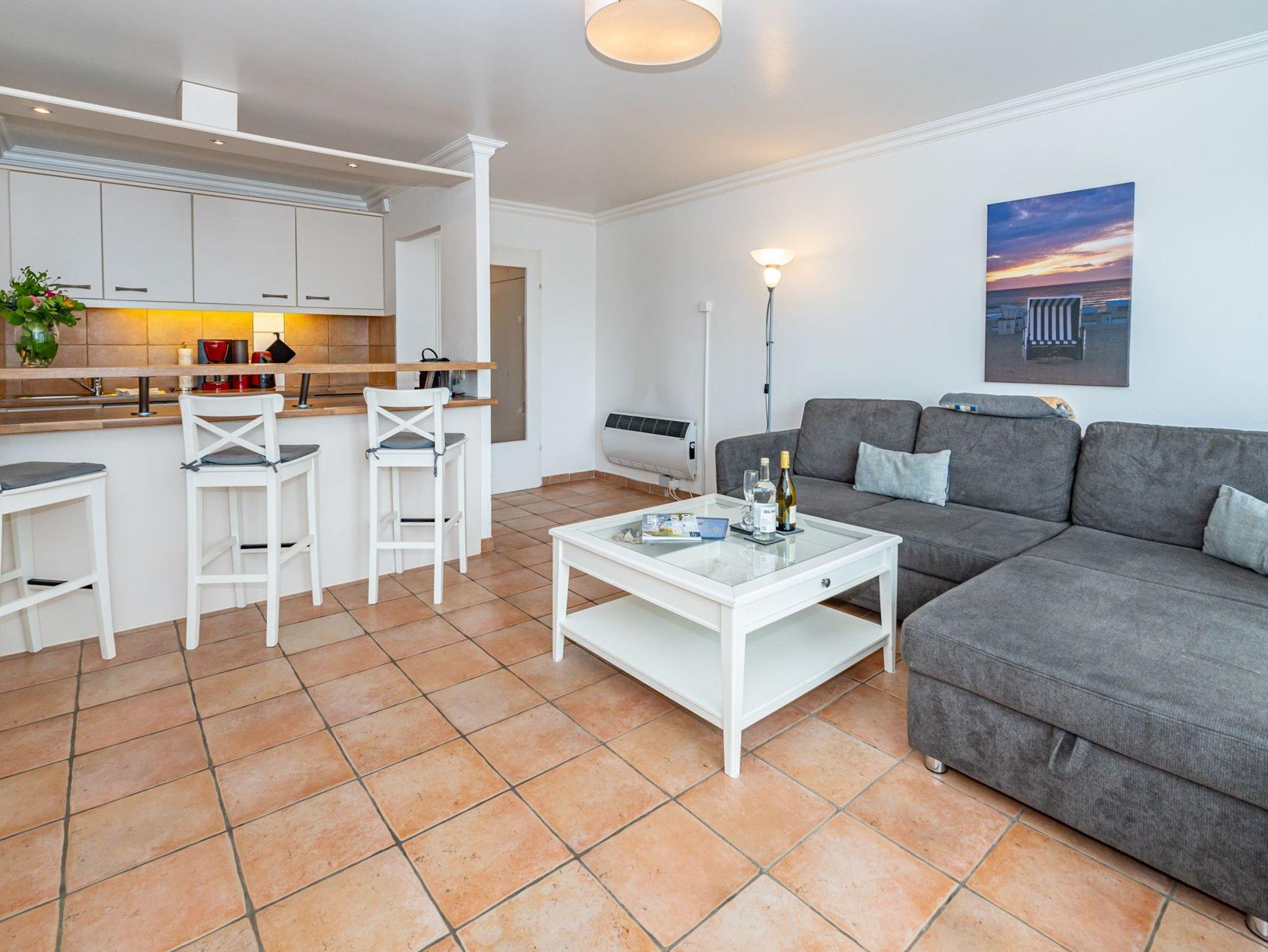Der Wohnraum verfügt über eine Sitzgarnitur, Fußhocker, einen Essplatz am Küchentresen, ein Flachbild-TV, Radio/CD.