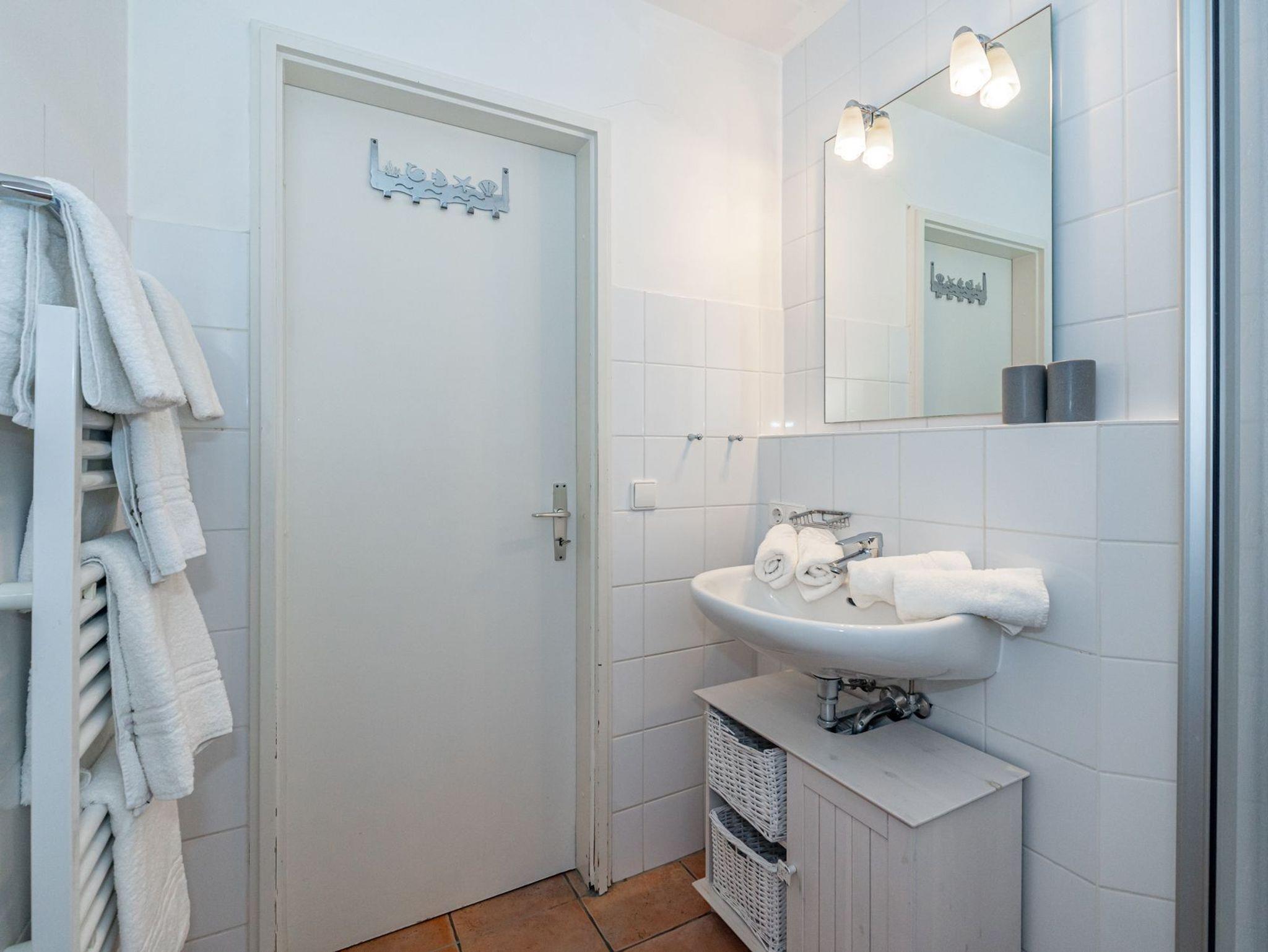 Das Badezimmer verfügt über Dusche, WC, Waschtisch, Handtuchtrockner, Fön und Personenwaage. Waschmaschine und Trockner befinden sich zur Gemeinschaftsnutzung gegen Münzeinwurf in der Waschküche des Hauses.