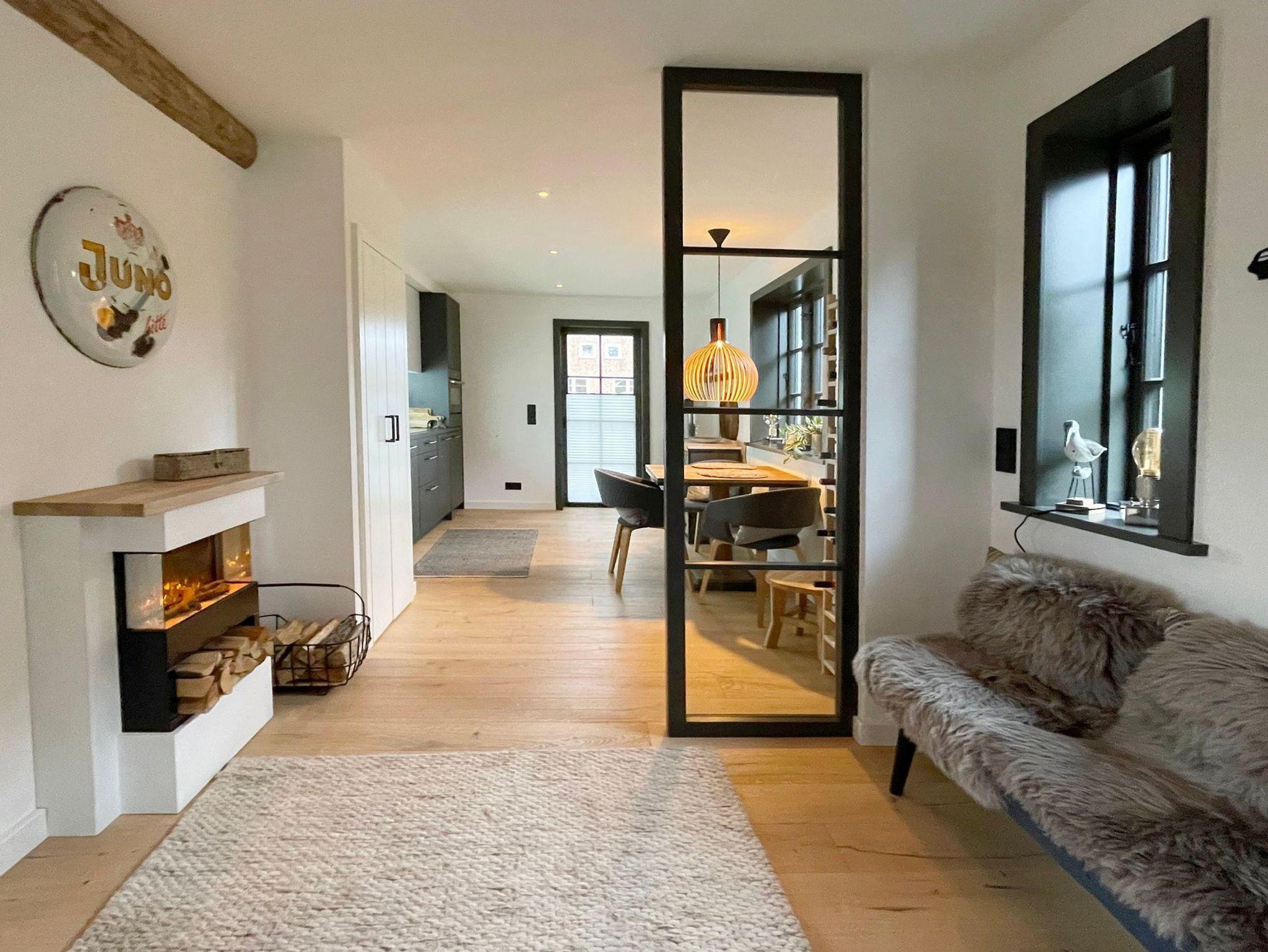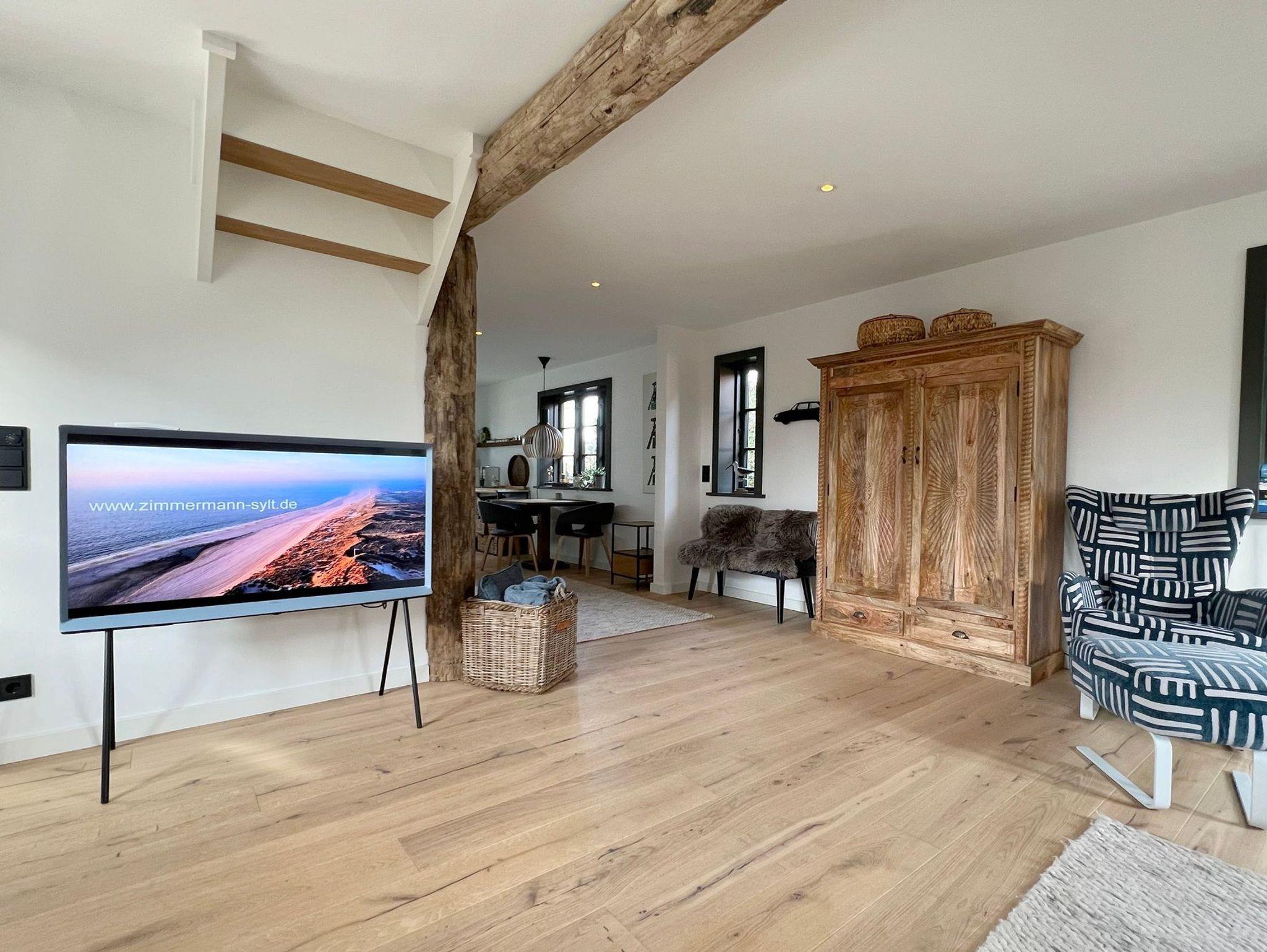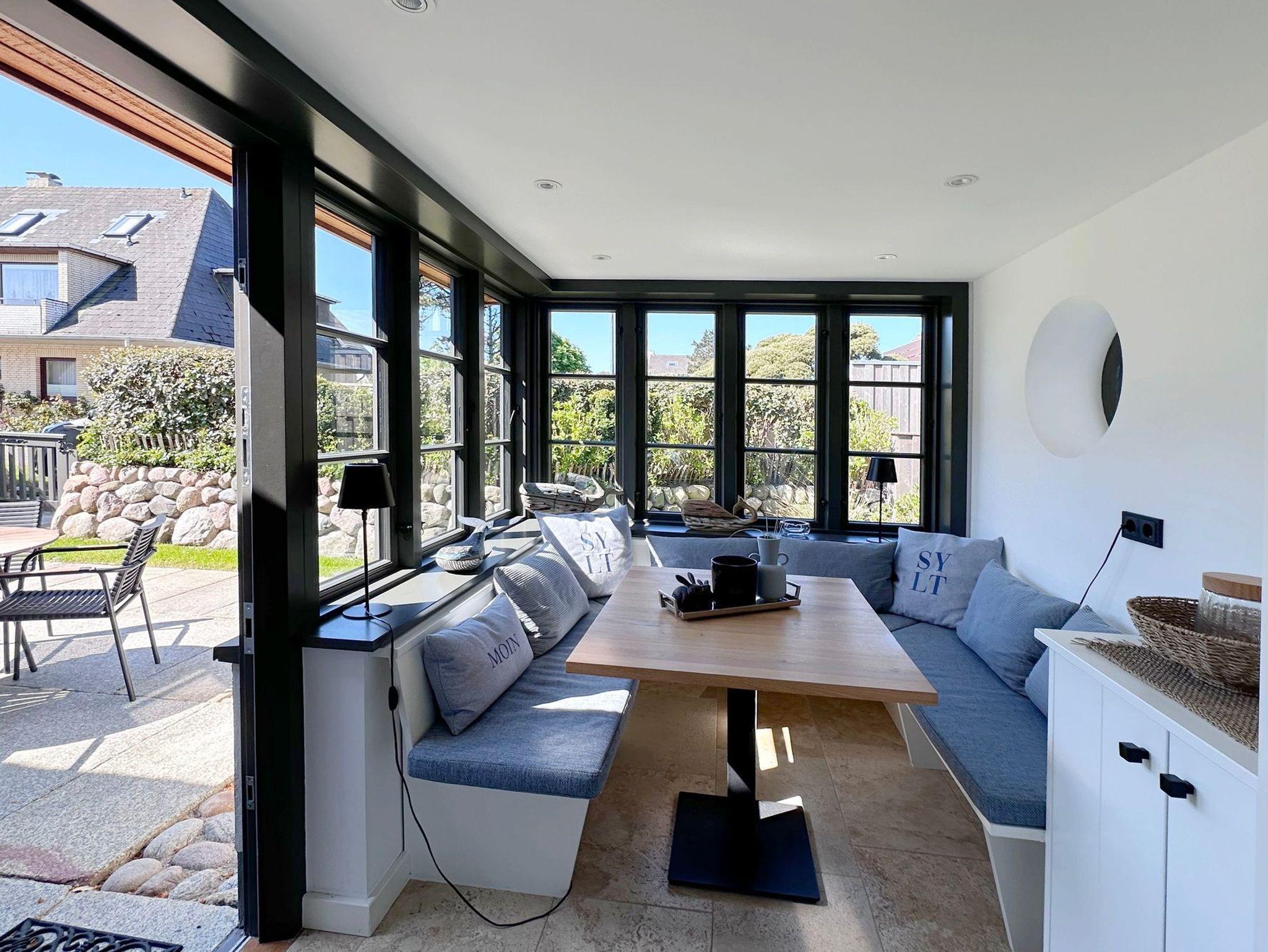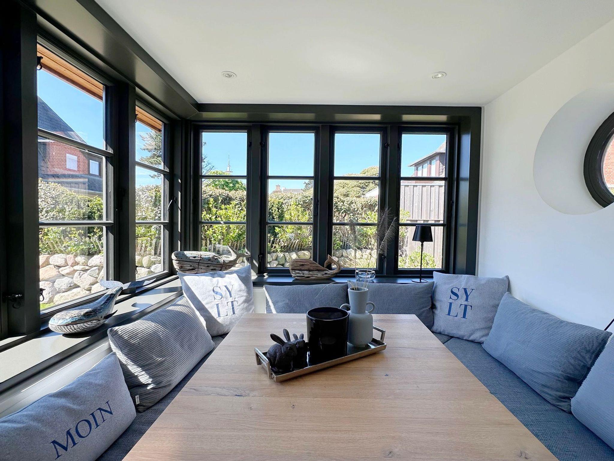 viele exklusive Details im und am ganzen Haus wie der zu 3 Seiten verglaste Erker mit maßgefertigtem Garderobenschrank, Designlampen von der Lichtinsel Sylt auf beiden Etagen, Original Sylter Buhnenholz vom Strand im Wohnbereich, Schreinergefertigte Einbauten im ganzen Haus, Gartenmöbel für 2 Terrassen und Liegestühle.
