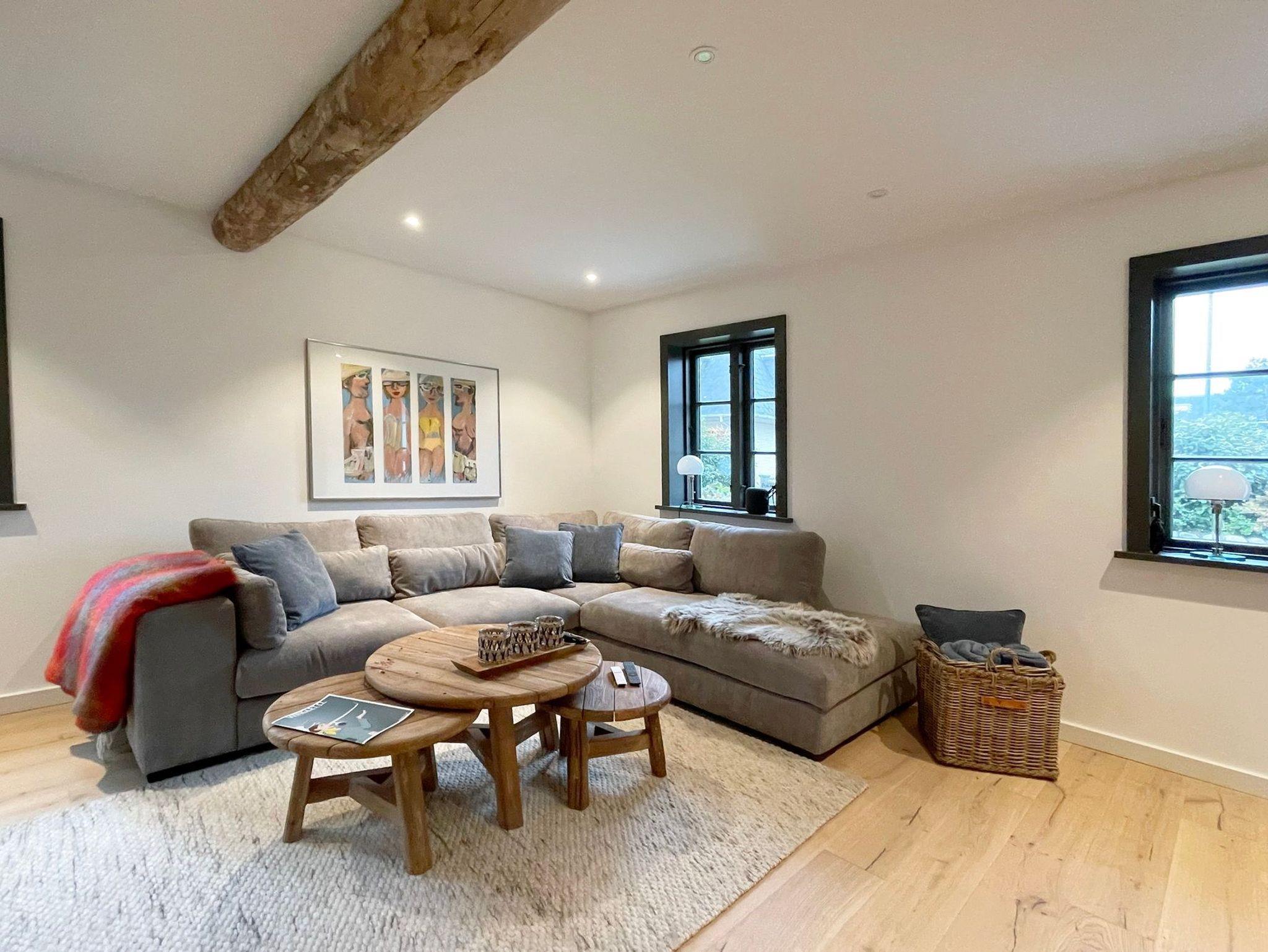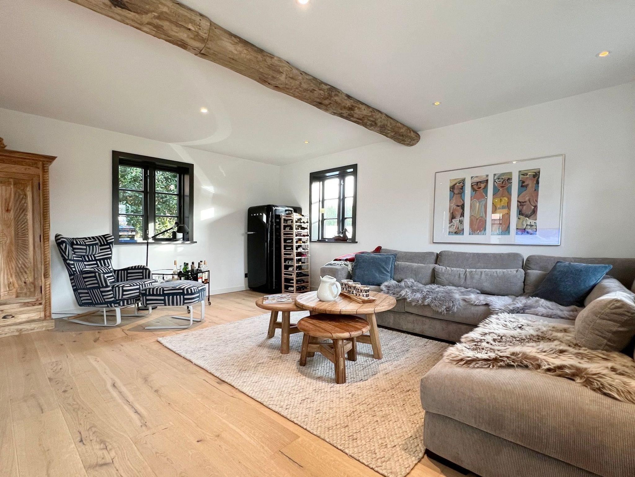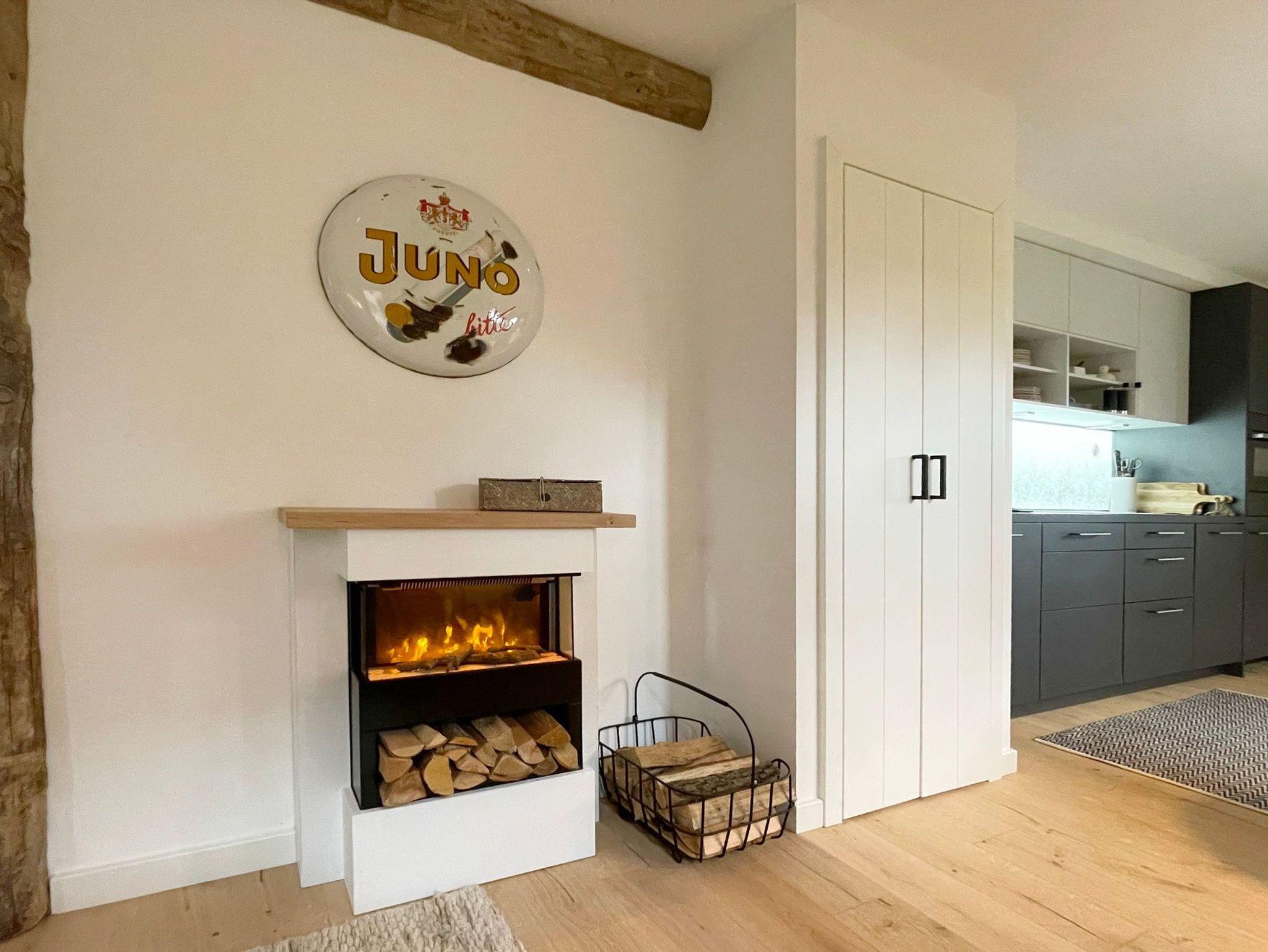 EG: Wohnbereich mit großzügiger Lounge-Ecke und Schaukelsessel mit Footstool zum Relaxen, Smeg-Kühlschrank, Magenta TV und Apple-Box, Elektrokamin mit Kaminbank für 2. Die offene moderne Küche der Firma Leicht ist top ausgestattet und verfügt über eine Arbeitsplatte mit Lautsprecher und Aufladestation . Hier ist auch ein kleiner Sitzplatz für 2-3 Personen.