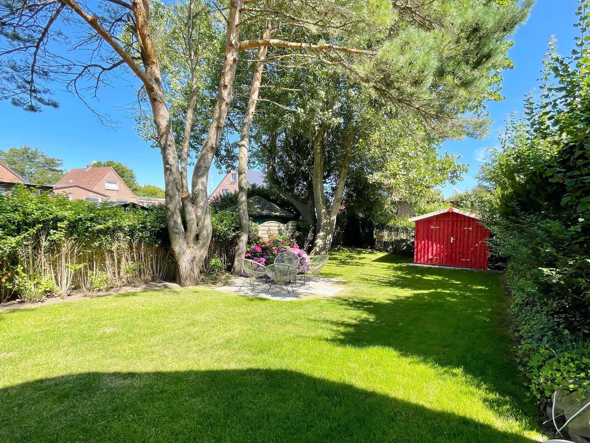 Der ebenfalls von einem Landschafts- und Gartenbauer neu gestaltete Garten wird von einem Friesenwall mit Eingangspforte umgeben und lässt inklusive des Vorplatzes am Abend wunderschön beleuchten. Dieser umgibt das Haus, bietet viel Privatsphäre und ganz nach Wunsch Sonne oder Schatten auf Krusten-Naturstein / Katzenkopfpflaster-Terrassen oder auf dem Rasen, schwedenrotes Gartenhaus für die Terrassenmöbel im Garten und eine Alu-Fahrradbox direkt am Haus.