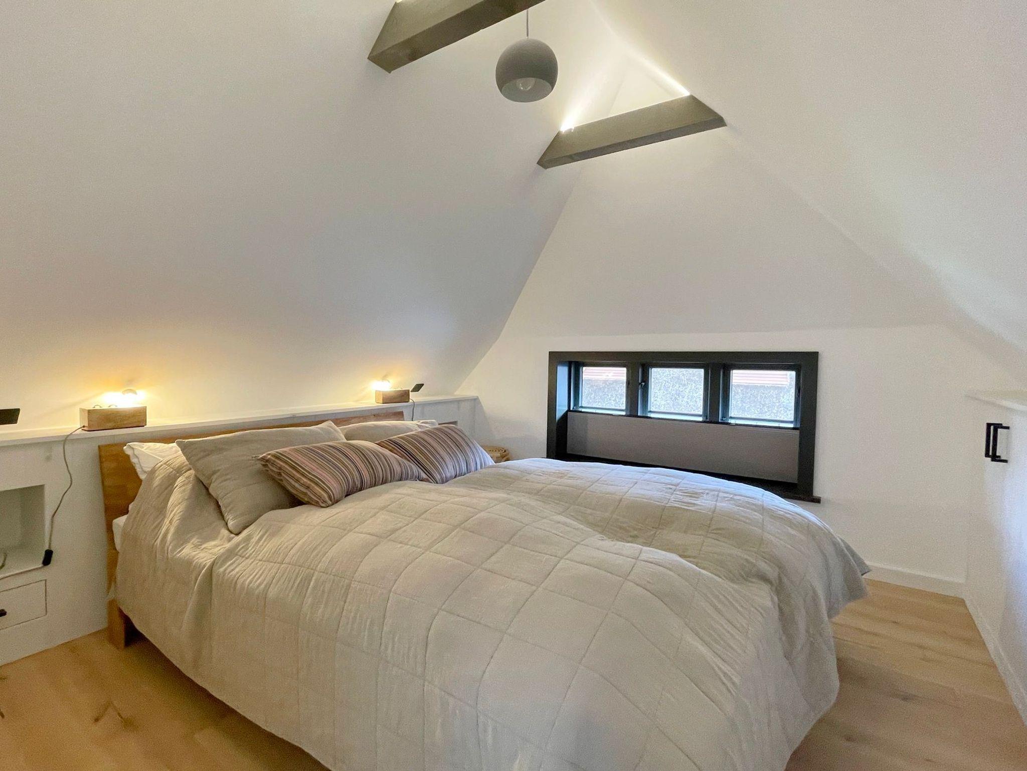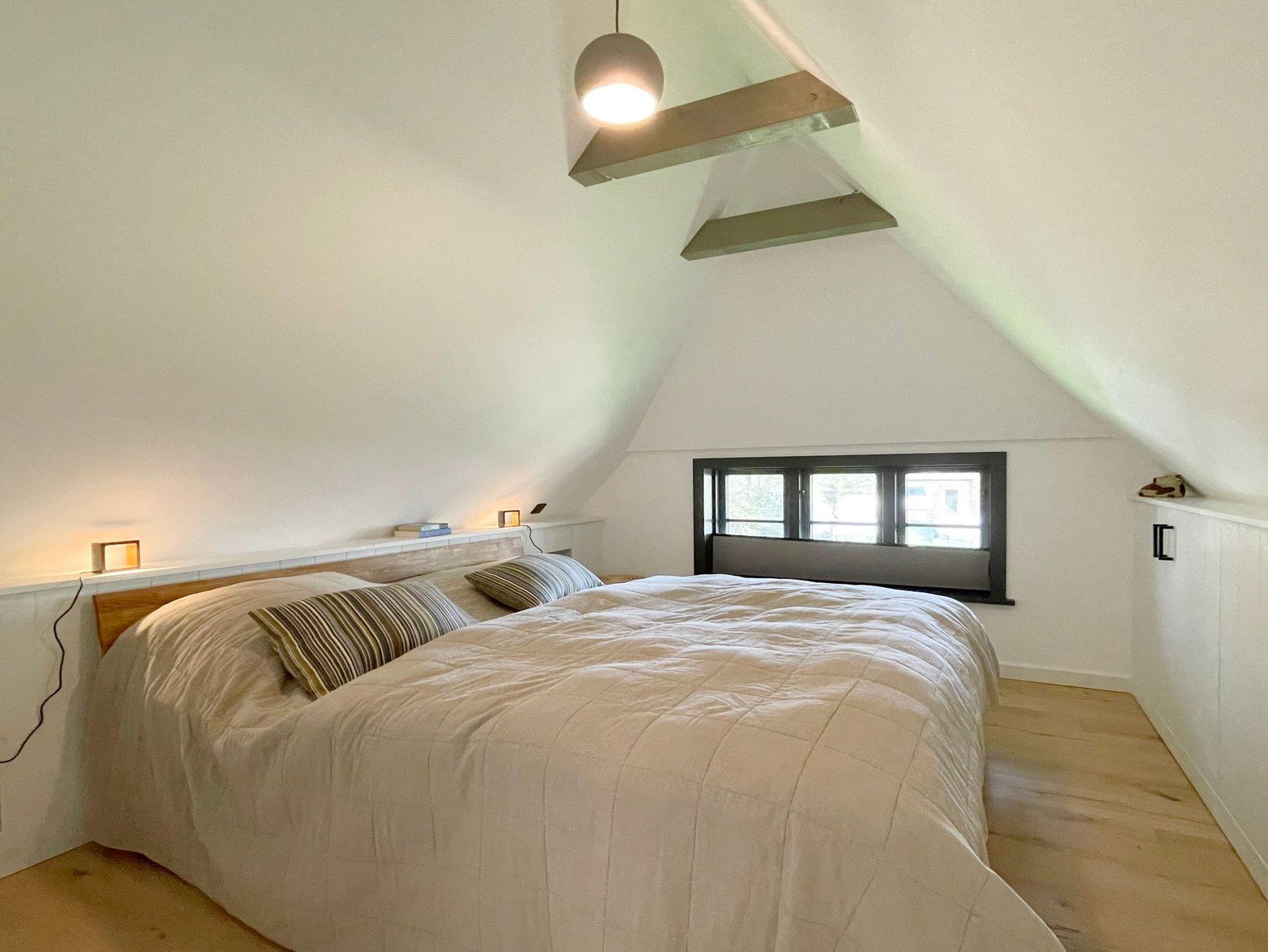 OG: Bis in den Giebel geöffnete kleine Galerie mit Reetdach-Gaube, von der nach links und rechts jeweils ein Schlafzimmer mit Doppelbett, Einbauschrank und Sprossenfenstern mit Verdunklungsrollo abgehen.