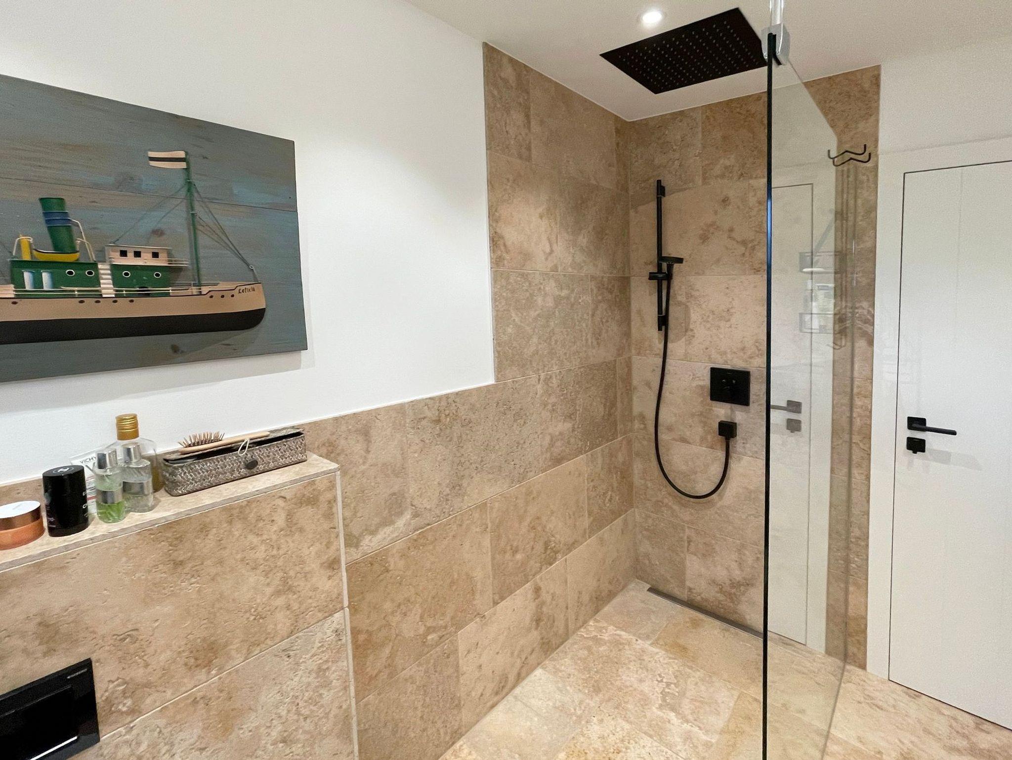Badezimmer: Natursteinbad mit großer Walk-In-Dusche und Raindance-Deckendusche und Handbrause. Handtuchheizkörper, WC und Einbau-Duravit-Waschtisch