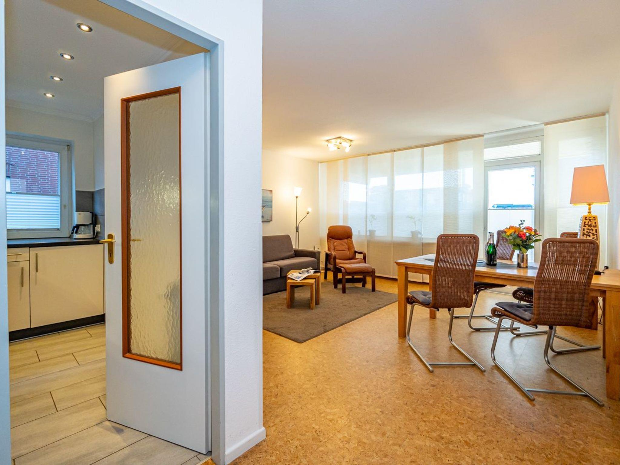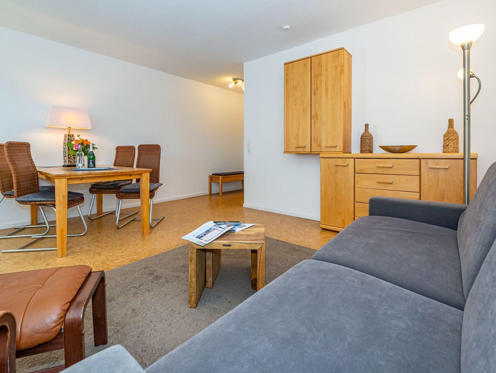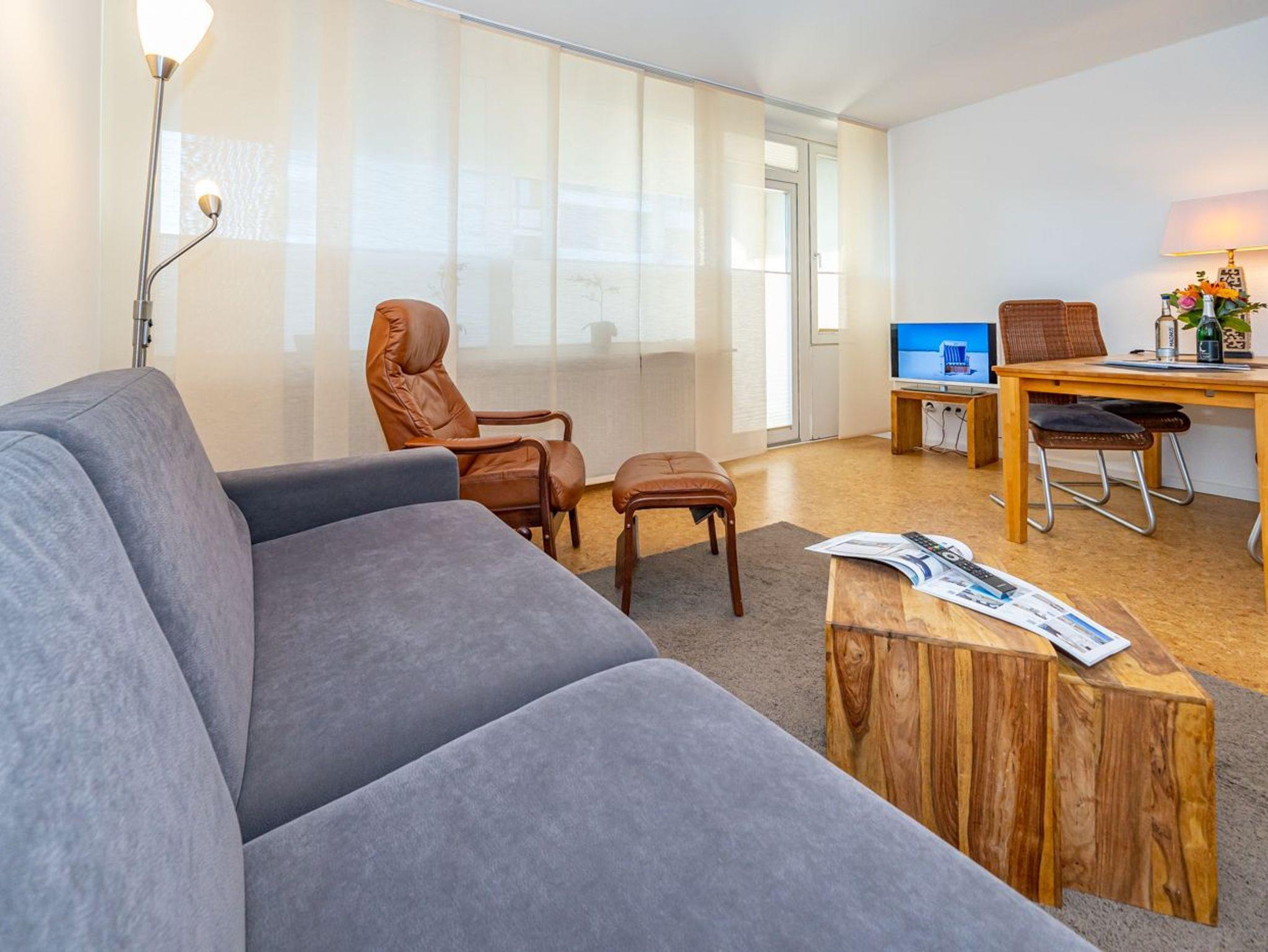 Die ca. 60 m² große Wohnung empfängt Sie mit einem einladenden Vorflur inklusive Garderobe und Schuhablage. Von hier aus erreichen Sie das gemütliche Wohnzimmer mit Zugang zur Loggia, das separate Schlafzimmer, die moderne Küche sowie das neue Duschbad. Die Westloggia bietet Ihnen herrliche Nachmittagssonne und ist mit bequemen Balkonmöbeln und Auflagen ausgestattet ? perfekt zum Entspannen. Der großzügige Wohnbereich verfügt über eine komfortable Sitzgarnitur mit Schlaffunktion (3-Sitzer-Couch), Sessel und Fußhocker, einen Esstisch sowie einen Kabel-Flachbild-TV für entspannte Stunden.