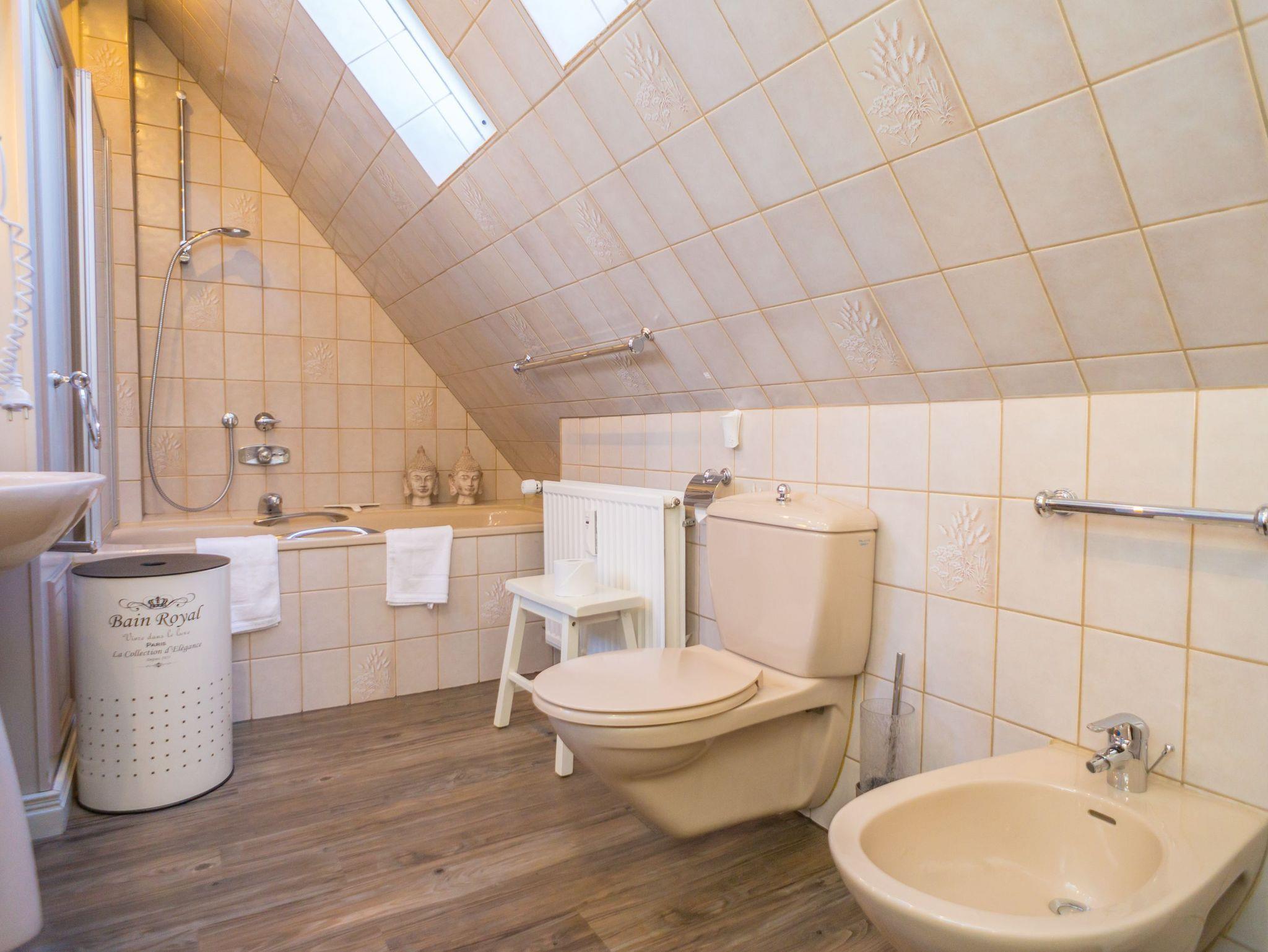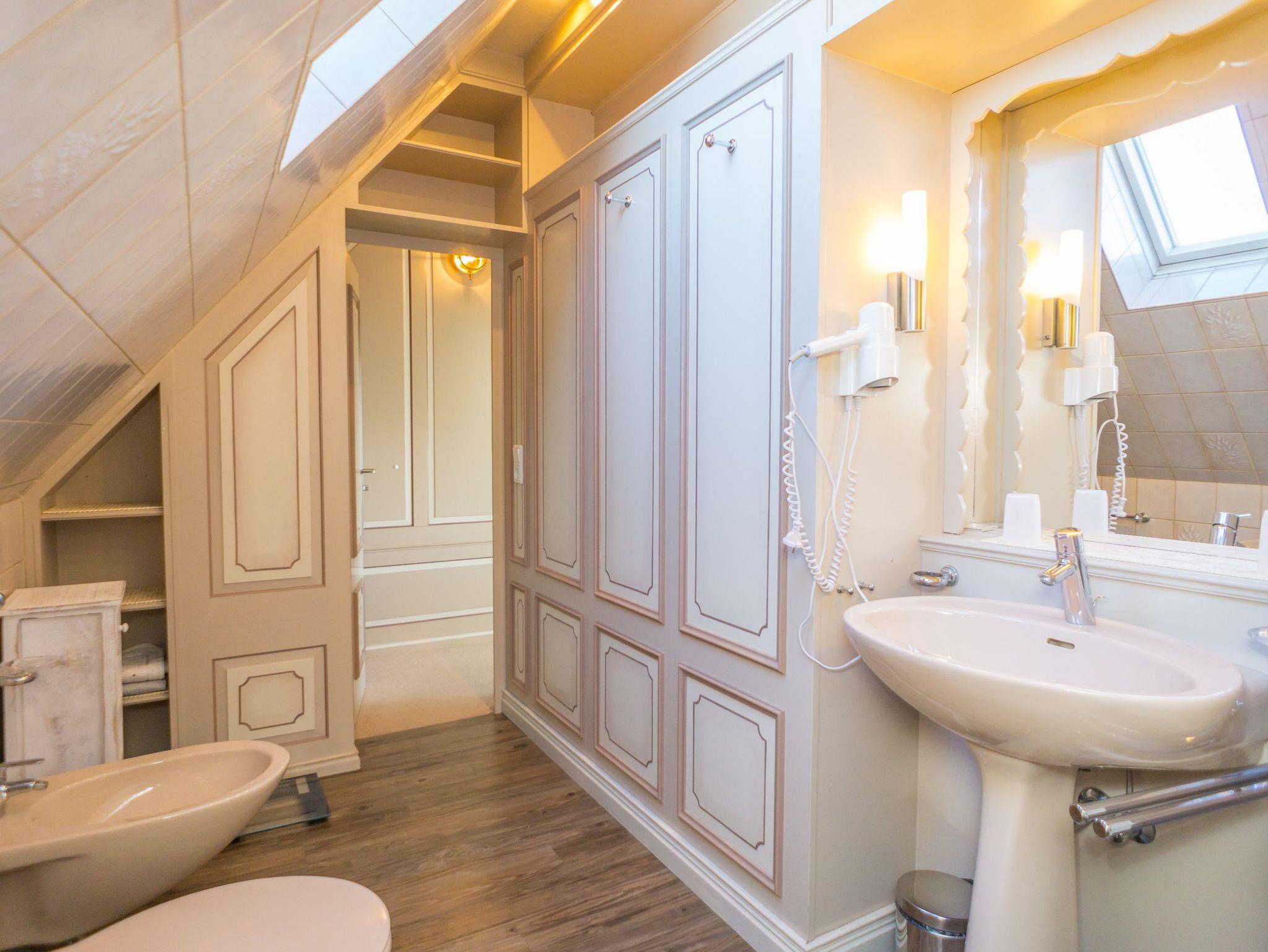 Das Schlafzimmer ist mit einem Doppelbett (Liegefläche 180 x 200 cm, bestehend aus zwei Einzelmatratzen) eingerichtet und sorgt so für erholsamen Schlaf. Über eine Treppe gelangen Sie in das Dachgeschoss, wo ein weiteres, elegant gestaltetes Badezimmer mit Badewanne, WC, Bidet und Waschtisch auf Sie wartet.