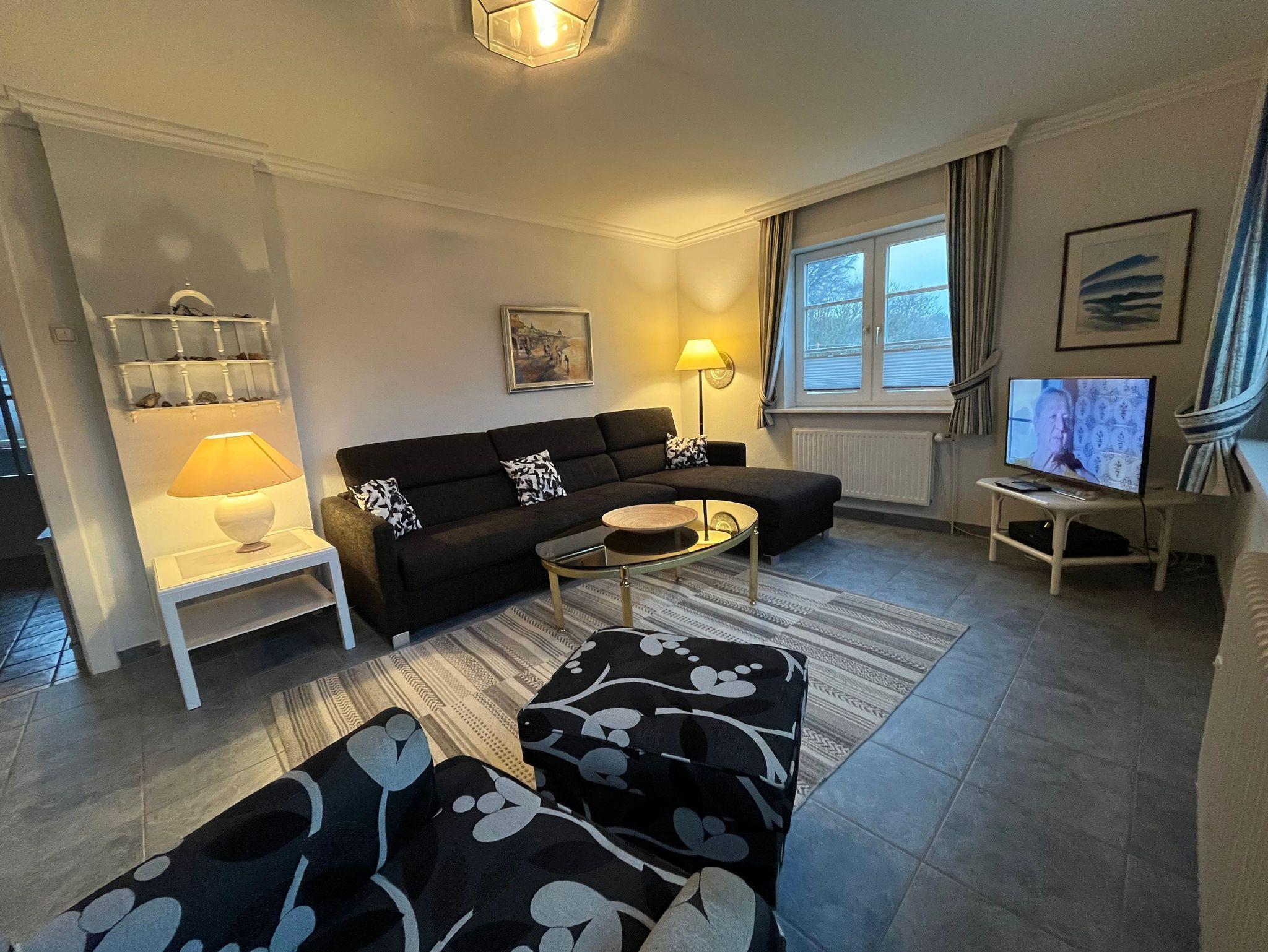 Ein Wohnzimmer mit Sitzgarnitur (bequeme Schlafcouch) und Flachbild- TV ist der Mittelpunkt der Wohnung.