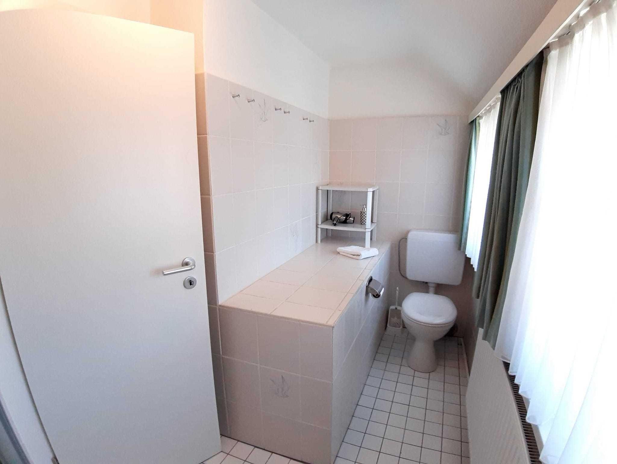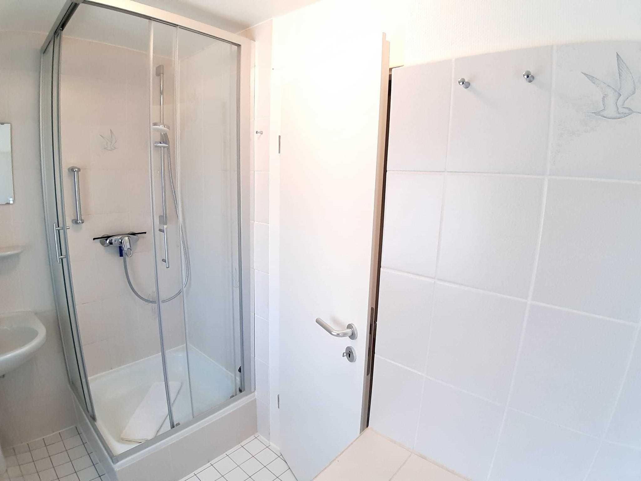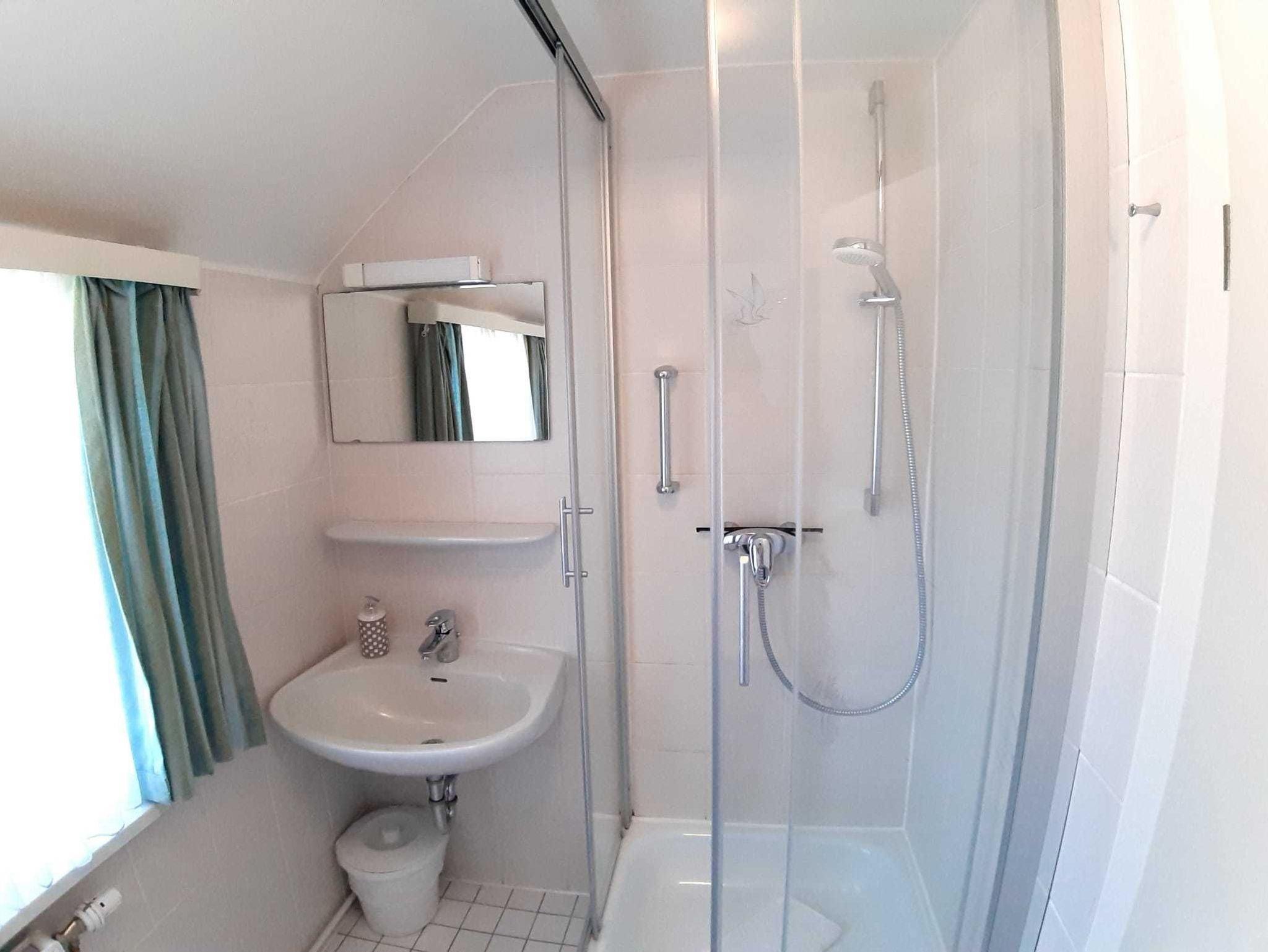Ebenfalls im Obergeschoss ein Bad mit Dusche, WC, Waschbecken, Haartrockner und Außenfenster.