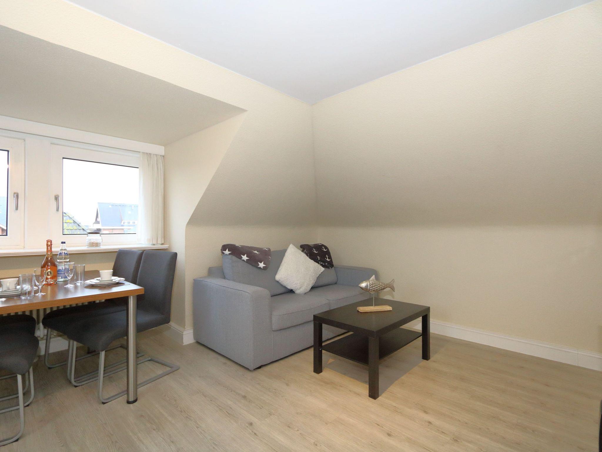 Im Wohnzimmer ist eine bequeme Schlaf-Couchgarnitur mit Clubtisch und Sessel. Eine kleine Eßecke für 4 Personen schließt sich daran an.