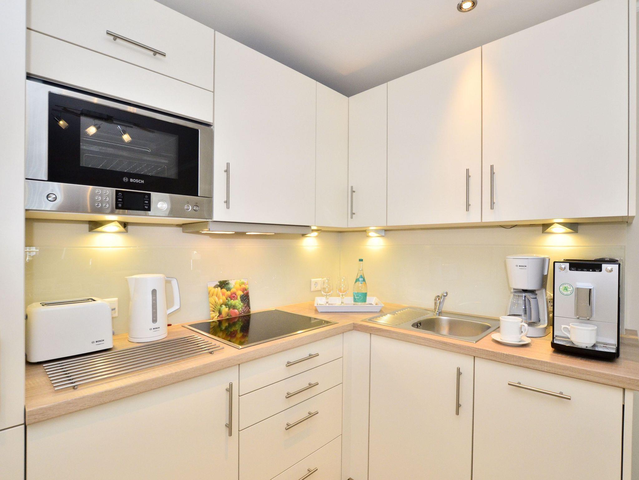 Die separate Küche ist funktional und stilvoll ausgestattet: Sie verfügt über ein Ceranfeld, einen Geschirrspüler, eine Espressomaschine sowie einen Kühlschrank. Kaffeemaschine, Wasserkocher und Toaster sind ebenfalls vorhanden.
