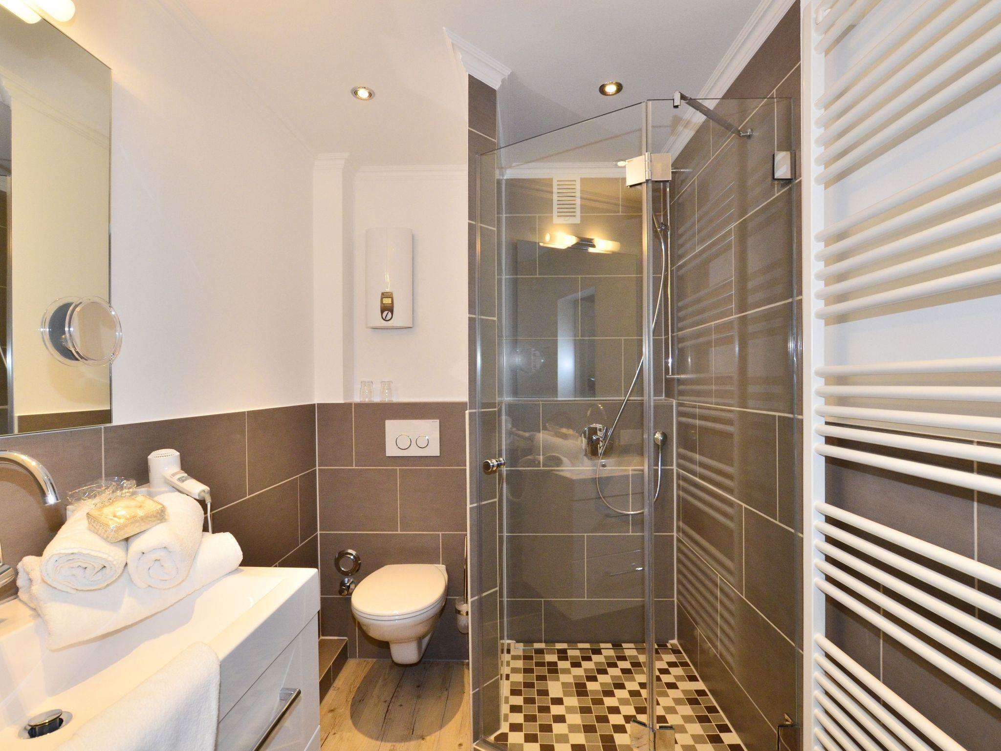Das moderne Badezimmer verfügt über eine Dusche, ein WC und einen stilvollen Waschtisch.