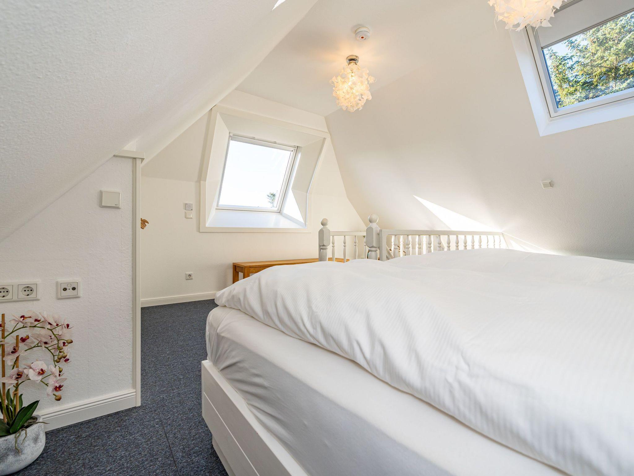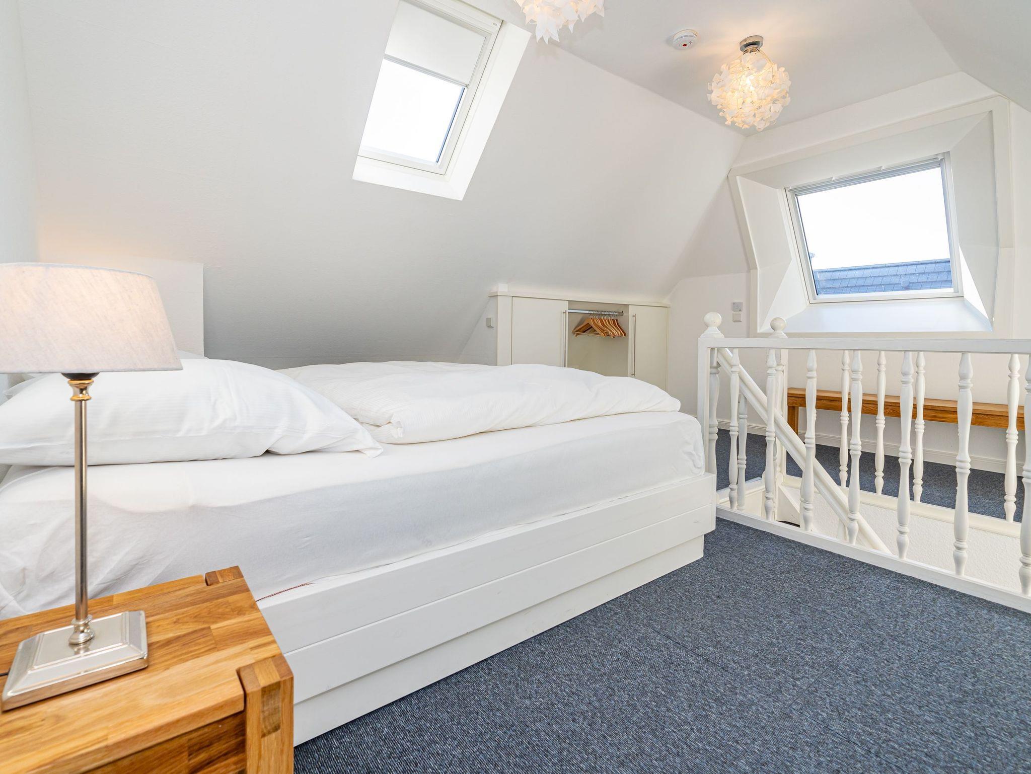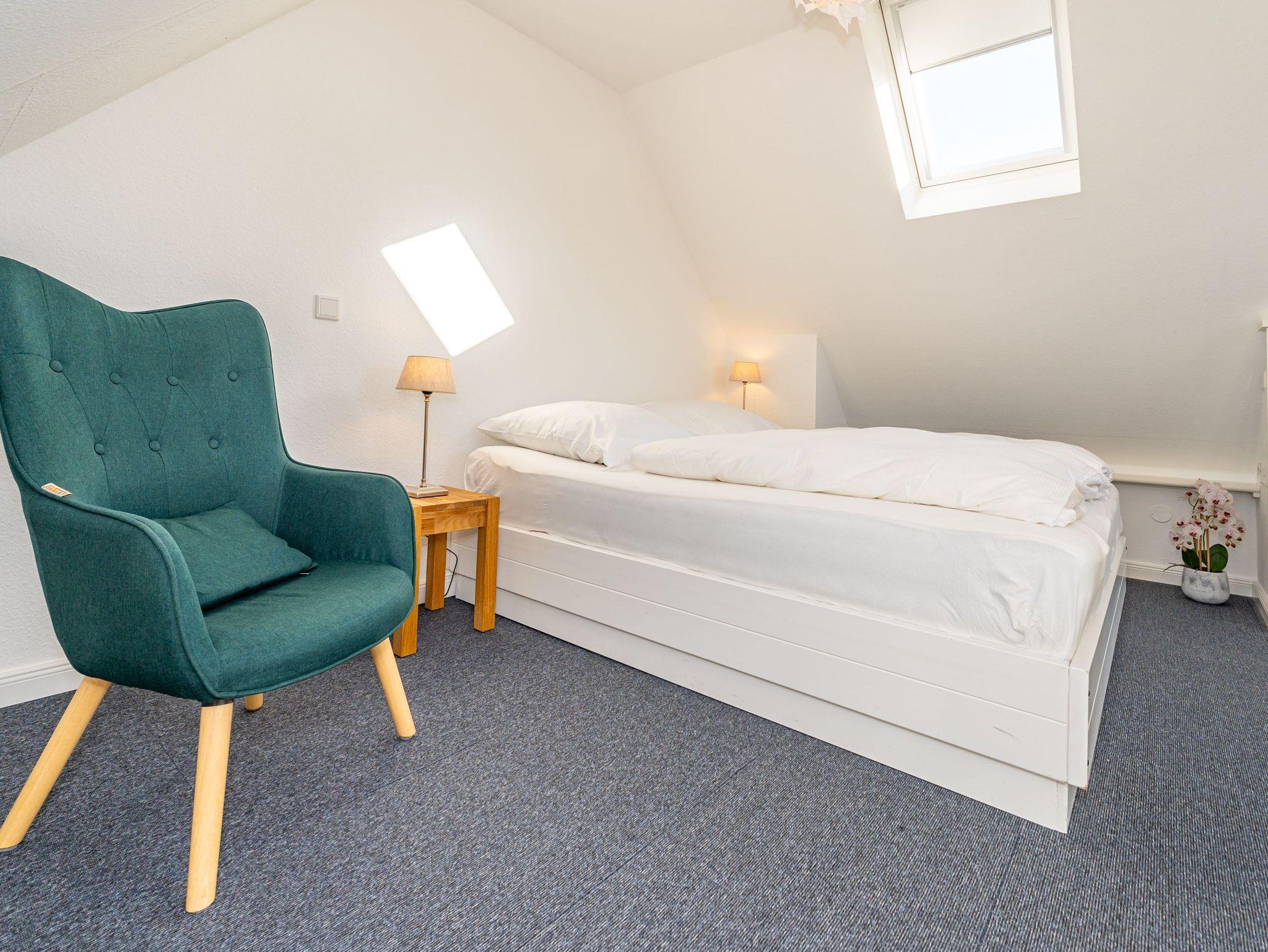 Das Schlafzimmer ist mit einem guten Doppelbett (durchgehende hochwertige Kaltschaummatratze, Liegefläche 1,80 x 2,00 m), Kleiderschrank und mit einer kleinen Sitzecke mit einem Sessel eingerichtet. Die Wohnung bietet teilweise Dünenblick.