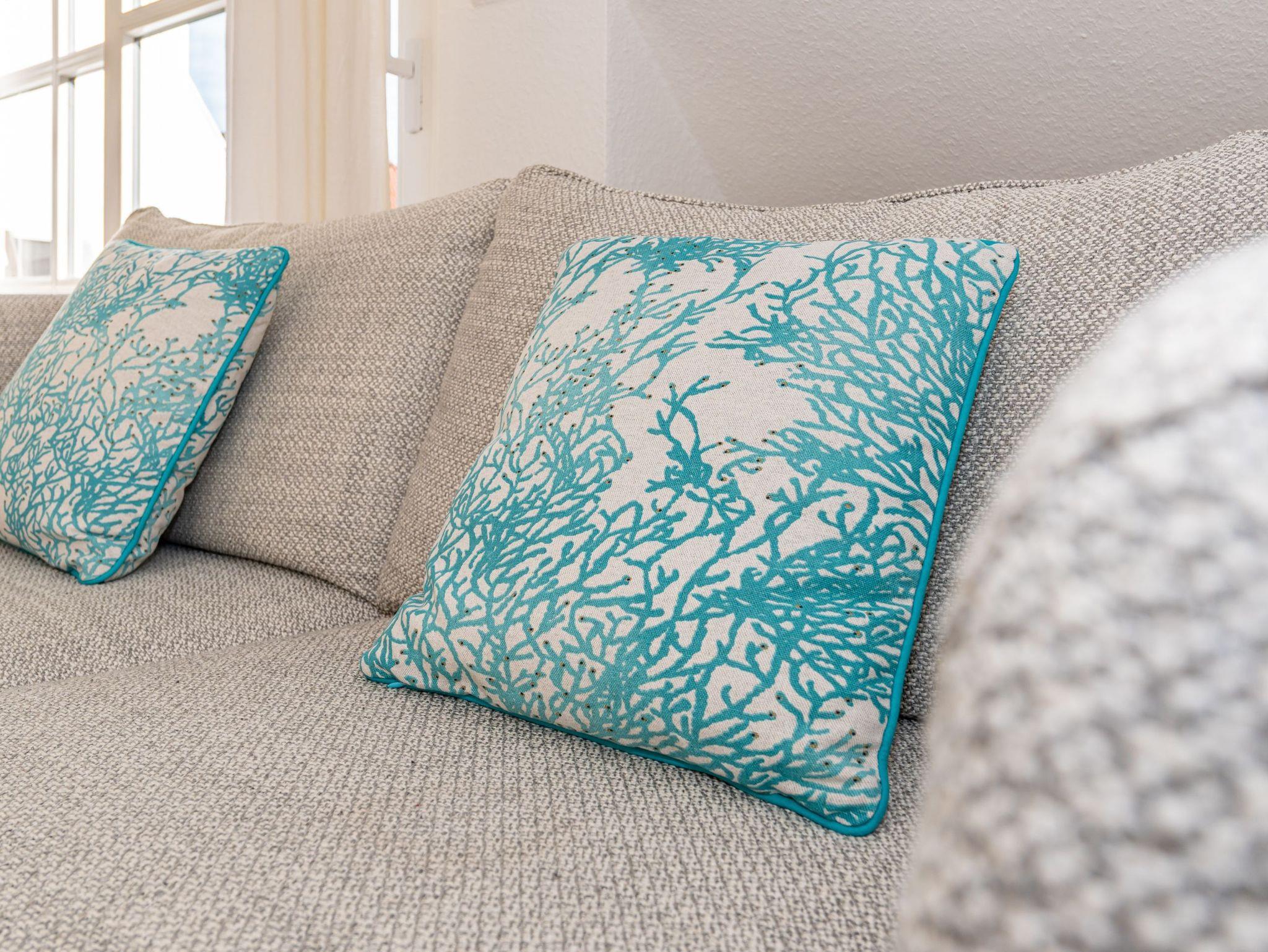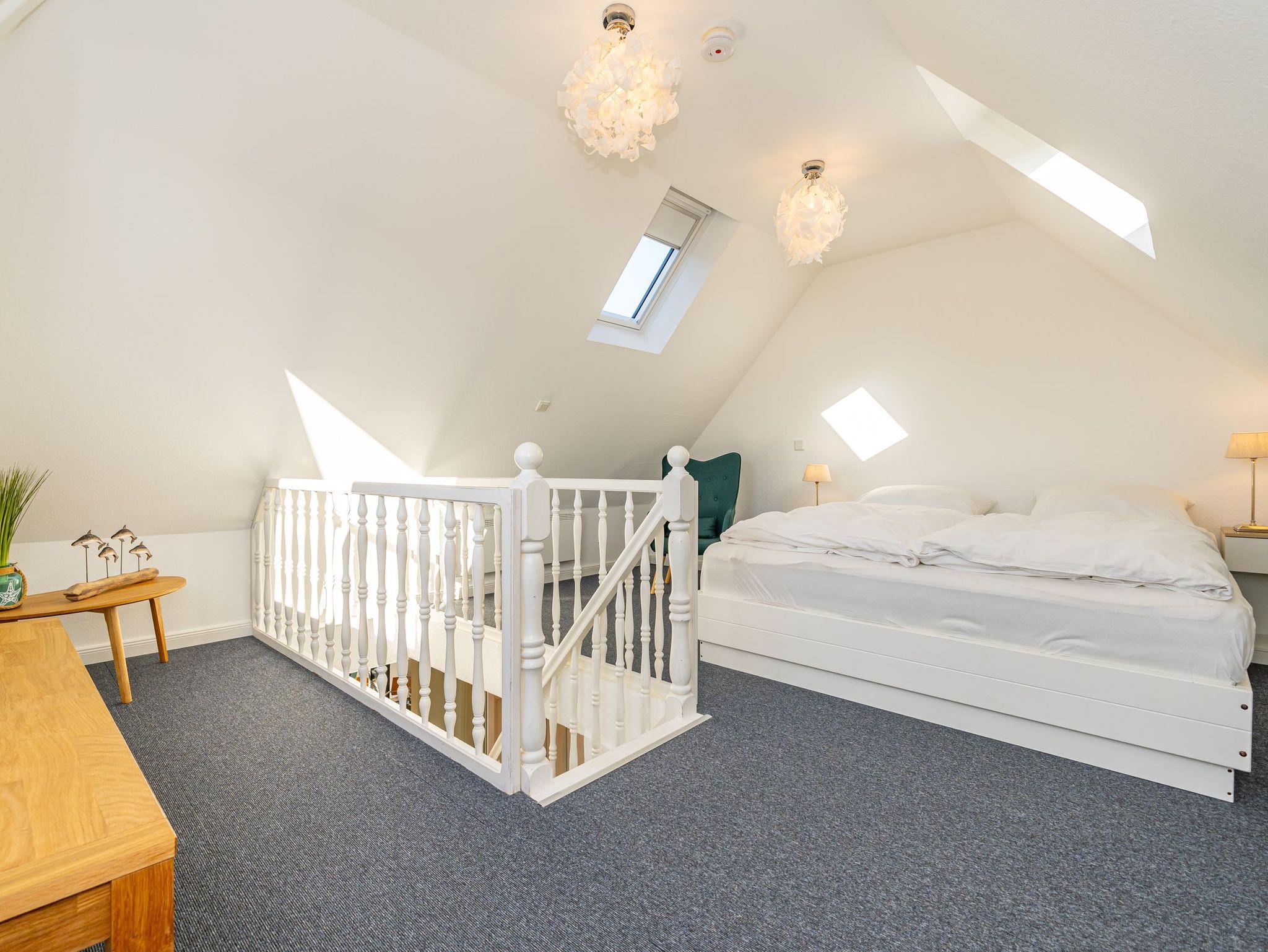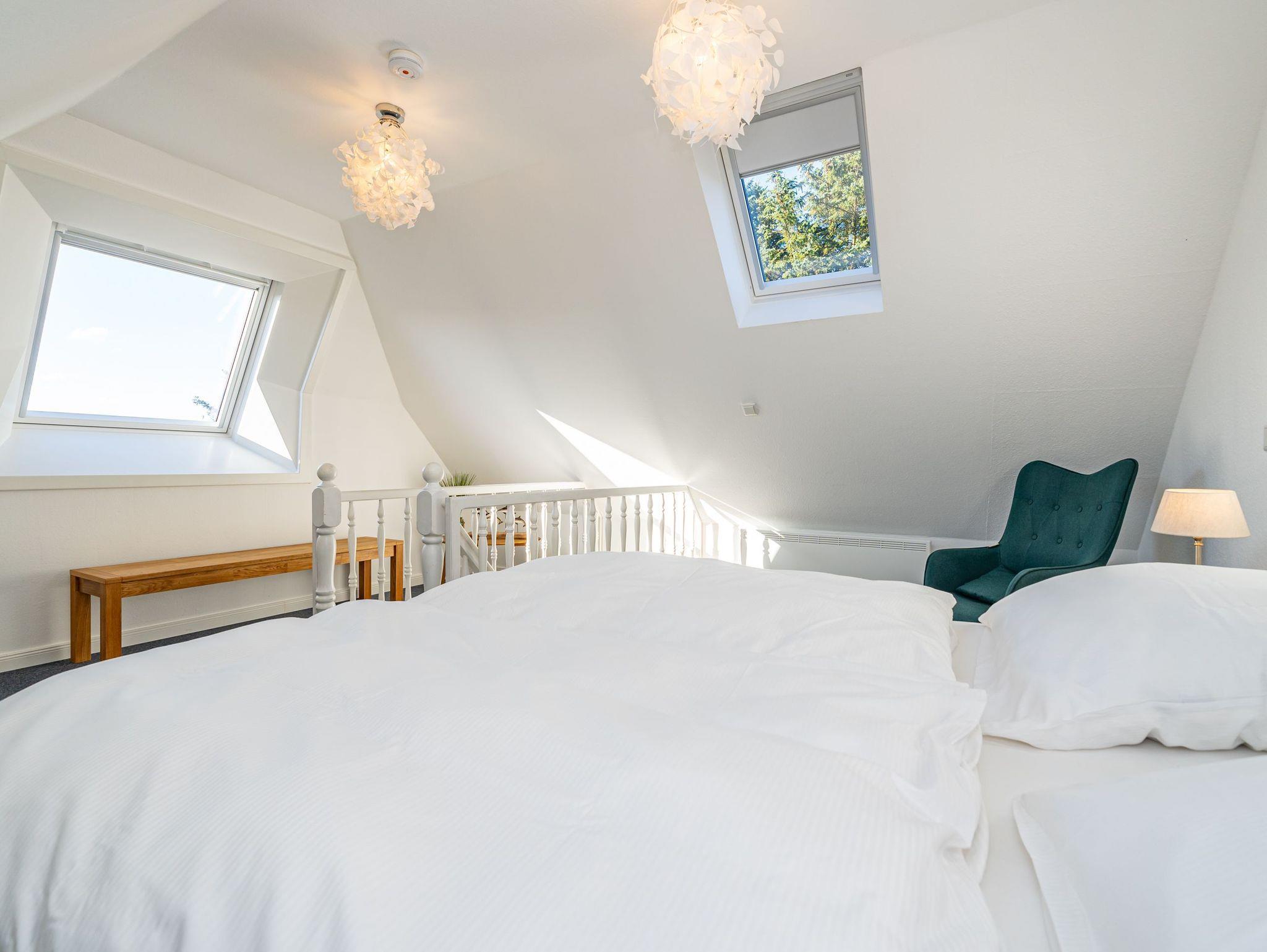 Das Schlafzimmer ist mit einem guten Doppelbett (durchgehende hochwertige Kaltschaummatratze, Liegefläche 1,80 x 2,00 m), Kleiderschrank und mit einer kleinen Sitzecke mit einem Sessel eingerichtet. Die Wohnung bietet teilweise Dünenblick.