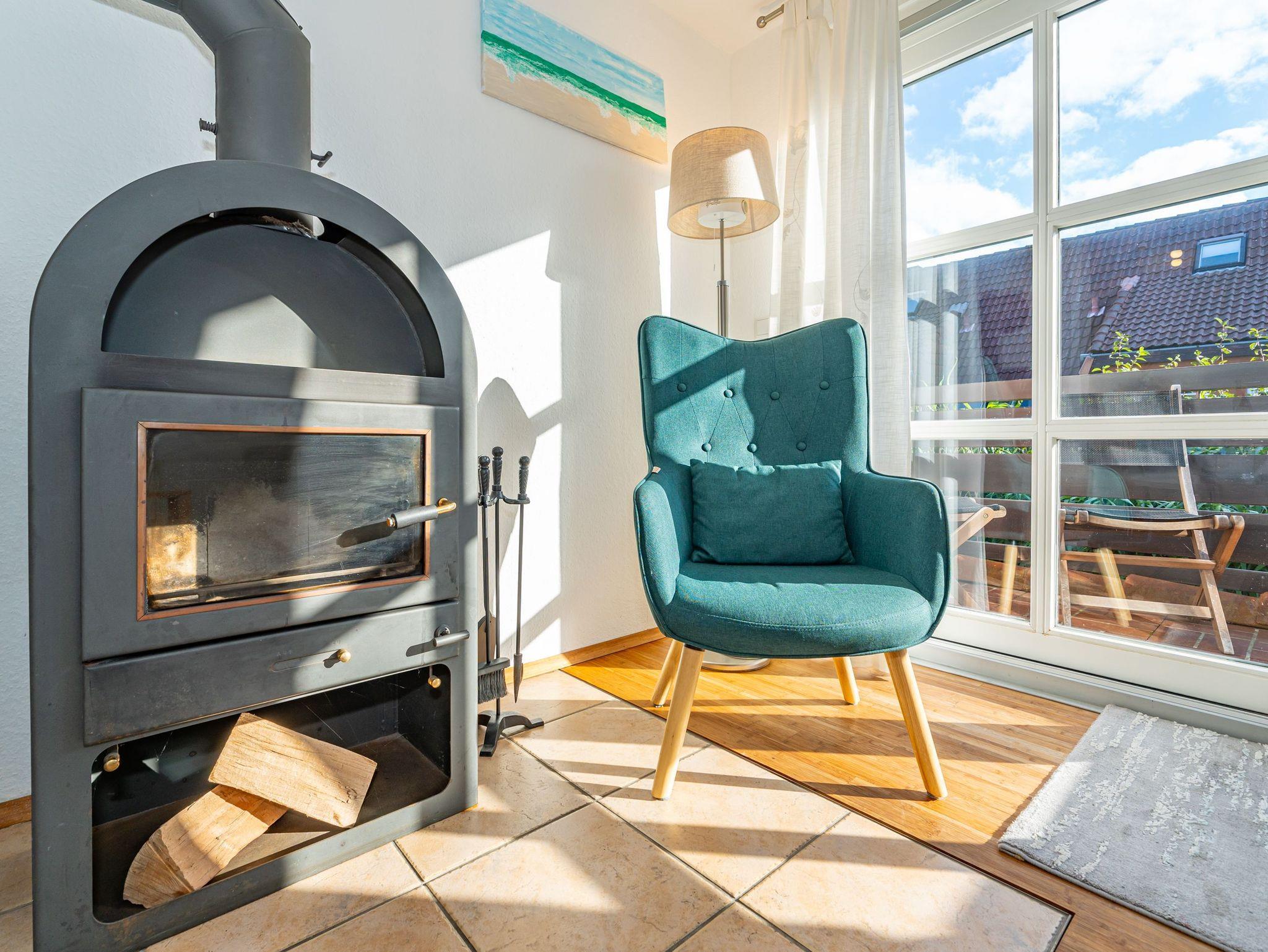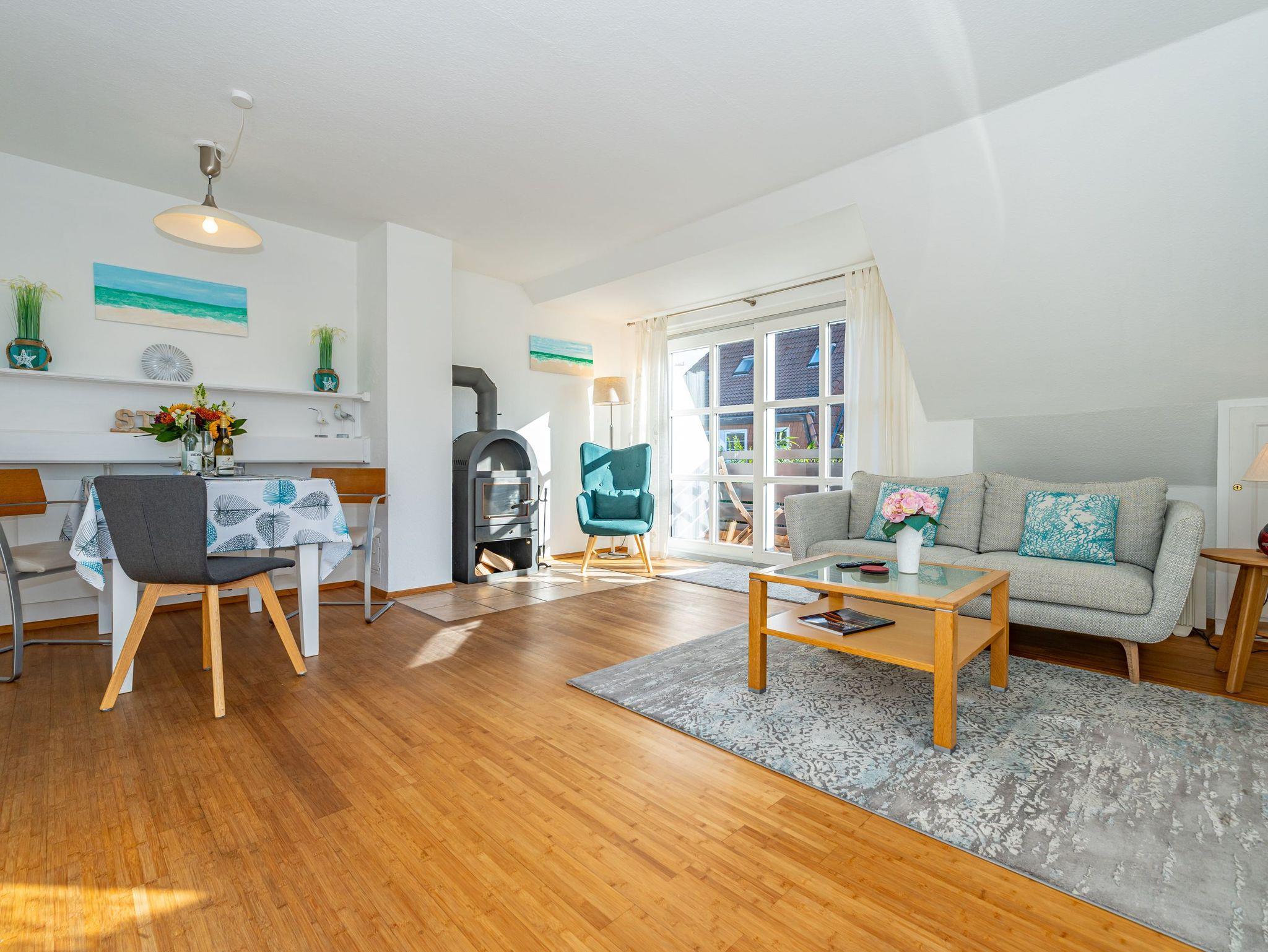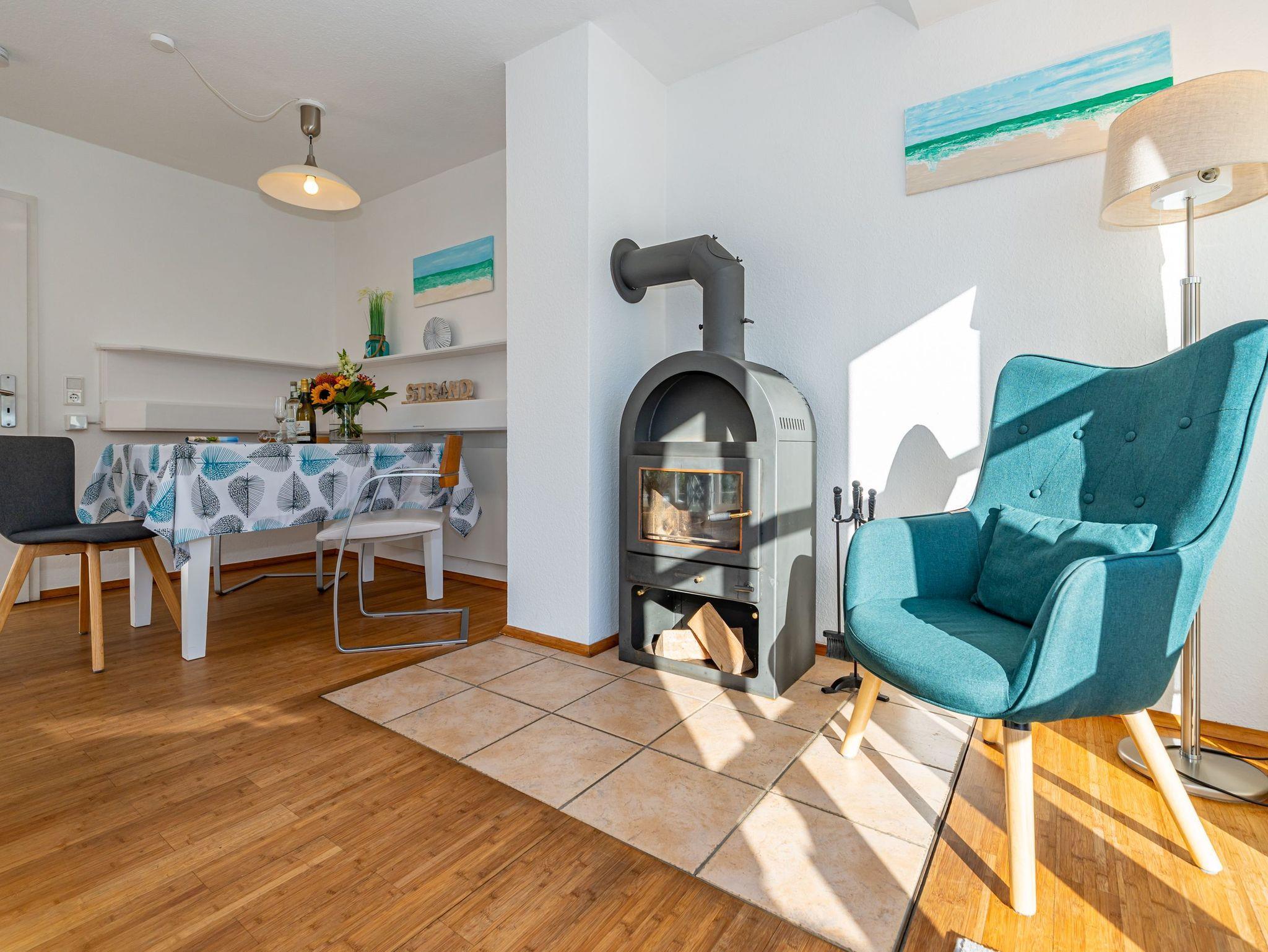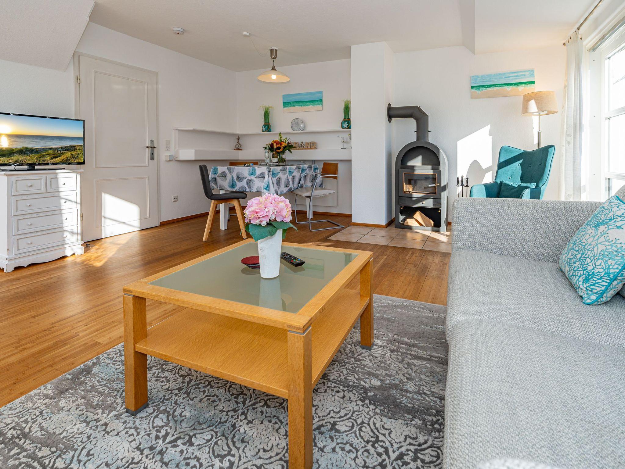 Moderne 2-Zimmer-Ferienwohnung in Westerland mit Südbalkon, Kamin und eigenem Stellplatz, nur 400 m vom Strand entfernt.
