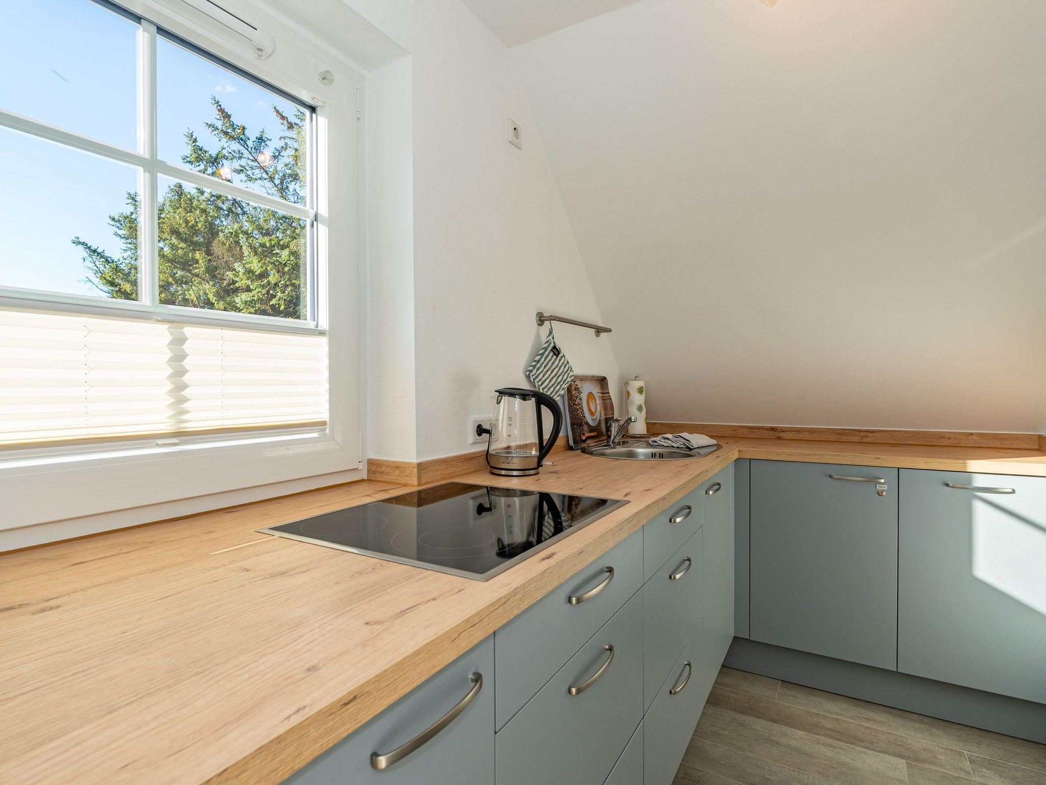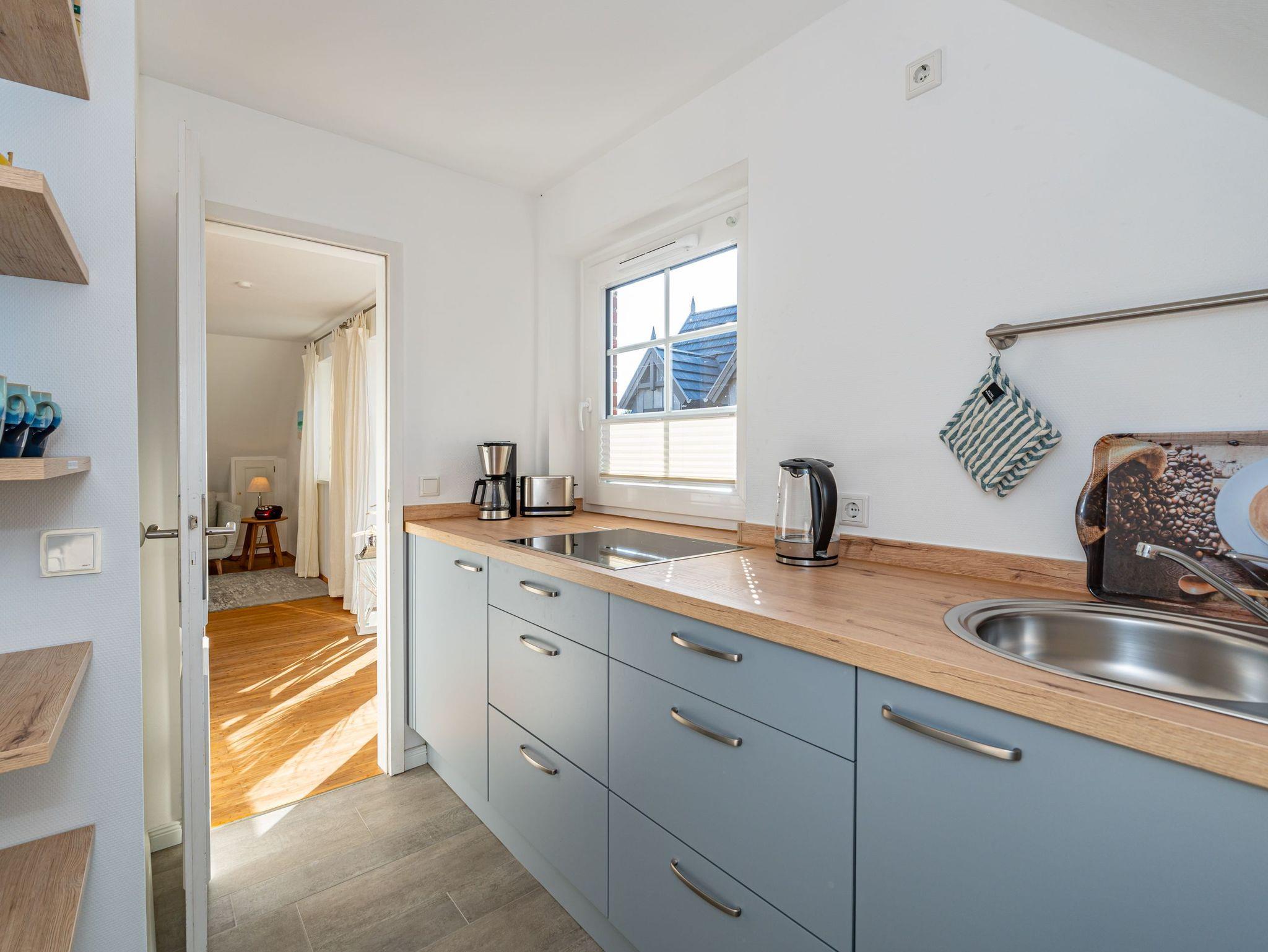 Die separate Einbauküche besitzt einen Geschirrspüler, ein Ceranfeld, eine Mikrowelle und einen Kühlschrank (ohne Gefrierfach). Kaffeemaschine, Wasserkocher und Toaster gehören zur Grundausstattung.