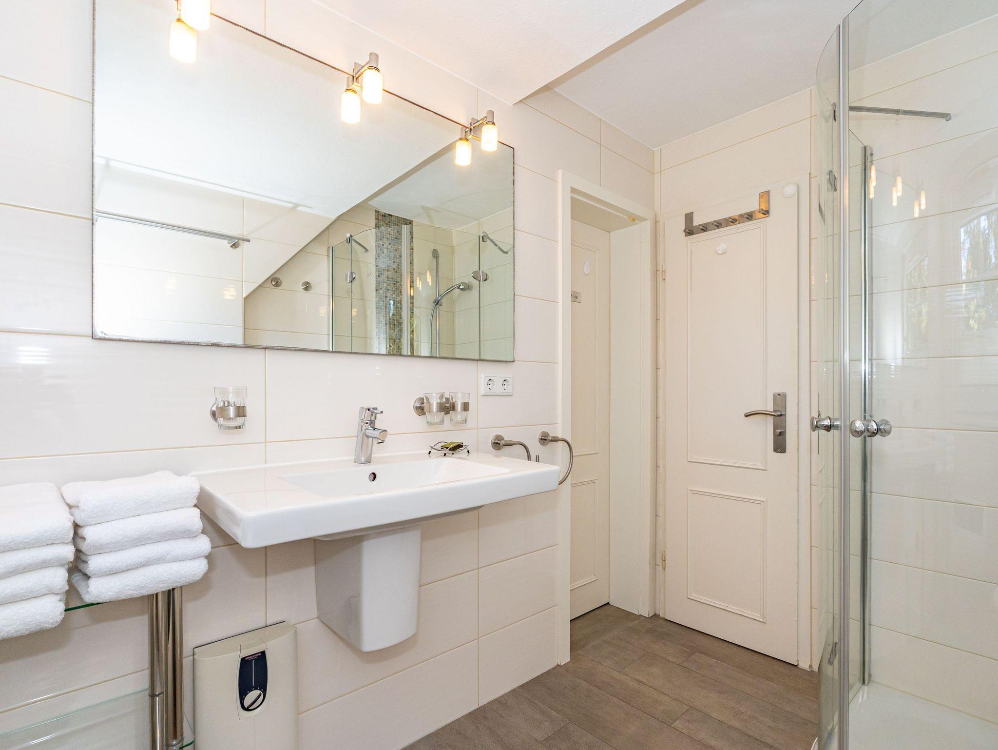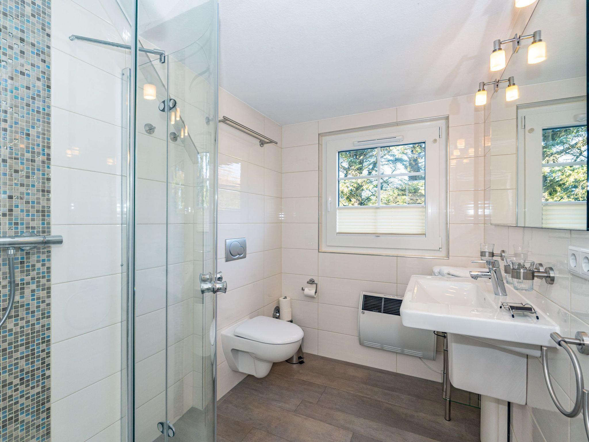Das Badezimmer mit Fenster ist mit einer Dusche und WC, Waschtisch, Fön und Kosmetikspiegel ausgestattet.