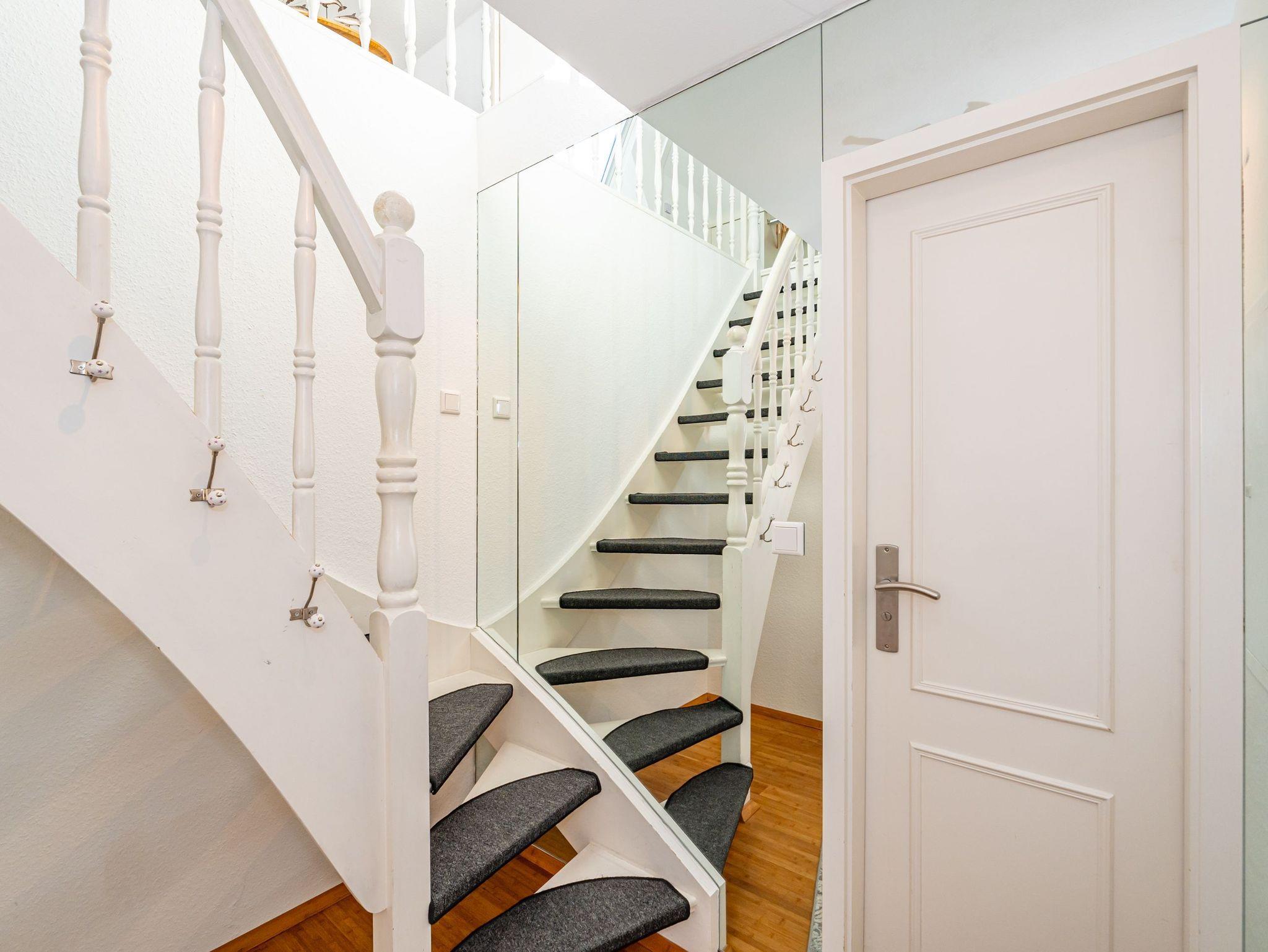 Vom Vorflur mit Garderobe gelangt man in das Wohnzimmer (mit Austritt zum Südbalkon und Blick in die angrenzenden Gärten), das Duschbad/WC und über eine Treppe in das Schlafzimmer.