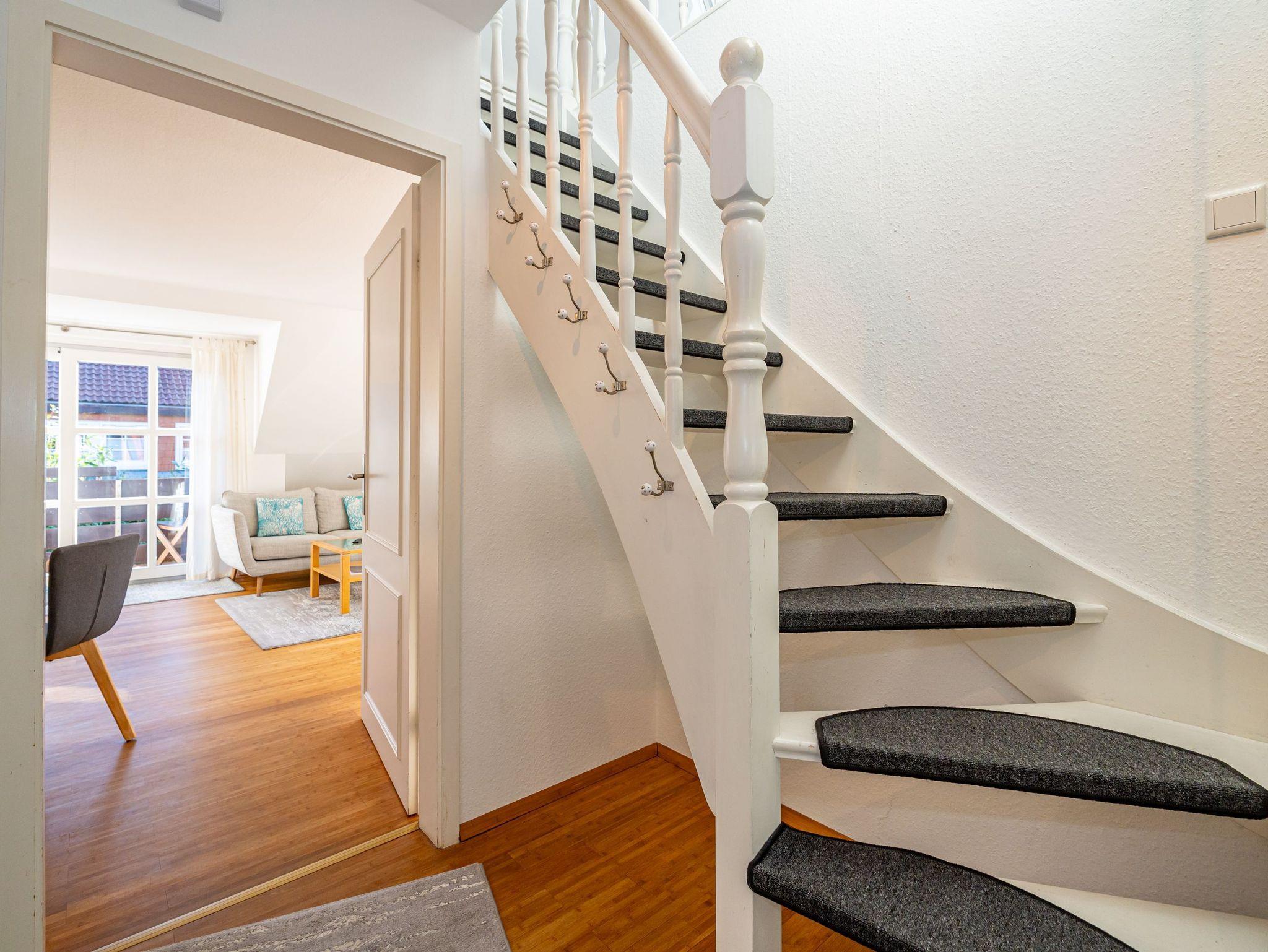 Hochwertig ausgestattete lichtdurchflutete 2-Zimmer-Nichtraucher-Ferienwohnung, Wohnen auf 2 Ebenen, ca. 65 qm im 1. OG mit Balkon und Balkonmöbeln für max. 2 Personen.