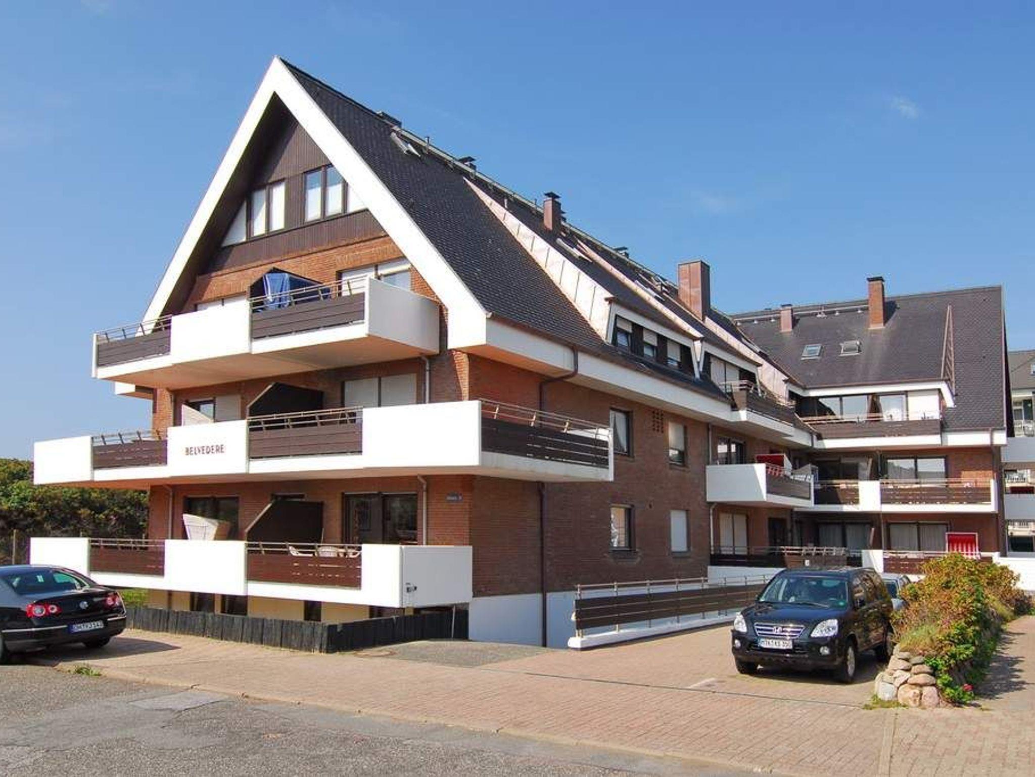 2-Zimmer-Ferienwohnung im 1.OG des Haus Belvedere. Ca. 56m². Nichtraucher-Appartement. Wohnzimmer mit vorgelagertem Ostbalkon mit Strandkorb, Doppelschlafcouch und Sessel, Essplatz für 4 Personen, Kabel-TV, Radio, W-Lan (ohne Gewähr), Telefon. Hübsche Küche im Wohnzimmer mit Backofen, Mikrowelle und Geschirrspüler. Duschbad/WC. Schlafzimmer mit Doppelschrankbett. Tierhaltung verboten. Nichtraucher-Appartement! Bettwäsche und Handtücher sind zur Anreise aufgezogen! Es ist kein PKW-Stellplatz vorhanden.