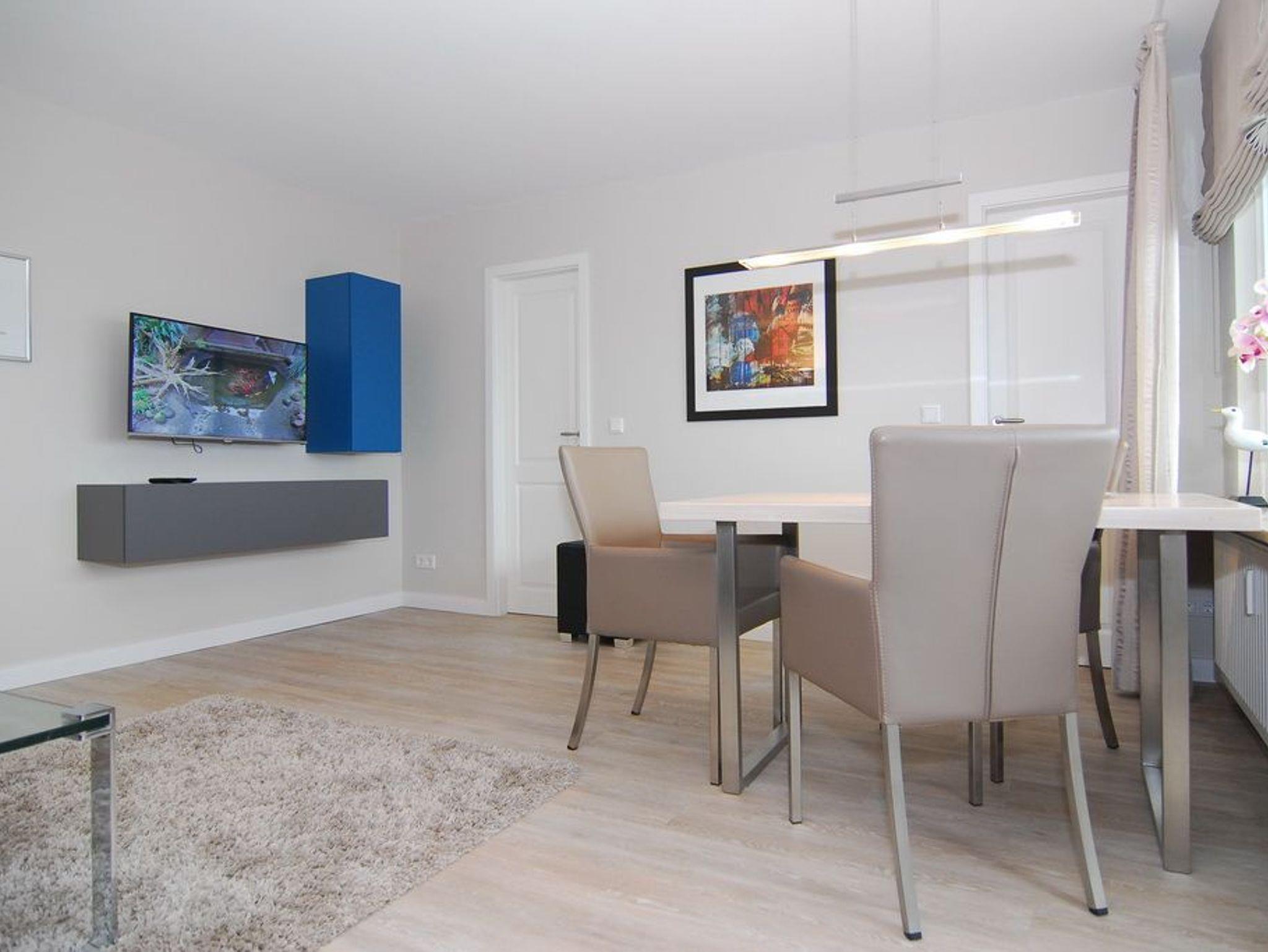 Exklusives 2-Zimmer-Apartment zur Seeseite im Haus Atlantik, ca. 55 m², 4. OG, für max. 2 Personen und 1 Kind,[nbsp][nbsp]Nichtraucher. Wohnzimmer mit Couchecke und Sessel, Essplatz am Fenster mit Blick auf das Meer, Flat-TV, DVD, Stereoanlage mit Ipodstation, W-LAN (ohne Gewähr), Westbalkon mit Balkonmöbel, Schlafzimmer mit Doppelbett (180x200 ), Einbauschrank und Flat-TV, kleine Küche mit Geschirrspüler, Mikrowelle sowie einem Ceranfeld mit zwei Kochfeldern, Duschbad/WC. Das Appartement ist mit Design-Fußboden ausgelegt. Tierhaltung ist nicht gestattet. Bettwäsche und Handtücher sind zur Anreise aufgezogen. PKW-Stellplatz kann kostenpflichtig bestellt werden.