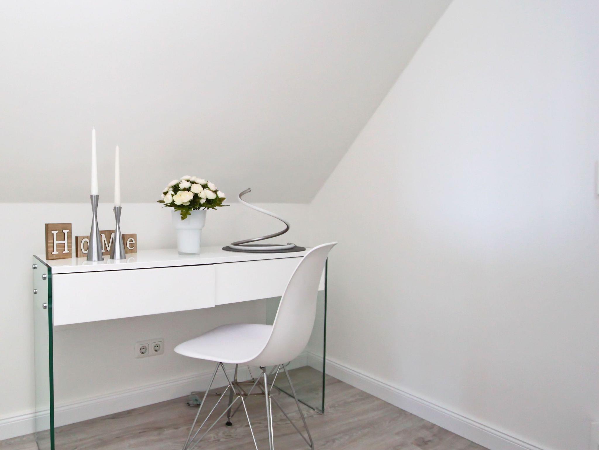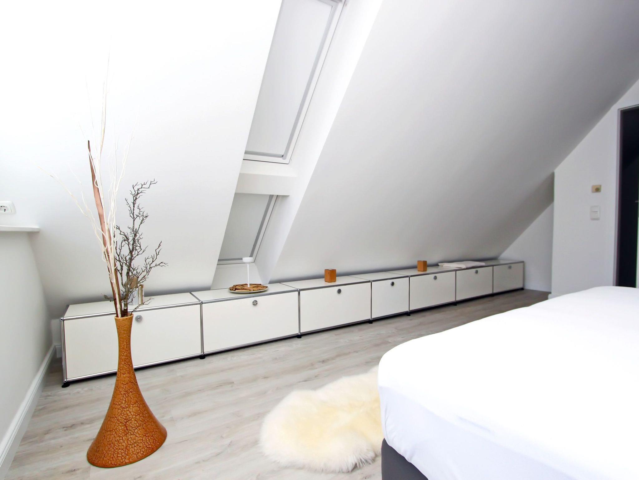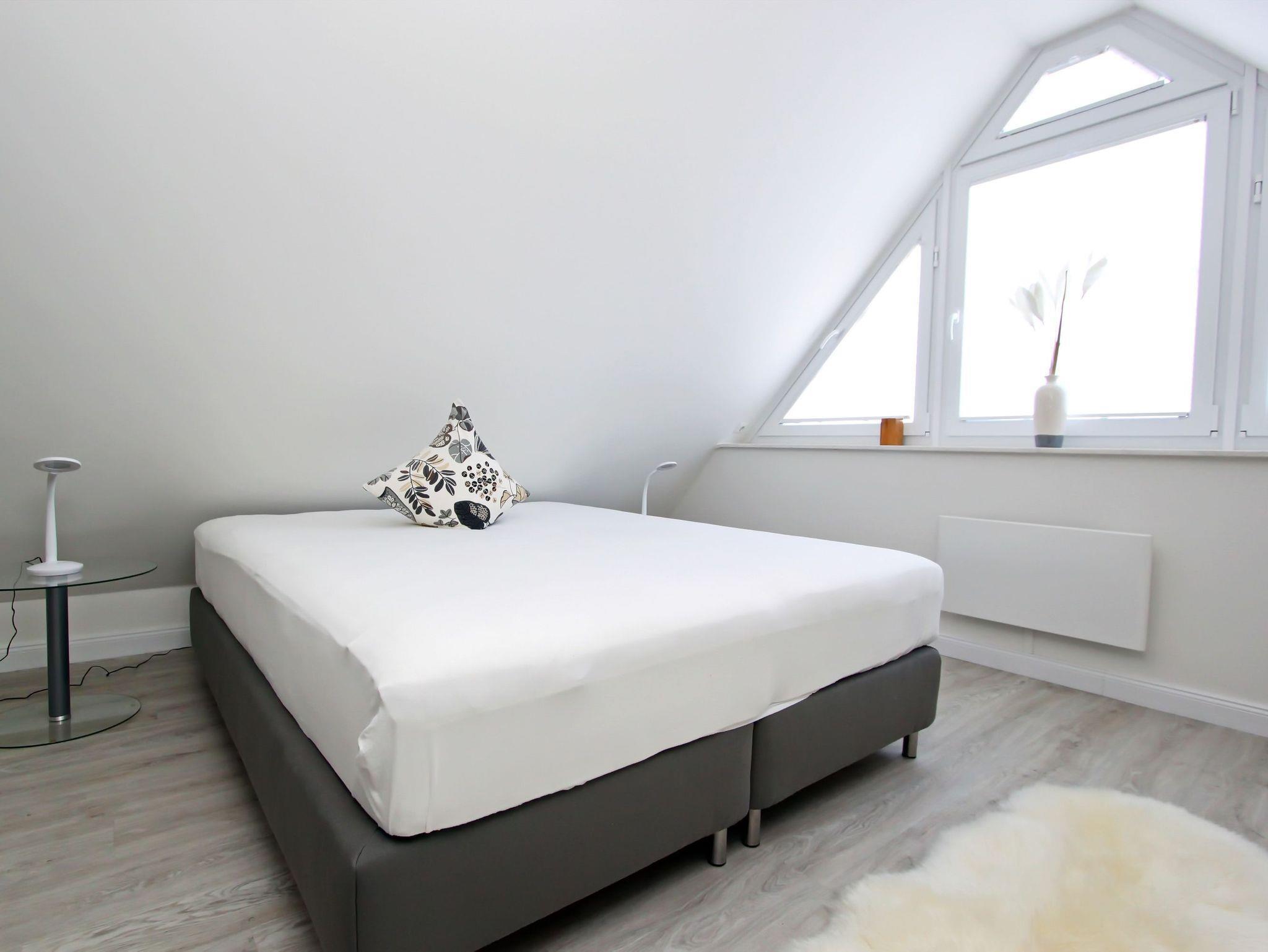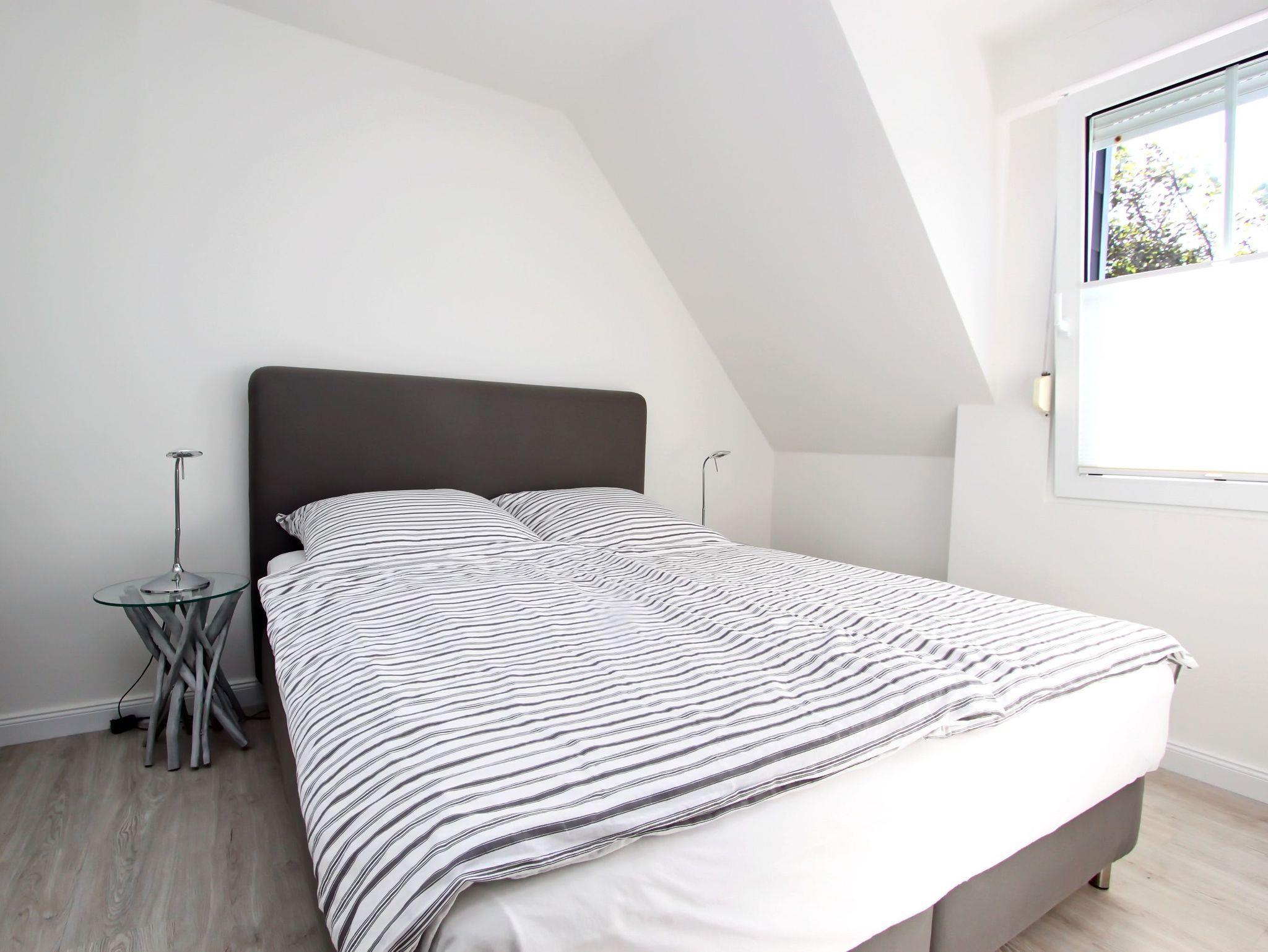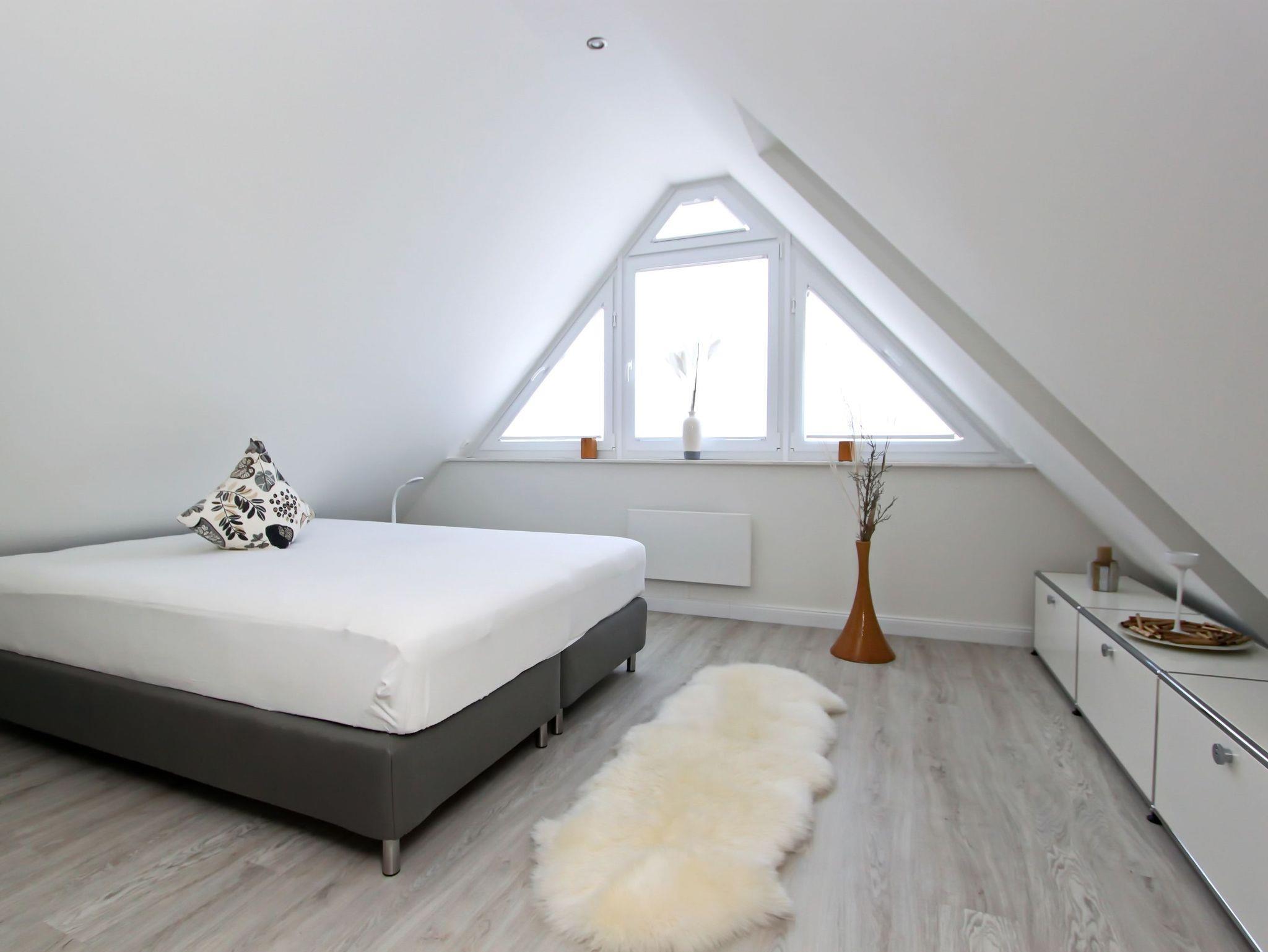 Das separate Schlafzimmer verfügt über ein Doppelbett, Nachttische, Flatscreen-TV und einem großen Kleiderschrank, der ausreichend Stauraum bietet. Flur mit kleinem Schreibtisch und Garderobe. Duschbad/WC mit ebenerdiger Dusche. Über eine Treppe gelangen Sie ins Dachgeschoss. Dort ist ein weiteres Schlafzimmer mit einem Doppelbett, Nachttische, Flatscreen-TV, Einbauspiegelschrank, kl. Schaukelstuhl, Tisch und viel Stauraum in den kleinen Sideboards entlang der Wand. Das Appartement ist komplett mit hochwertigen Vinyl Boden ausgelegt. Bei Anreise sind die Betten bezogen, auch Handtücher sind inklusive.