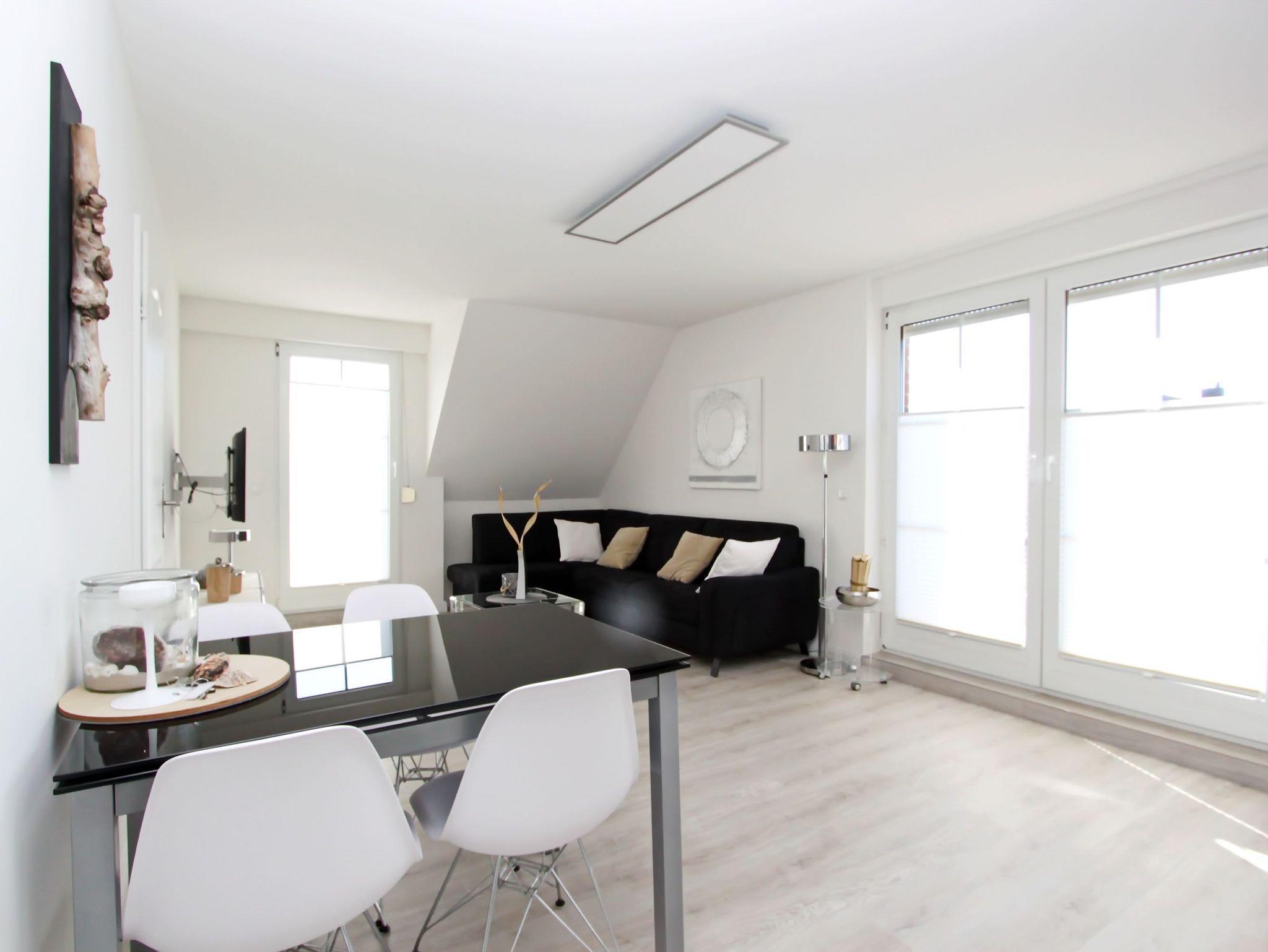 Das neuwertige, lichtdurchflutete Appartement Strandlicht (DTV****) bietet auf seinen ca. 65 qm, die sich über 2 Ebenen (OG/DG) erstrecken, ausreichend Platz für 2-4 Personen. Die moderne und gemütliche Einrichtung sowie die beiden zur Sonne ausgerichteten Süd- und Westbalkone lassen keine Wünsche offen.