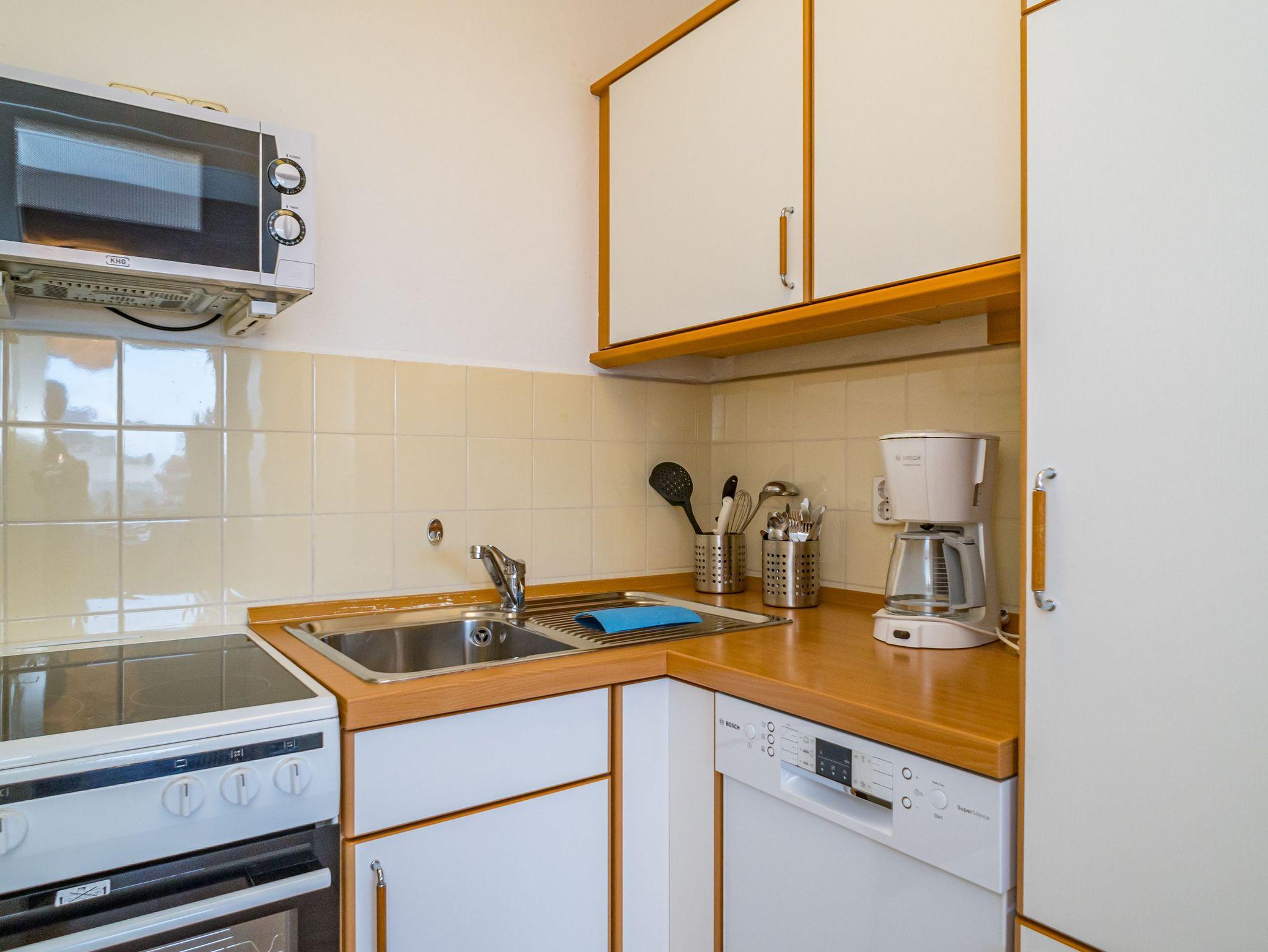 Die offene, neue Küche hat einen Herd mit Backofen und[nbsp][nbsp]Ceranfeld mit 4 Kochfeldern, einen Geschirrspüler, eine Mikrowelle und einen Kühlschrank ohne Gefrierfach.
