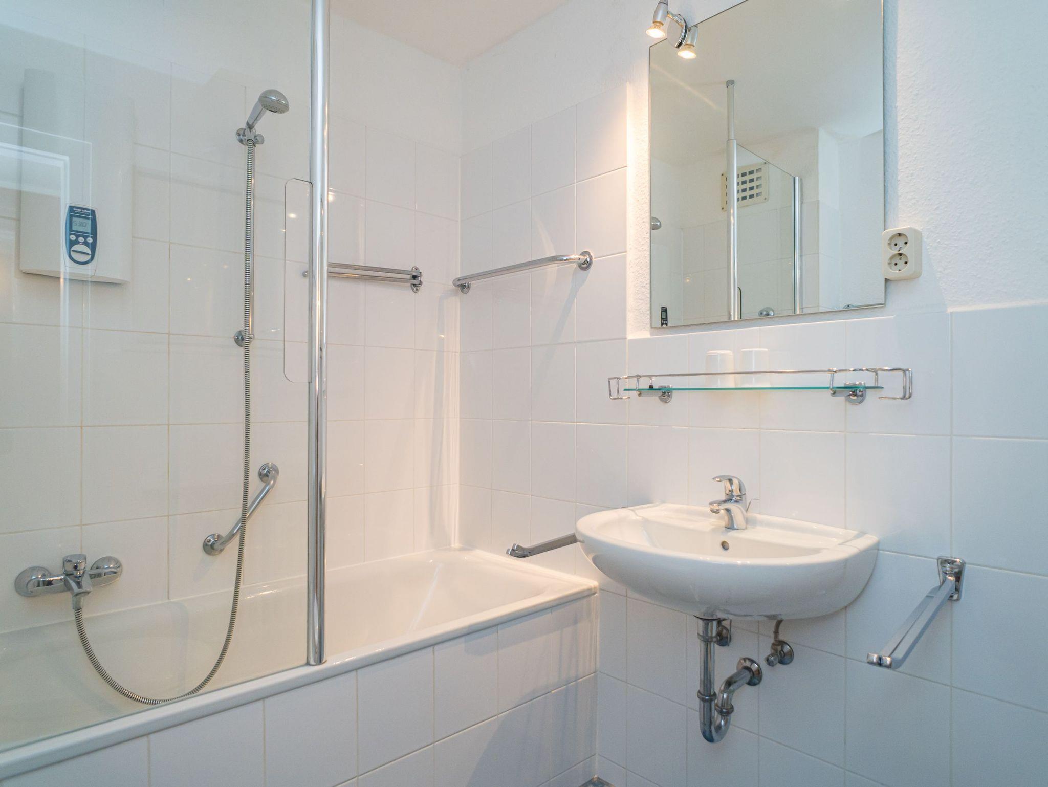 Das Badezimmer besteht aus einem Waschtisch, einer Badewanne mit Duschmöglichkeit und einem WC.