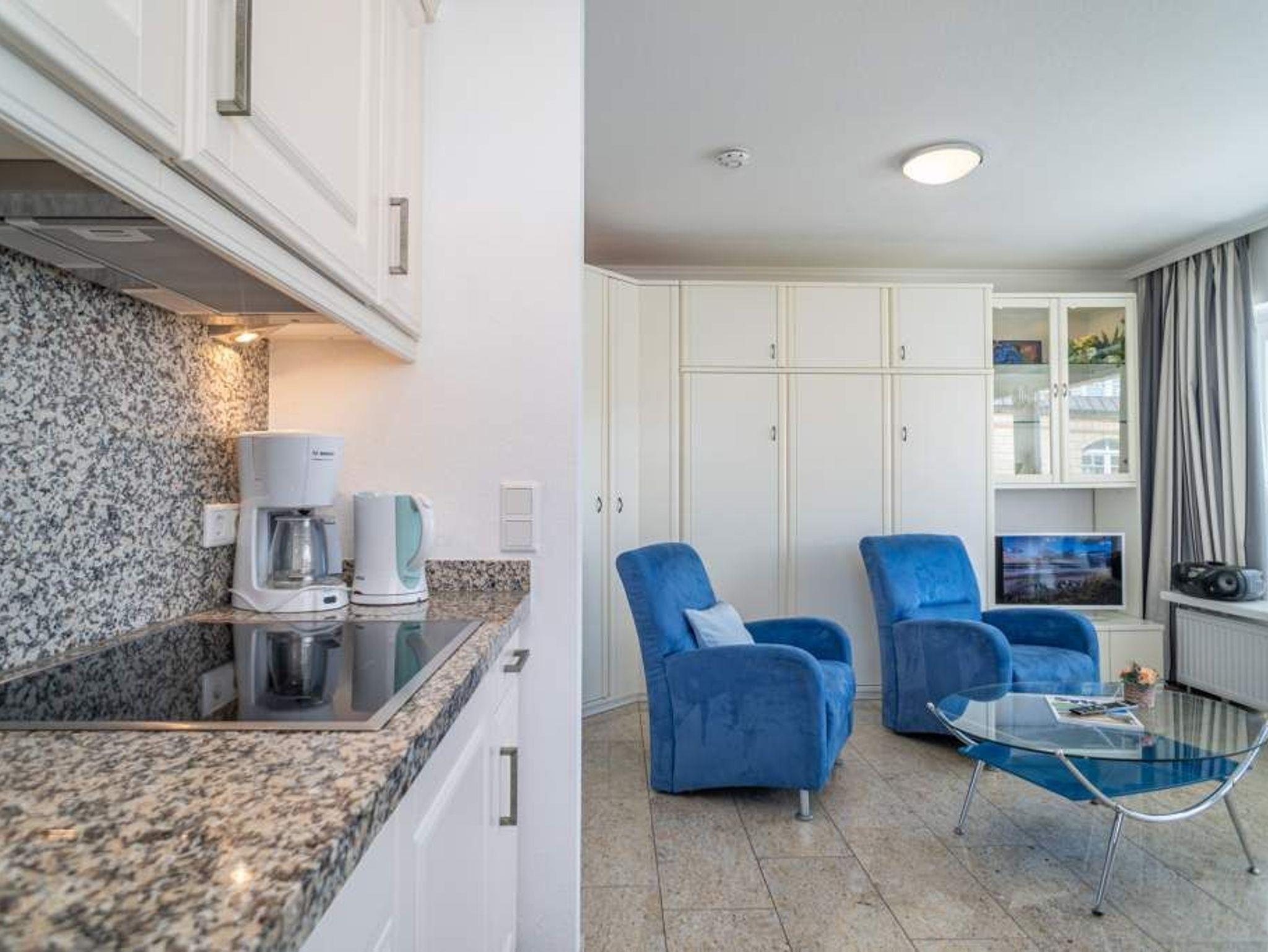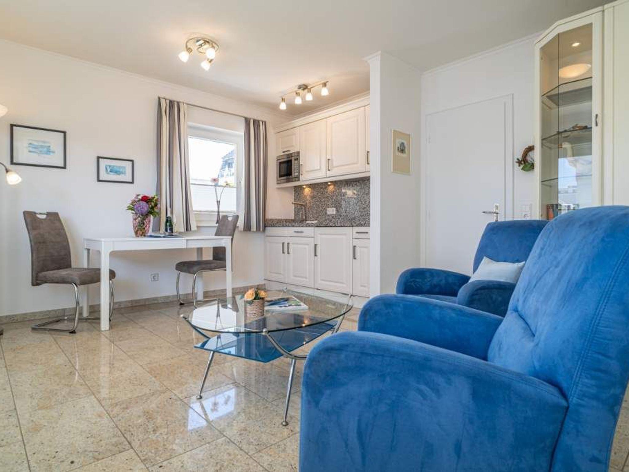 Der Wohn-/Schlafraum mit echtem, weißen Granitboden ist mit zwei gemütlichen Sesseln, einem Doppelschrankbett (mit zwei Einzelmatratzen 0,80 x 1,96 m, im Ganzen ausklappbar), einem separatem Essplatz, Kabel-Flachbild-TV, Radio/CD-Player und WLAN ausgestattet. Die neue, offene Einbauküchenzeile im Landhausstil besitzt eine Mikrowelle (mit Grillfunktion), ein Cerankochfeld und einen Kühlschrank mit 3*-Gefrierfach.