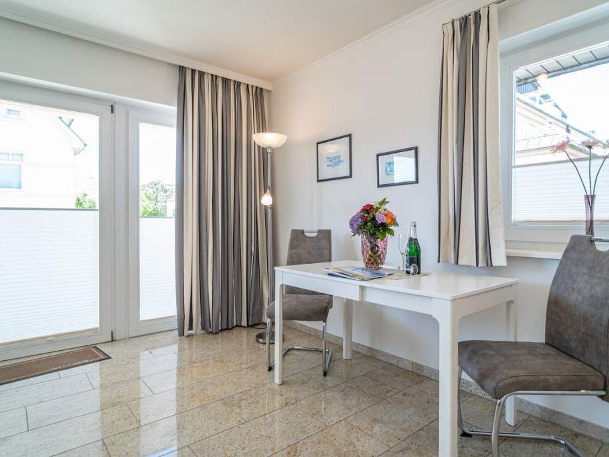 Großzügige 1-Zimmer-Ferienwohnung (ca. 32 qm) in der 1. Etage für 2 Personen mit Westloggia (Nachmittagssonne, mit Balkonmöbeln und Auflagen) und eigenem PKW-Stellplatz in der Tiefgarage.