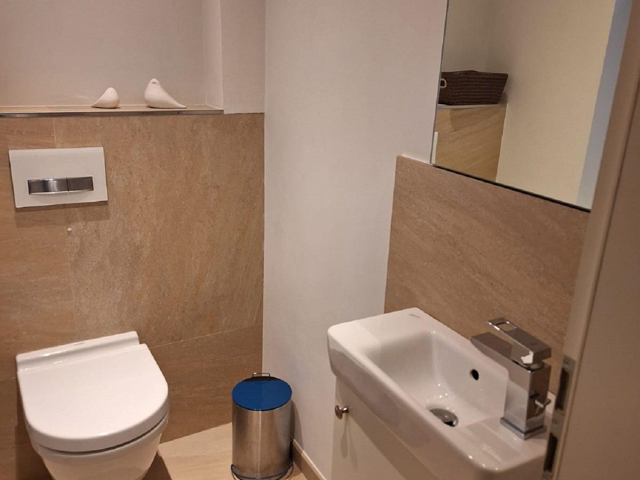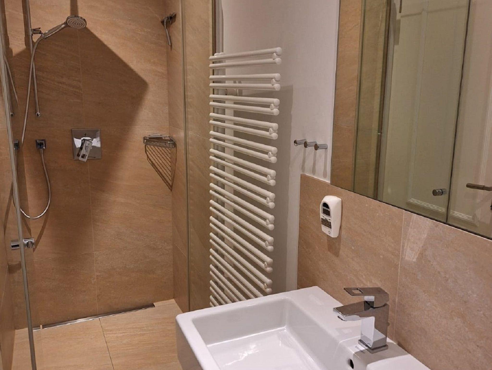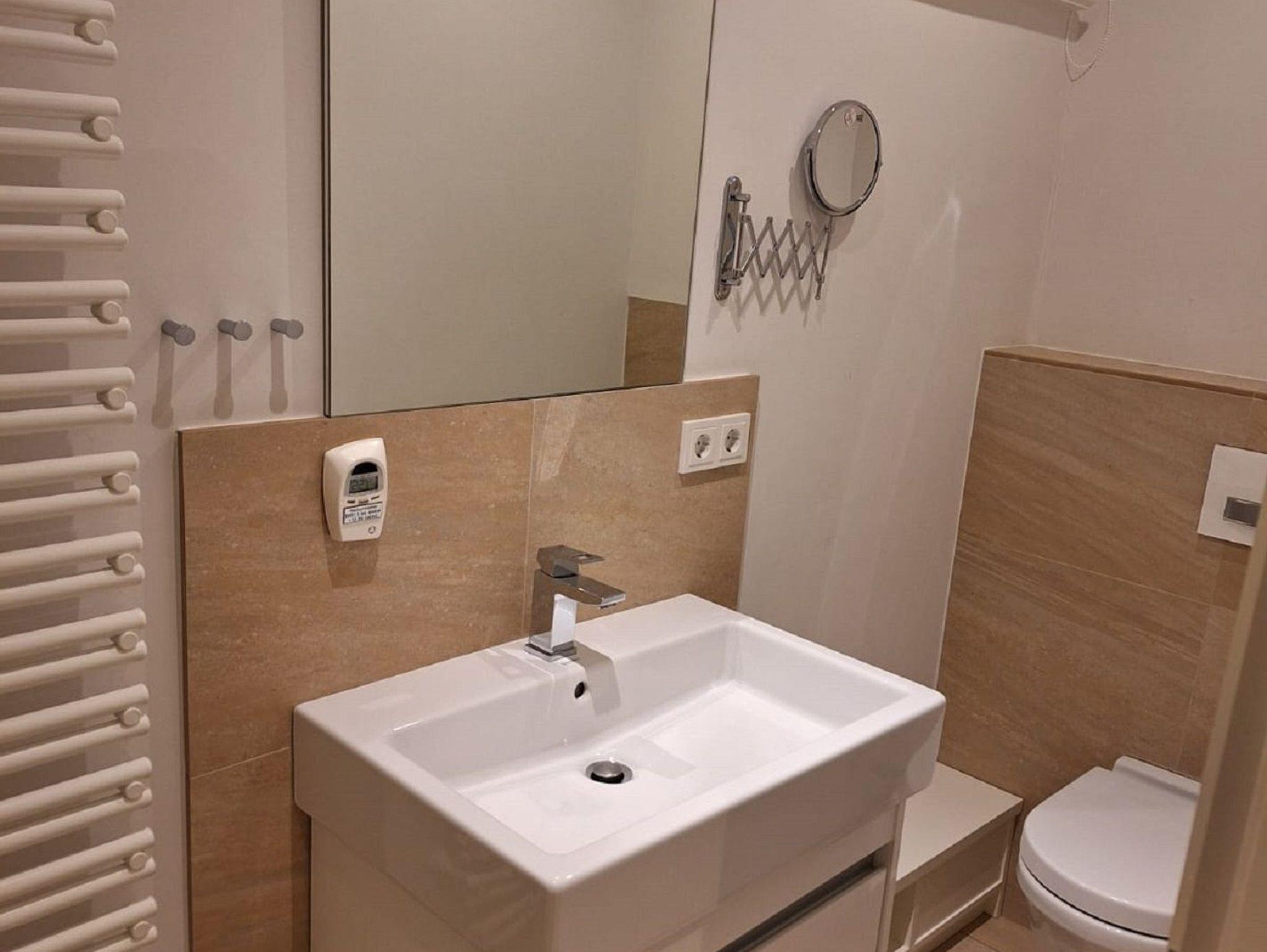Das neue Bad lässt mit moderner Regendusche, Fön, Kosmetikspiegel, Waschtisch, Handtuchwärmer und WC keine Wünsche offen.