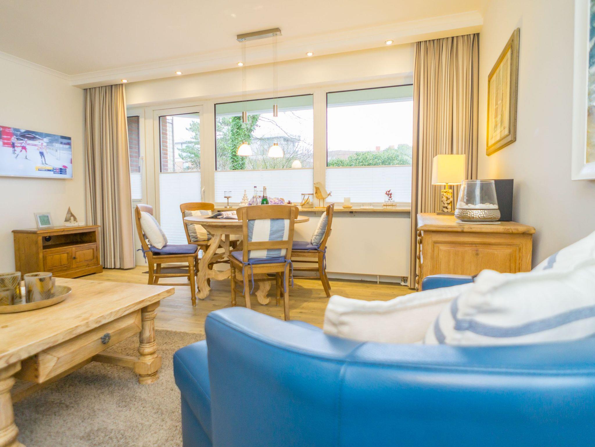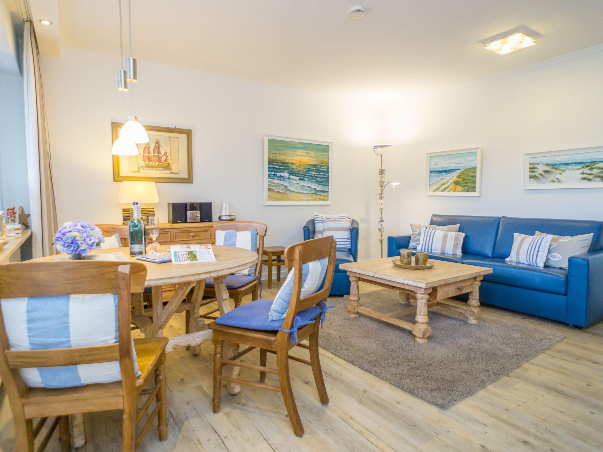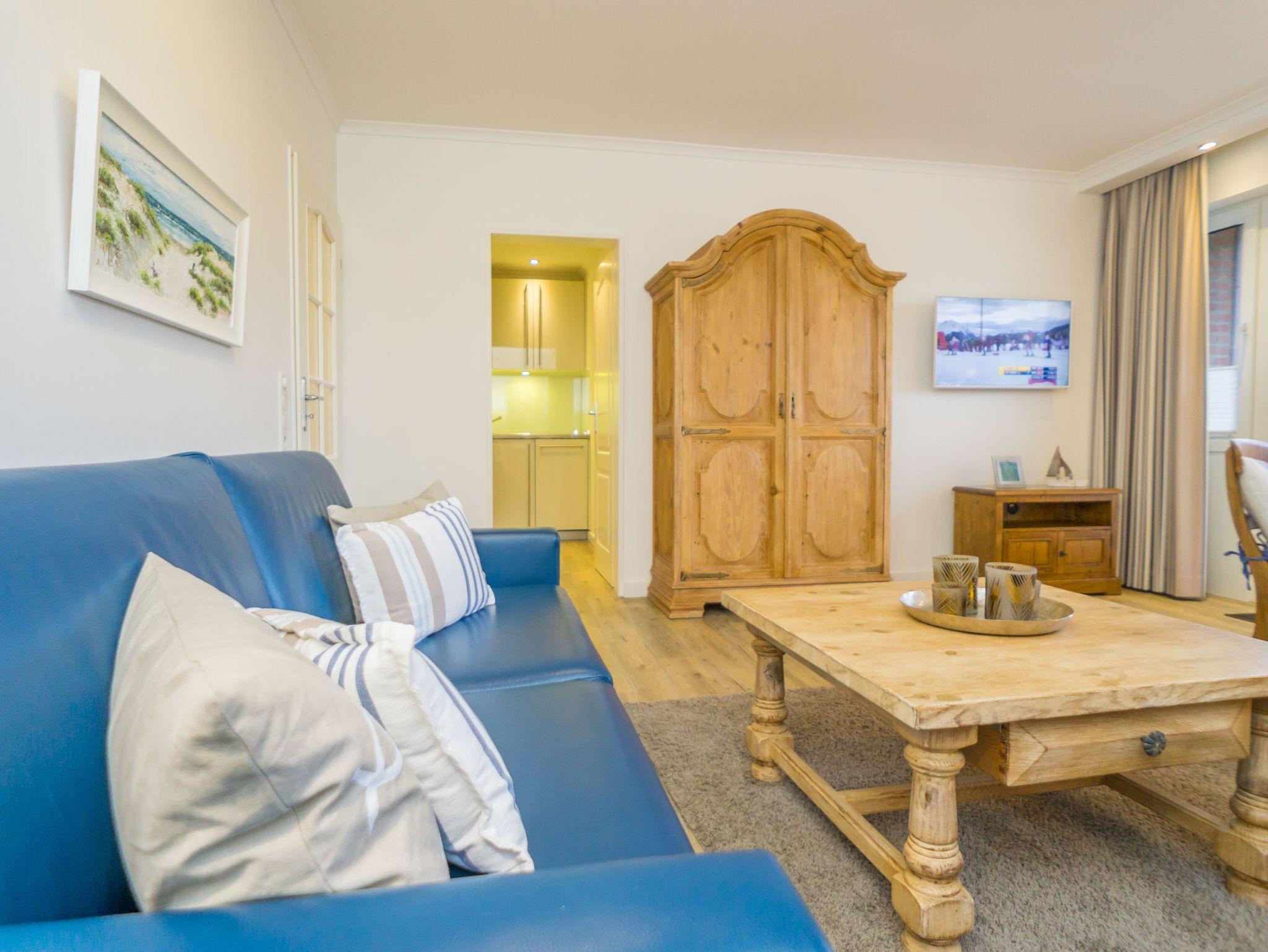 Der Wohnraum besteht aus einer Couchgarnitur von Bielefelder Werkstätten mit Schlaffunktion (separat ausklappbare Matratze in Komfortliegehöhe), einem Sessel, einem Essplatz, Kabel-Flachbild-TV, Radio und Telefon. Vom Wohnzimmer gelangt man in die vollausgestattete separate Küche bestehend aus einem Herd mit Backofen und Cerankochfeld, Geschirrspüler, Mikrowelle und Kühlschrank. Kaffeemaschine, Wasserkocher und Toaster gehören zur Grundausstattung.