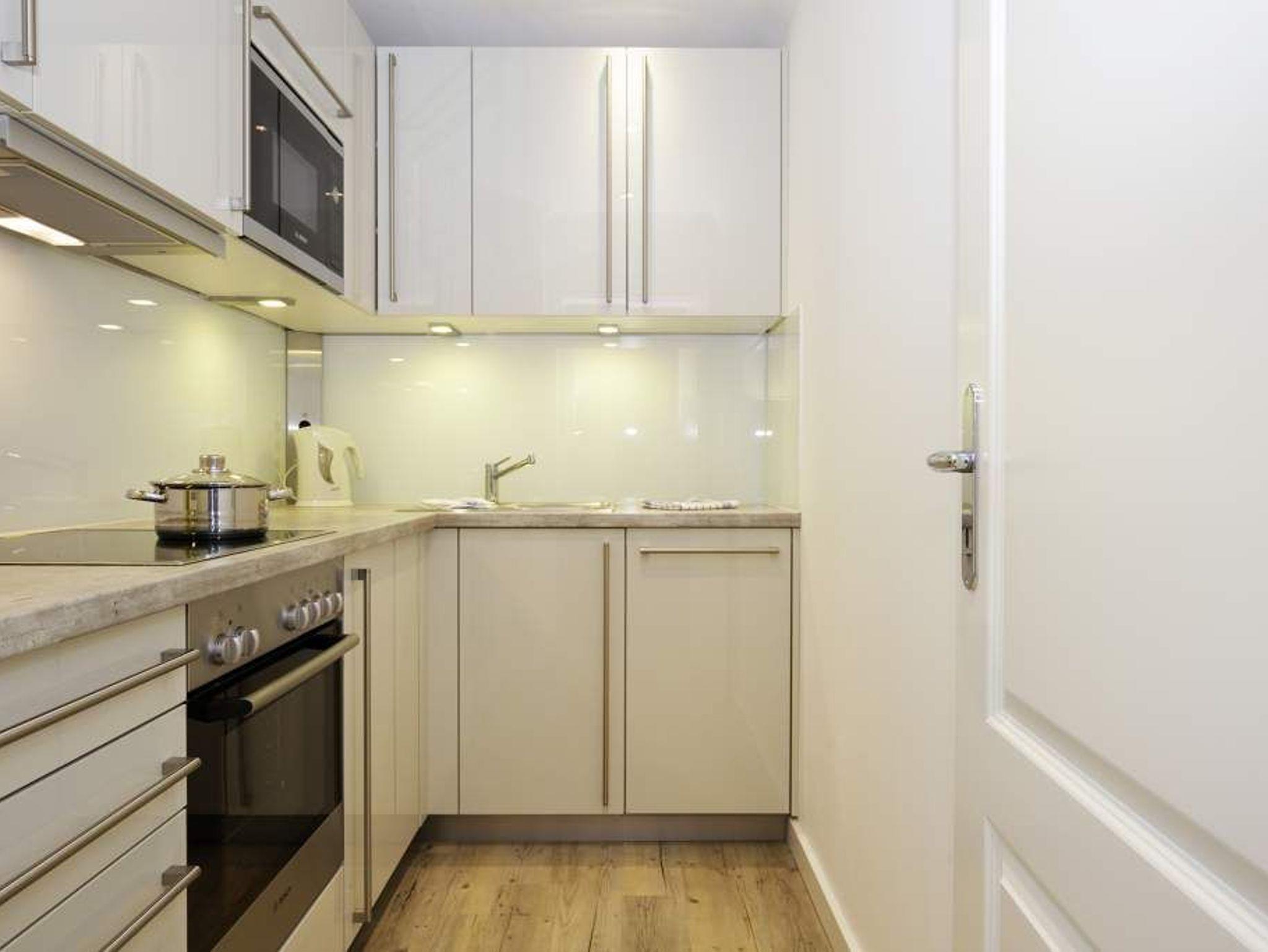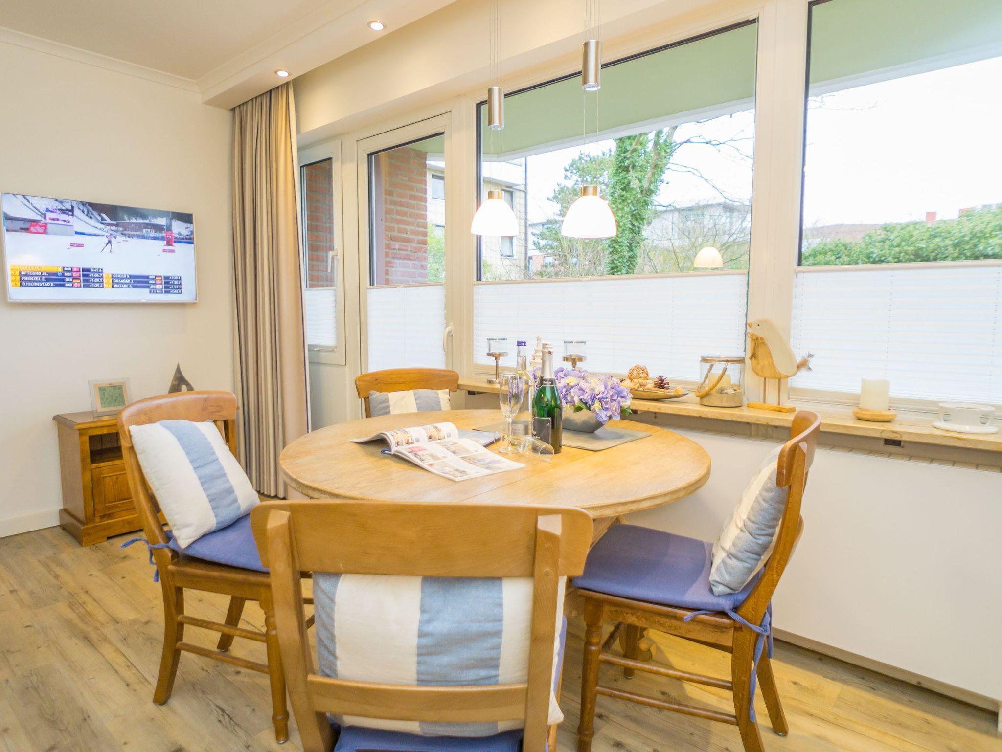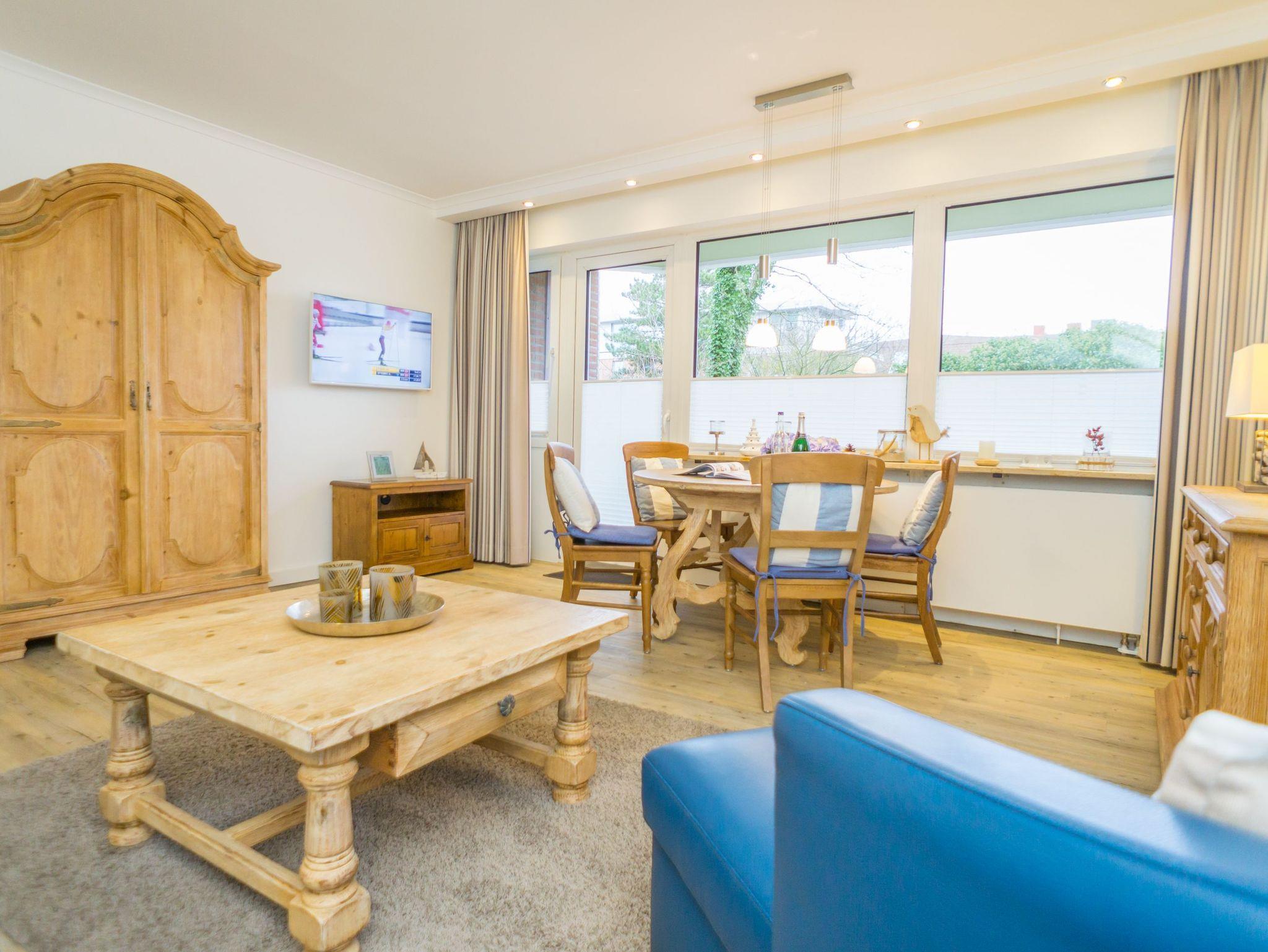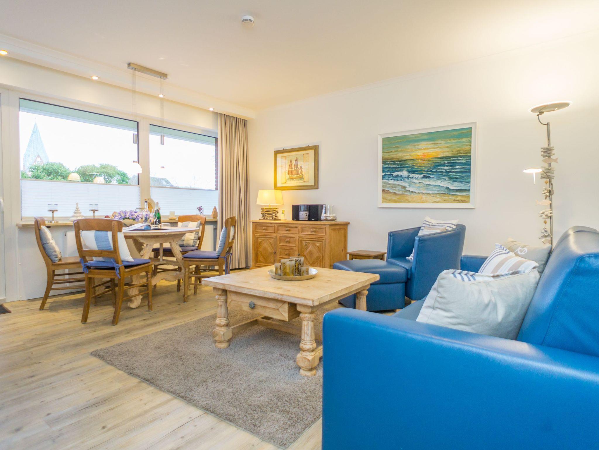 Der Wohnraum besteht aus einer Couchgarnitur von Bielefelder Werkstätten mit Schlaffunktion (separat ausklappbare Matratze in Komfortliegehöhe), einem Sessel, einem Essplatz, Kabel-Flachbild-TV, Radio und Telefon. Vom Wohnzimmer gelangt man in die vollausgestattete separate Küche bestehend aus einem Herd mit Backofen und Cerankochfeld, Geschirrspüler, Mikrowelle und Kühlschrank. Kaffeemaschine, Wasserkocher und Toaster gehören zur Grundausstattung.