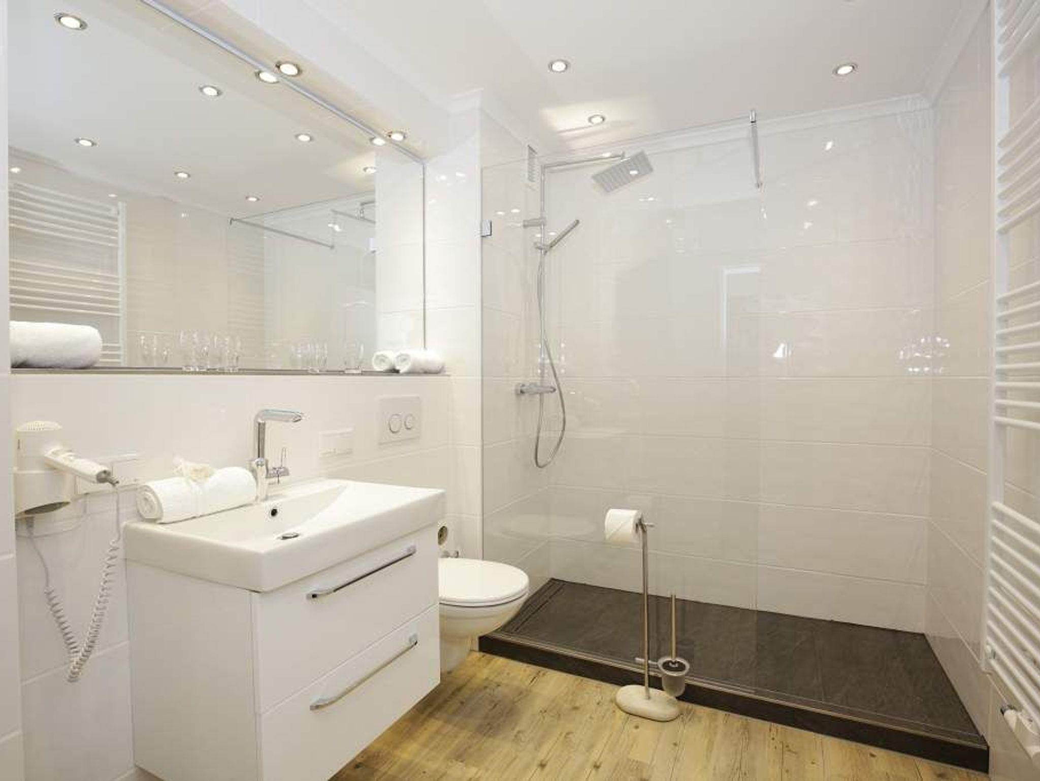 Im Bad befindet sich eine großzügige Dusche mit extraflachem Einstieg, ein Waschtisch, Handtuchtrockner und WC.