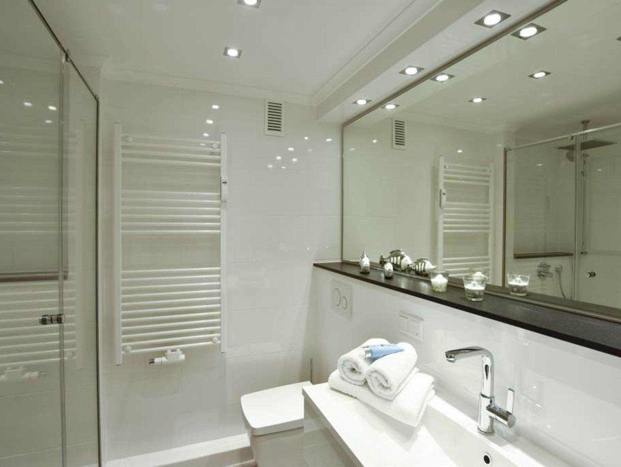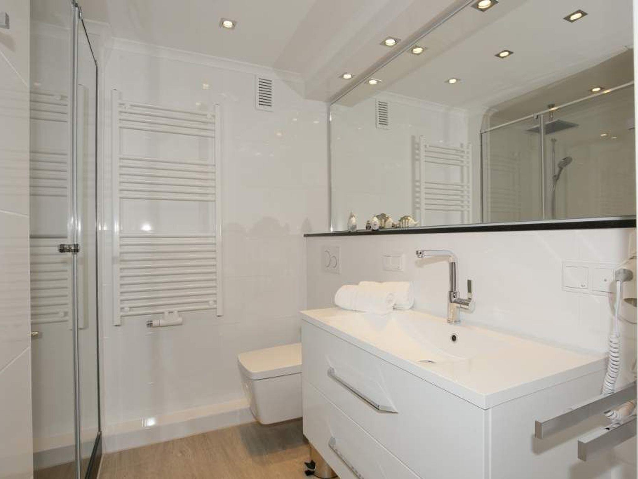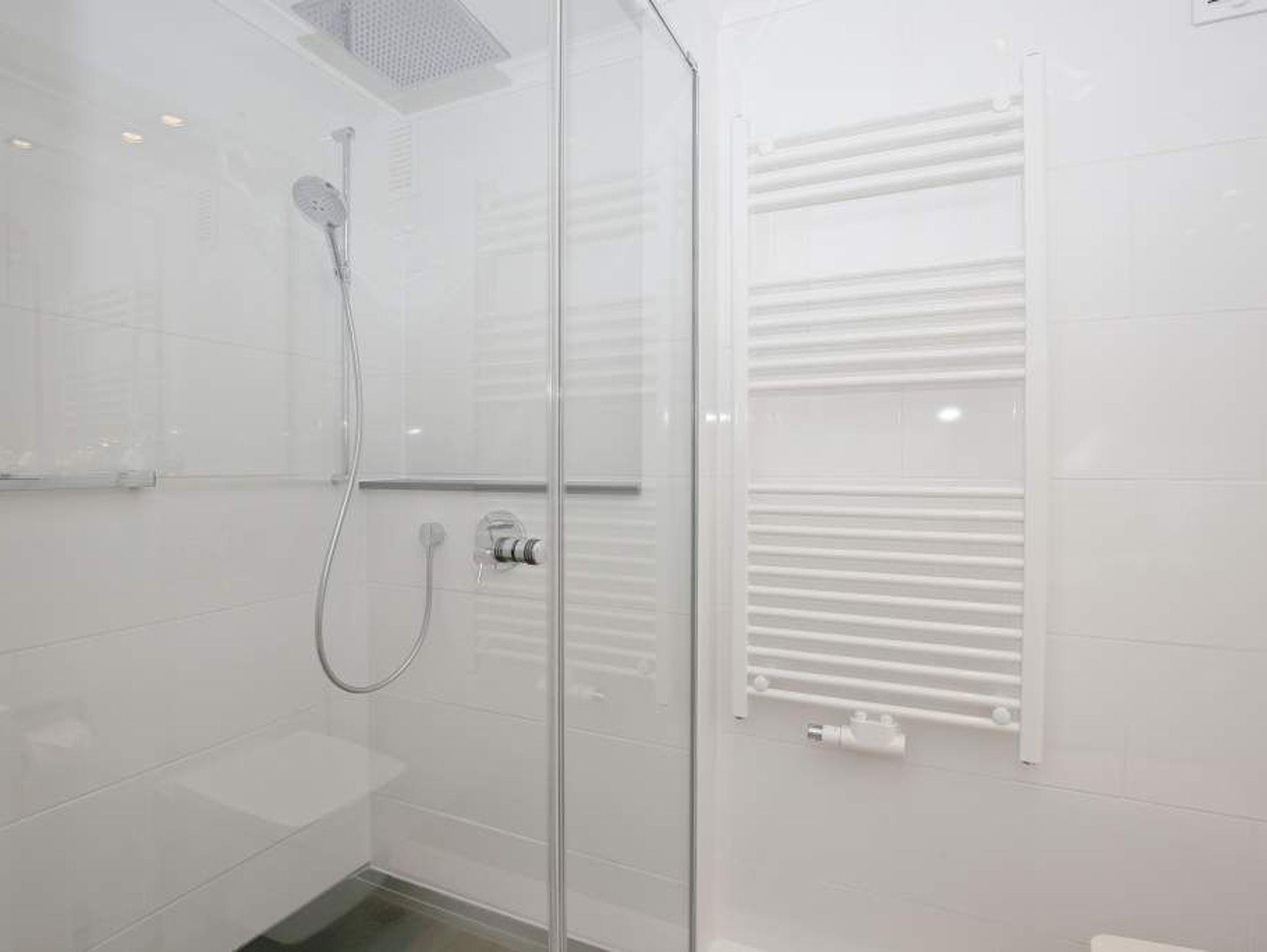 Das exklusive Badezimmer bietet mit schwarzem Granitboden in der Dusche, einem hochwertigen Duschsystem mit Kopf- und Handbrause, extraflachem Einstieg, modernem Waschtisch, festinstalliertem Haartrockner, Handtuchtrockner und Softclose-WC echten Spa-Komfort.