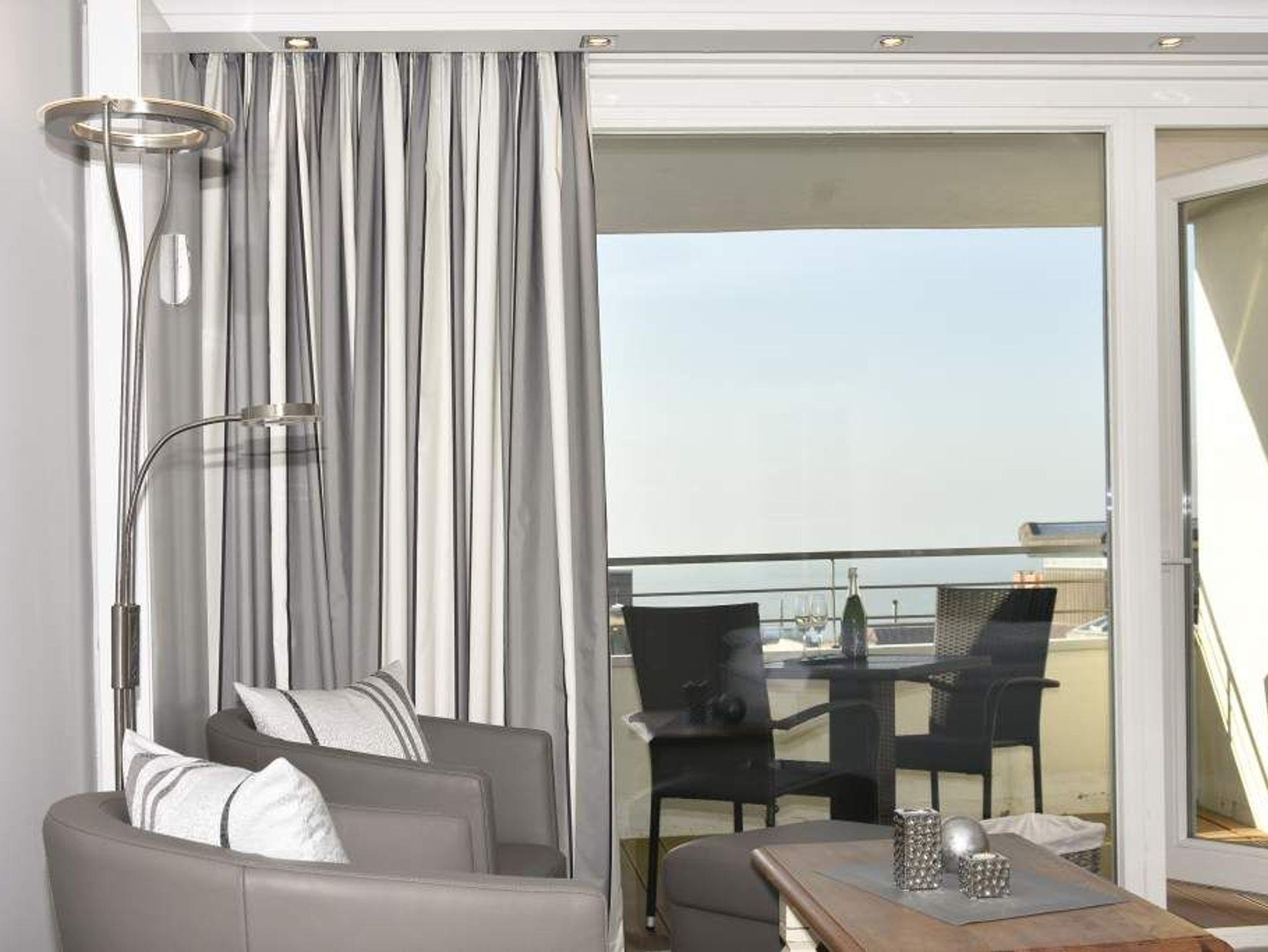 Diese hochwertig sanierte 1-Zimmer-Nichtraucher-Ferienwohnung (ca.?43?m²) in der 4. Etage besticht durch ihren stilvollen Komfort, ihre Großzügigkeit und den traumhaften Blick zur Nordsee. Die sonnige Westloggia mit Balkonmöbeln und Auflagen lädt nachmittags zum Entspannen und Genießen des Meerblicks ein ? perfekt für Paare, die Wert auf stilvolles Ambiente legen.