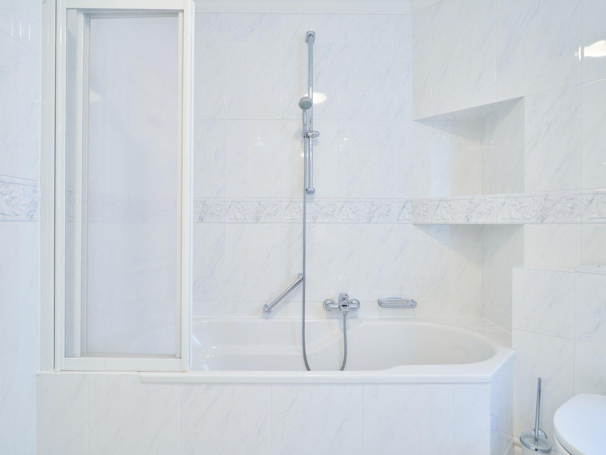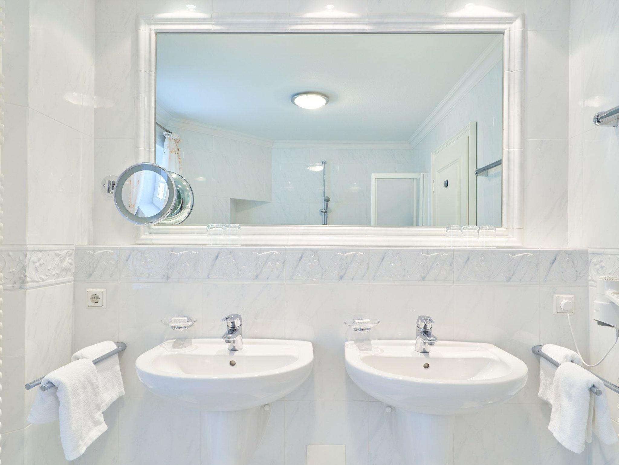 Zwei Badezimmer, einmal mit Wanne, Doppelwaschbecken und WC und ein zusätzliches WC.