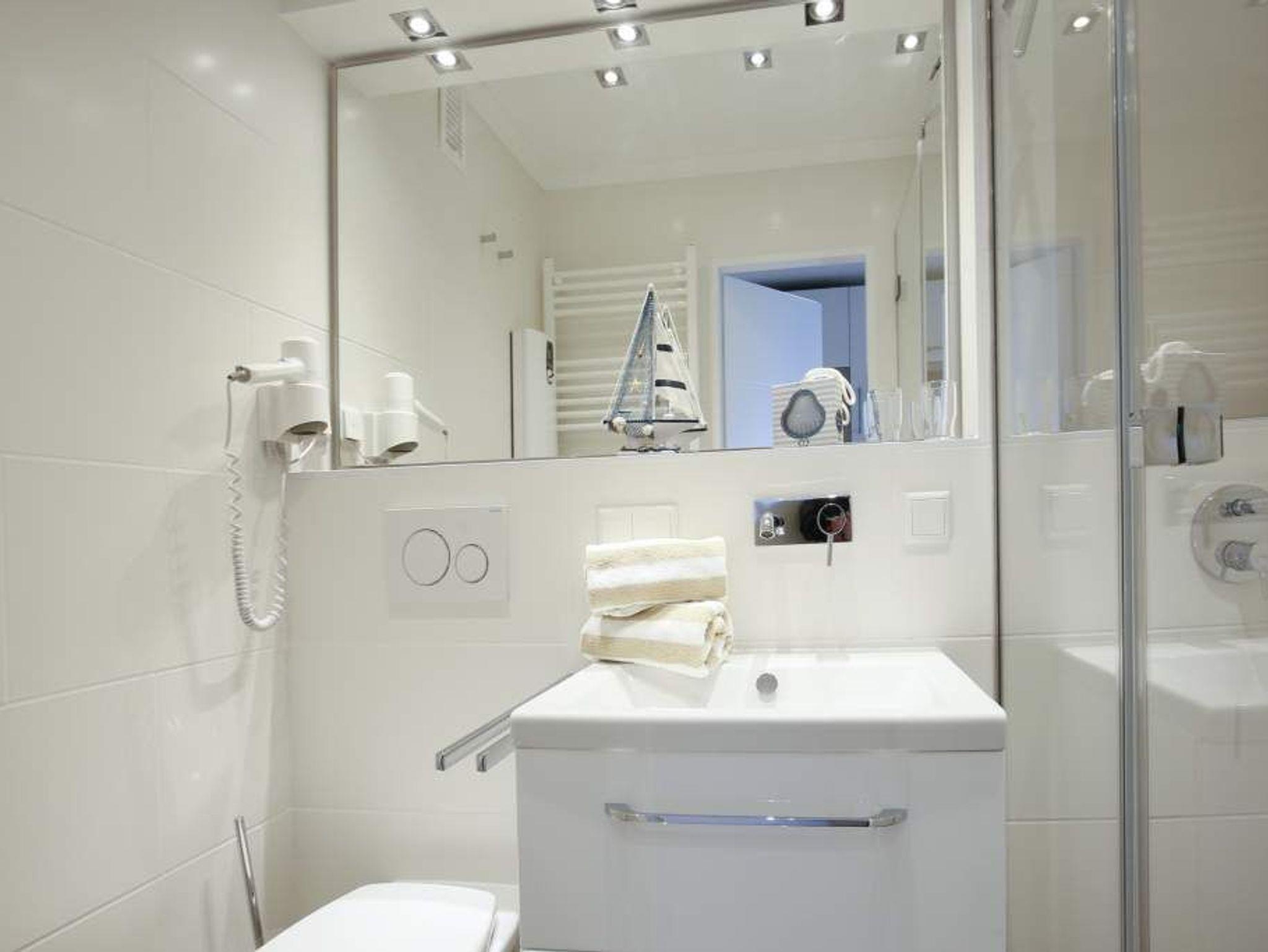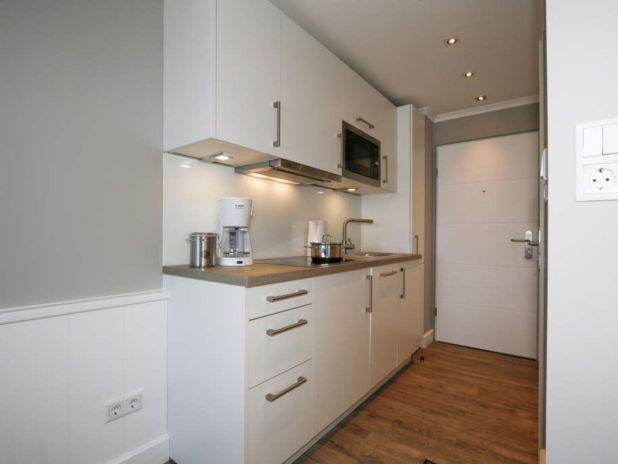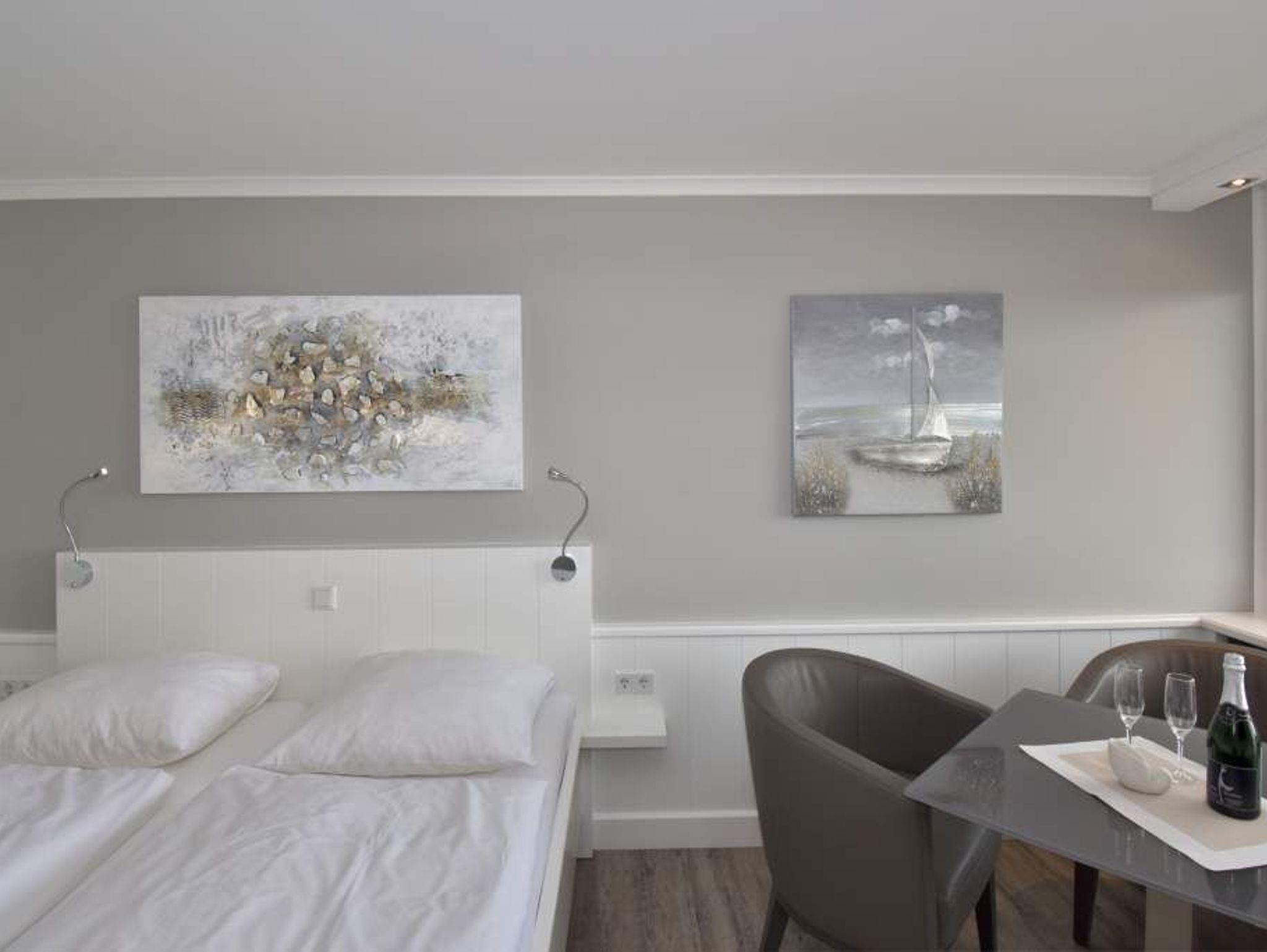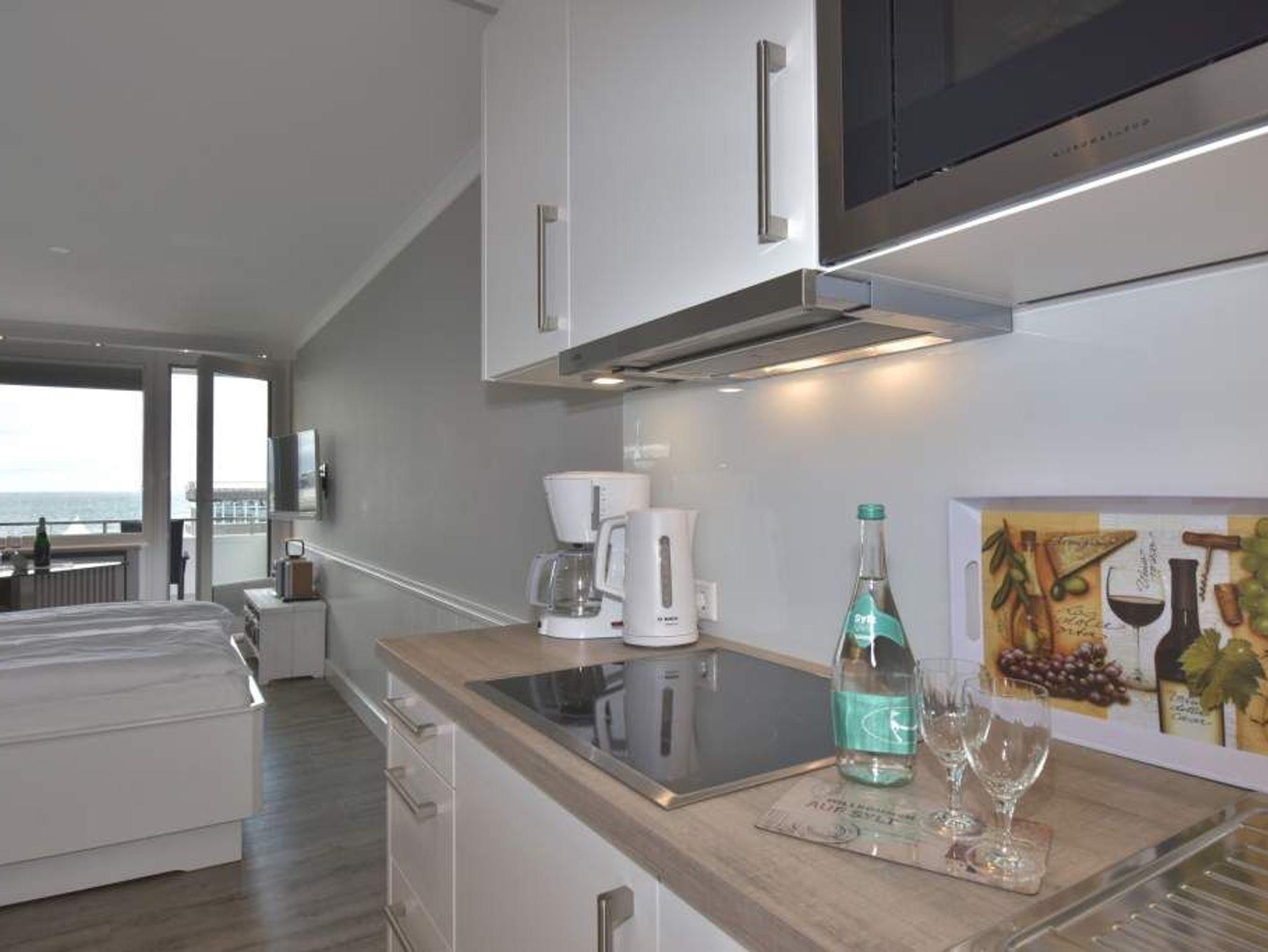 Individuell gestaltete 1-Zimmer-Nichtraucher-Ferienwohnung (ca. 25 qm) in der 4. Etage zur Seeseite mit Westloggia und herrlichem Meerblick, (Nachmittagssonne mit Balkonmöbeln und Auflagen) für max. 2 Personen. Vom Vorflur mit Garderobe und Küchenzeile gelangt man in das kombinierte Wohn-/Schlafzimmer (mit Austritt zum Balkon) und in das moderne Duschbad/WC.