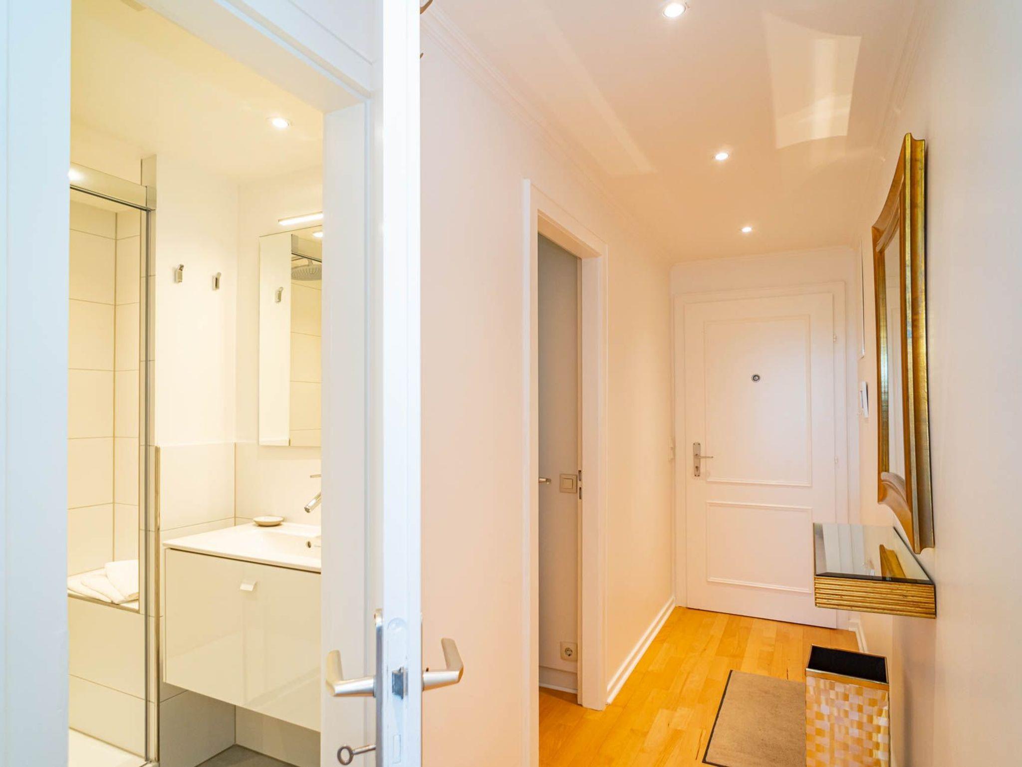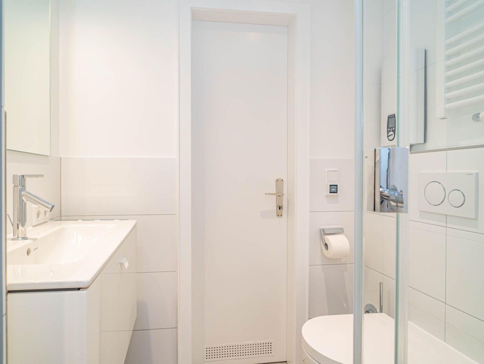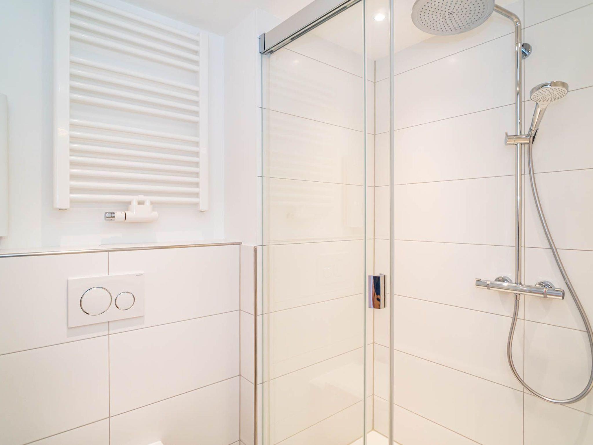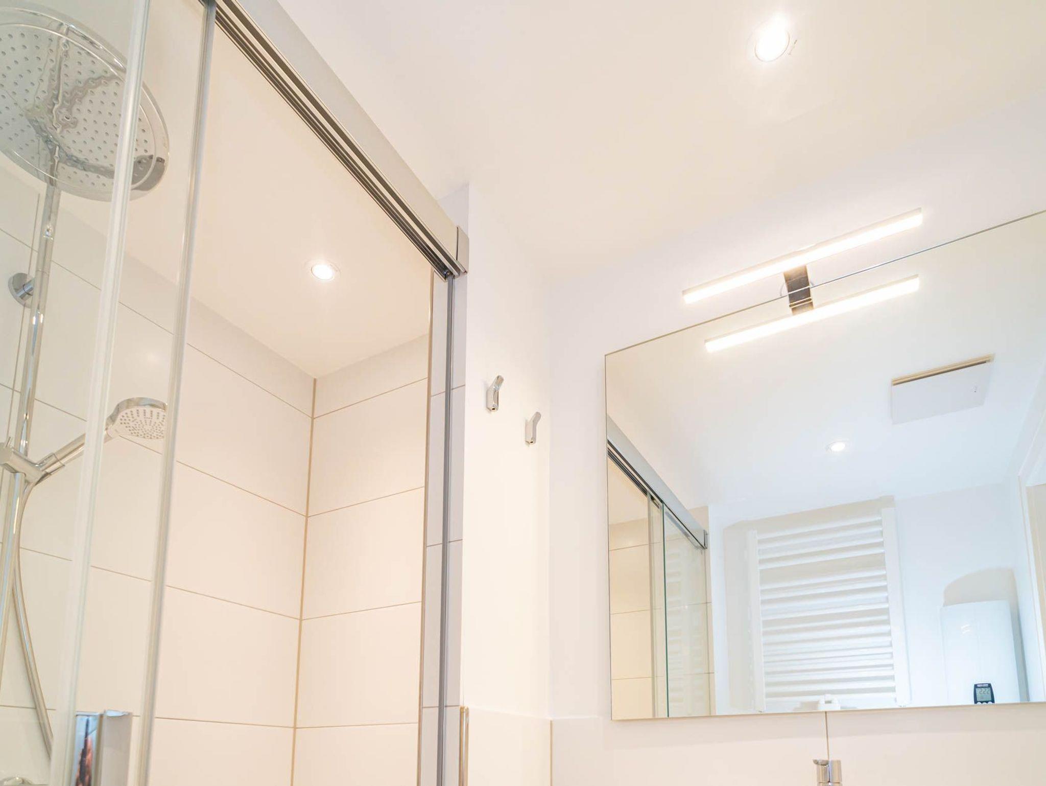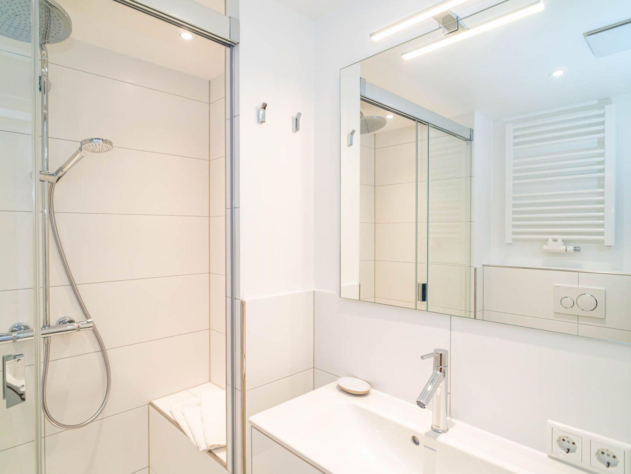 Das Badezimmer wurde 2022 vollständig modernisiert und bietet eine großzügige Dusche mit Sitzbank, Waschtisch, WC, Schminkspiegel, Föhn und Handtuchtrockner durchdacht und stilvoll gestaltet.