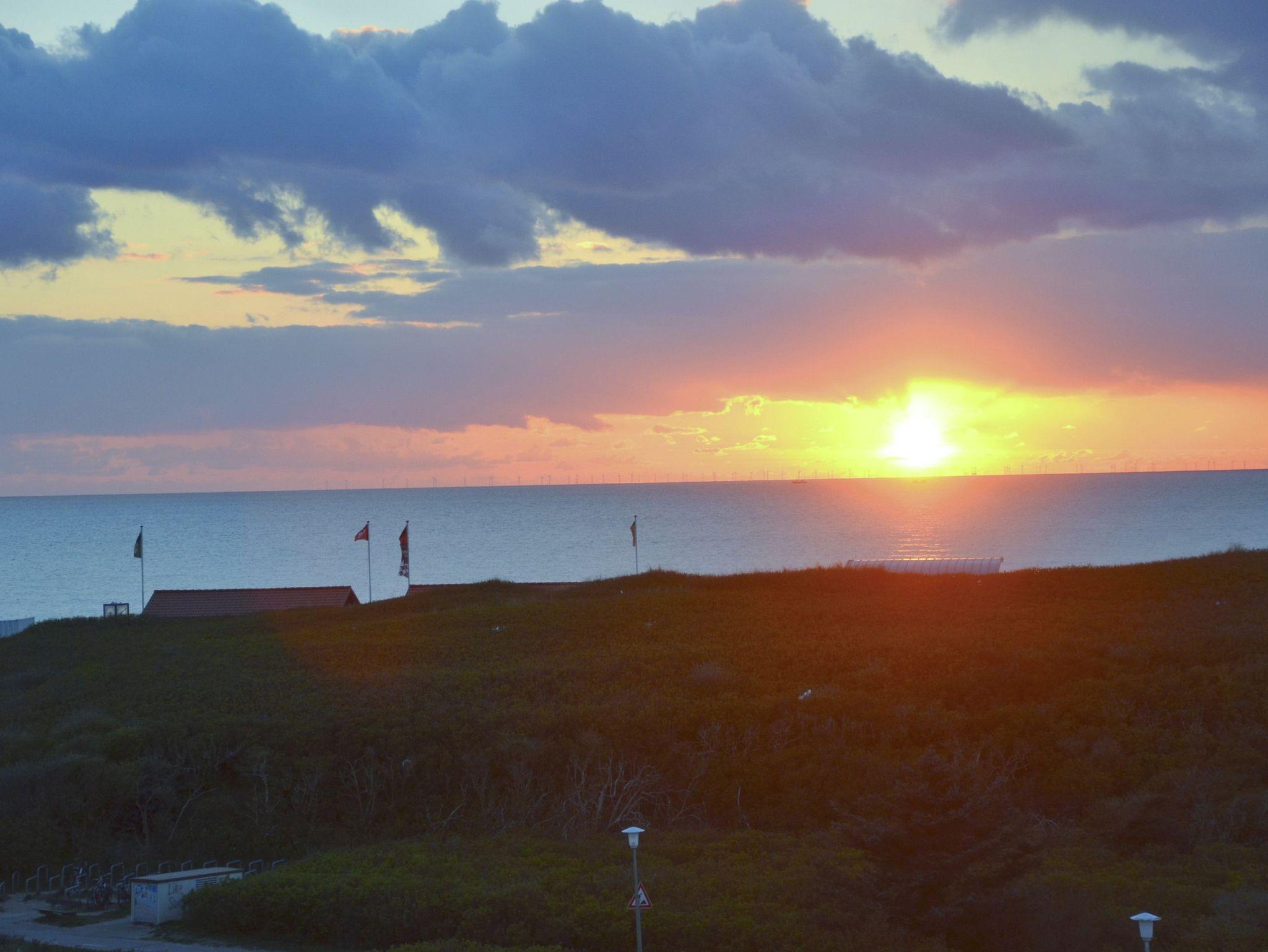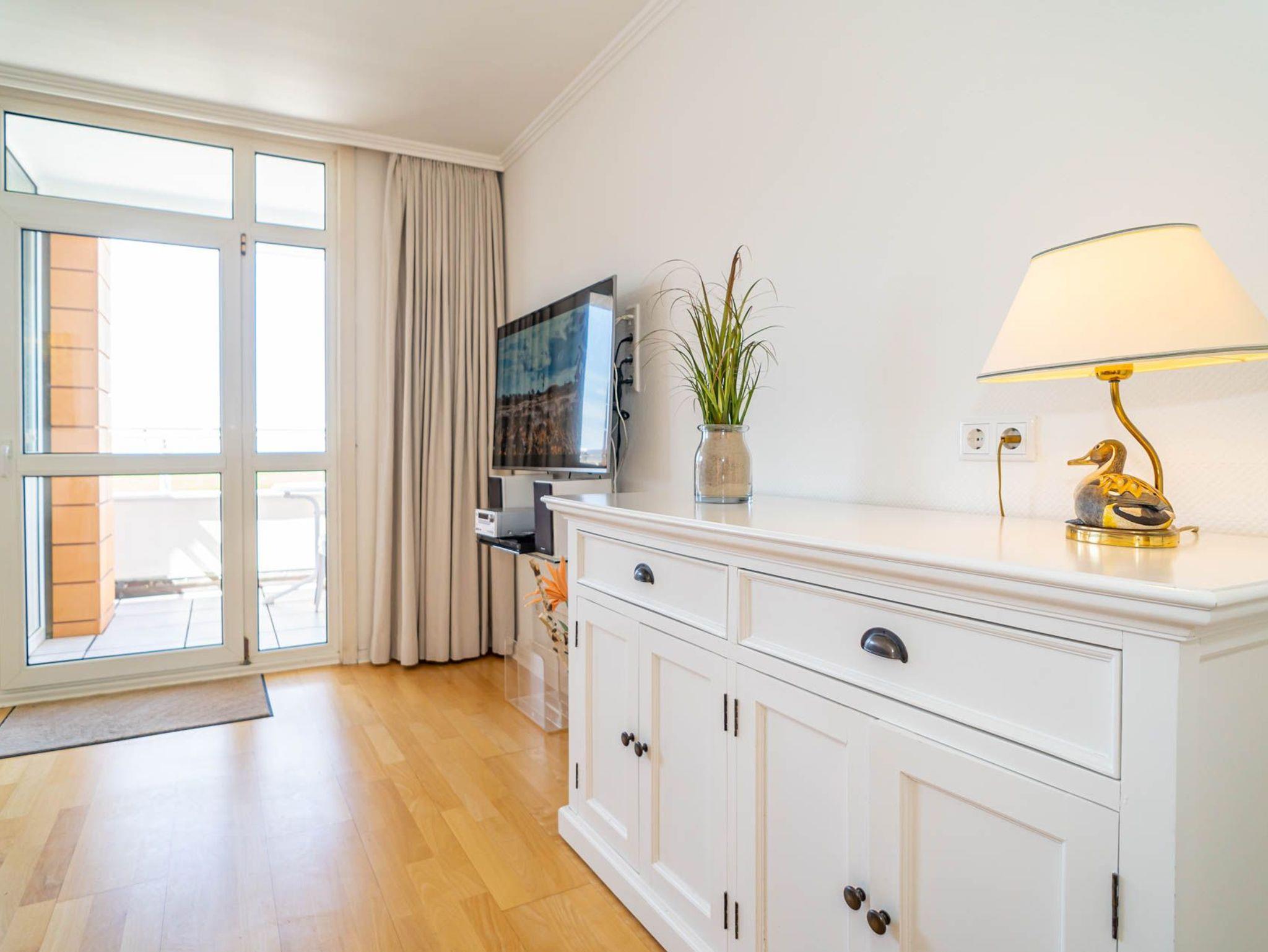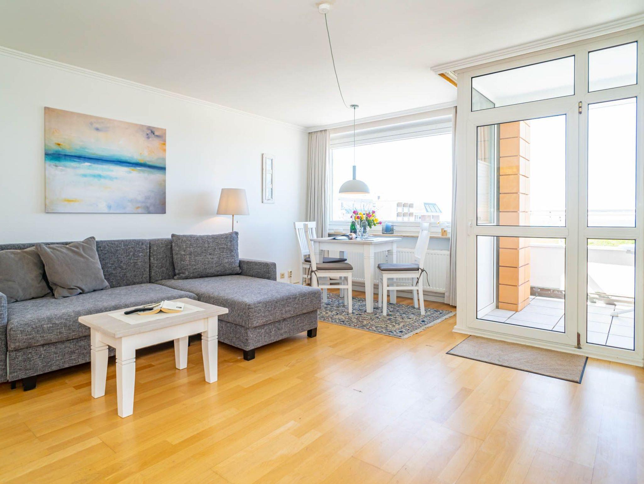 Der lichtdurchflutete Wohnbereich ist mit einem bequemen 3-Sitzer-Sofa mit Chaiselongue, einem Sessel, einer Kommode sowie einem Esstisch direkt am Fenster mit Meerblick ausgestattet. Für Unterhaltung sorgen ein großer Smart-TV (110 cm), ein DVD-Player und kostenfreies WLAN (ohne Gewährleistung). Vom Wohnzimmer aus gelangen Sie auf den Westbalkon ? ausgestattet mit Tisch und bequemen Sesseln ? ein perfekter Platz, um den Sonnenuntergang zu genießen.