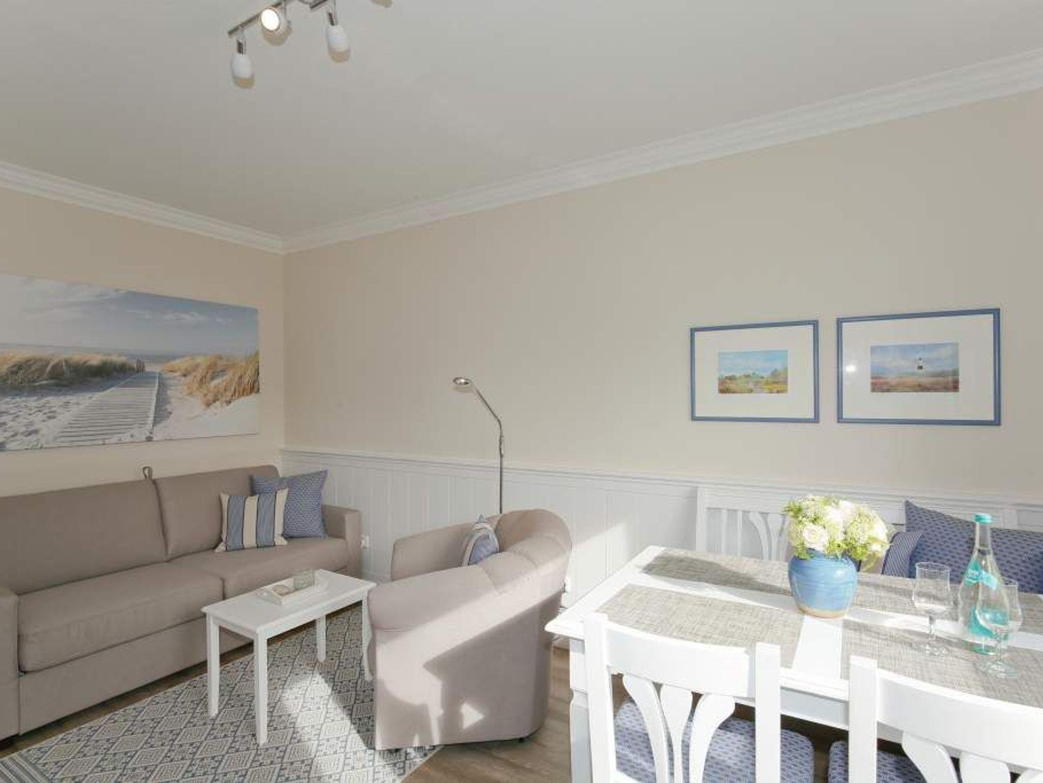 Diese charmante 2-Zimmer-Nichtraucher-Ferienwohnung mit ca. 37 qm Wohnfläche im Hochparterre auf der Süd-Ostseite ist ideal für maximal 2 Personen. Im hellen Wohnzimmer finden Sie eine komfortable Schlafcouch (1,40 x 1,80 m), einen gemütlichen Sessel mit passendem Fußhocker sowie einen separaten Essplatz. Für Ihre Unterhaltung sorgen ein Radio/CD-Player, Kabel-TV und ein stimmungsvoller Elektrokamin. Der angrenzende Süd-Ostbalkon lädt dazu ein, die frische Seeluft zu genießen.