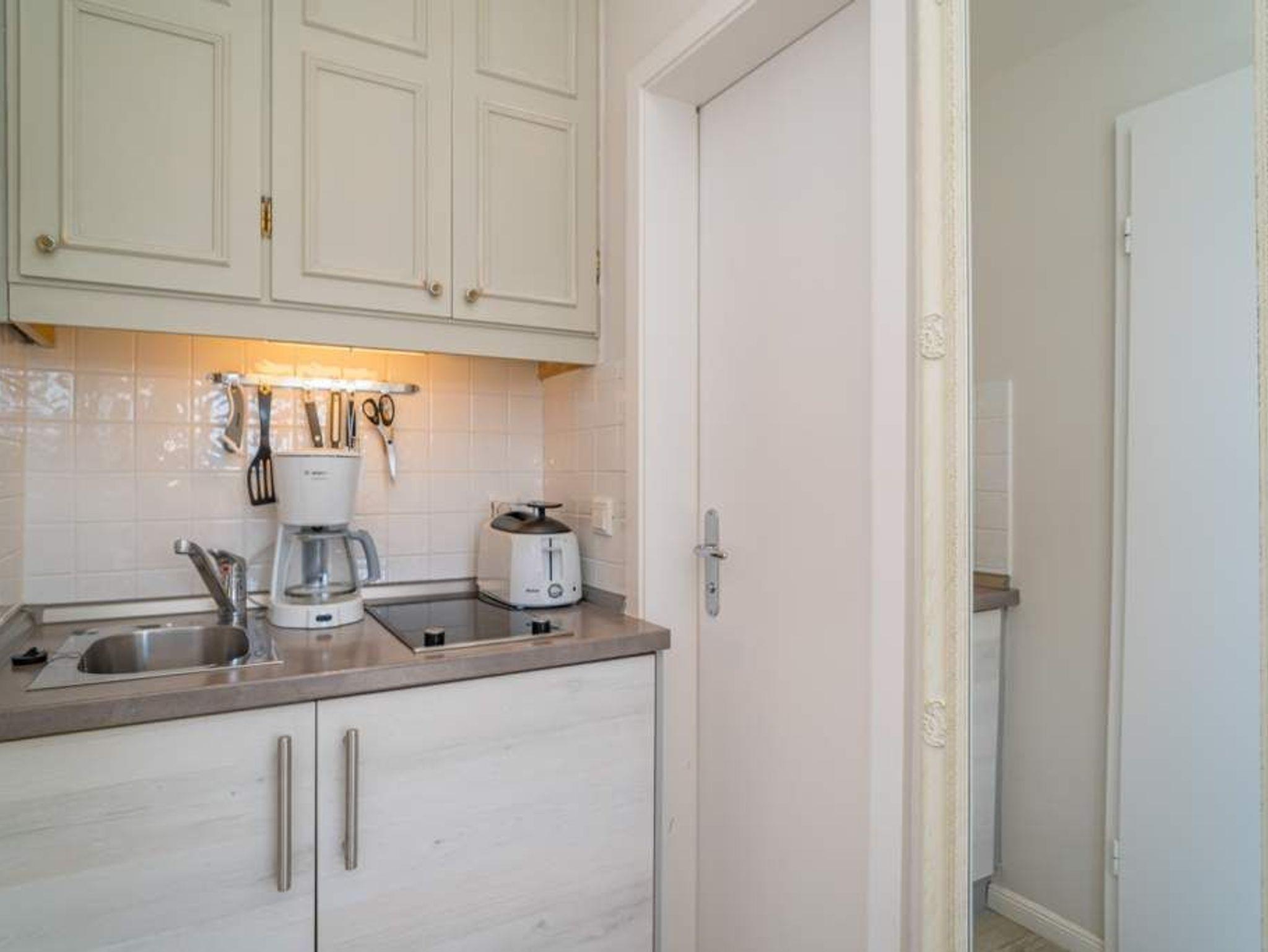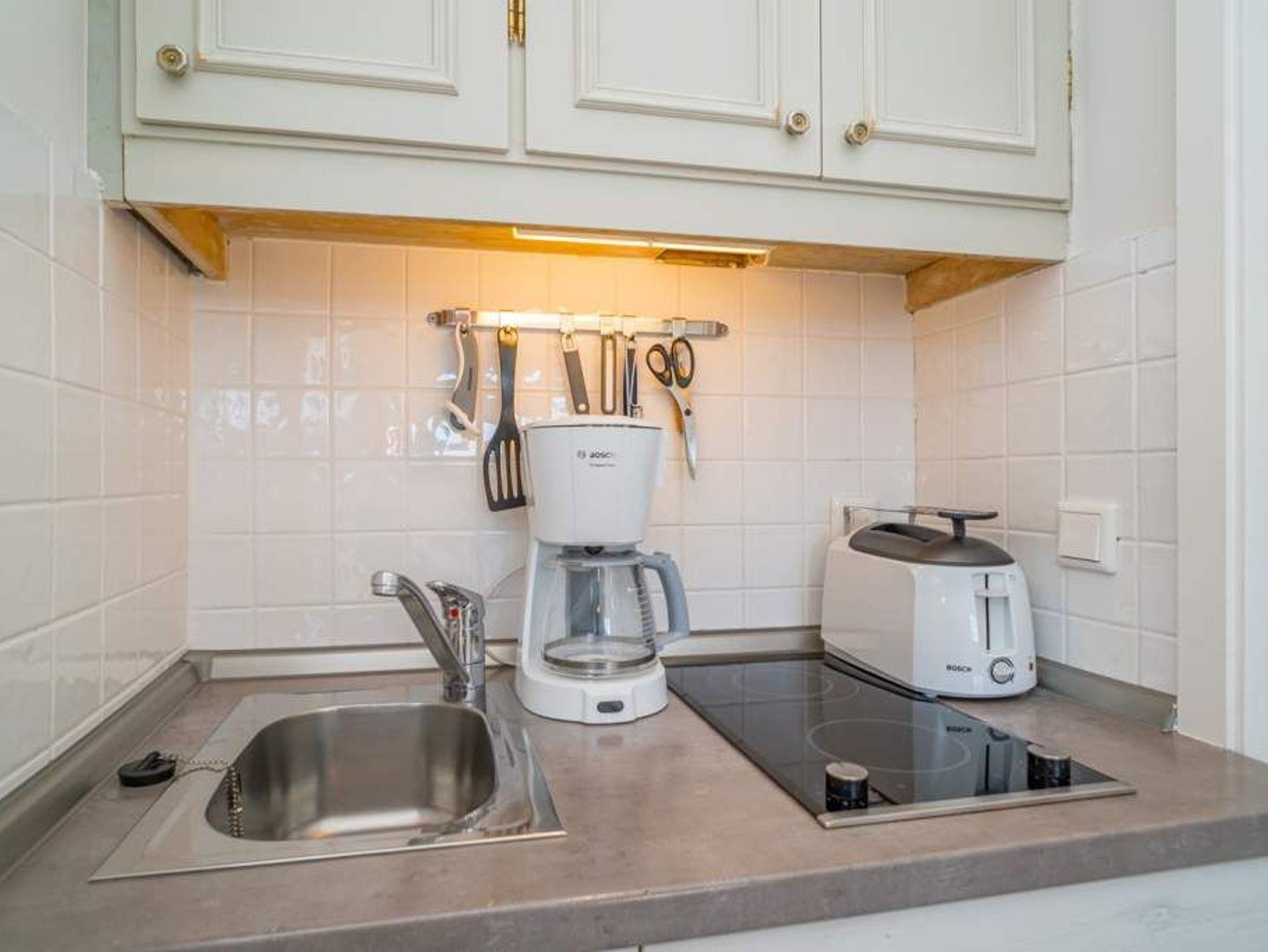 Die kleine Küchenzeile hat ein Ceranfeld mit 2 Kochfeldern und einen Kühlschrank. Kaffeemaschine, Wasserkocher und Toaster gehören zur Grundausstattung.