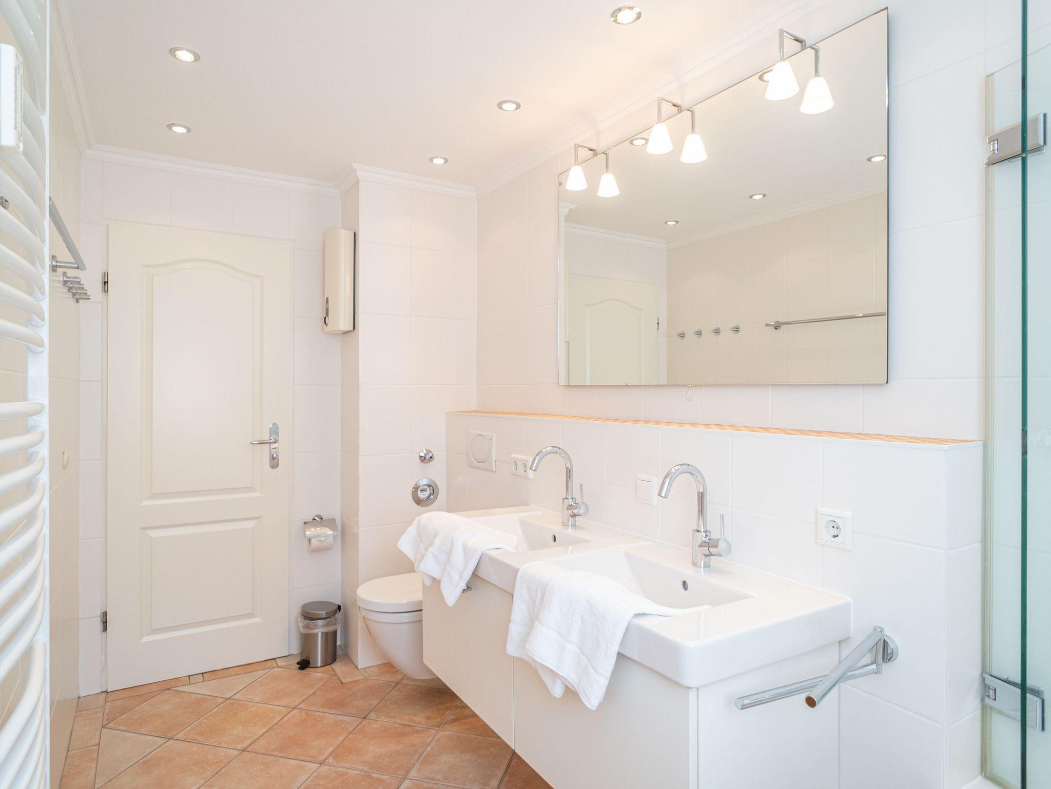 Das neue, großzügige Bad hat eine Wanne mit Duschmöglichkeit und Glastrennwand, ein WC, einen Doppelwaschtisch, einen Handtuchtrockner und ein Fenster.
