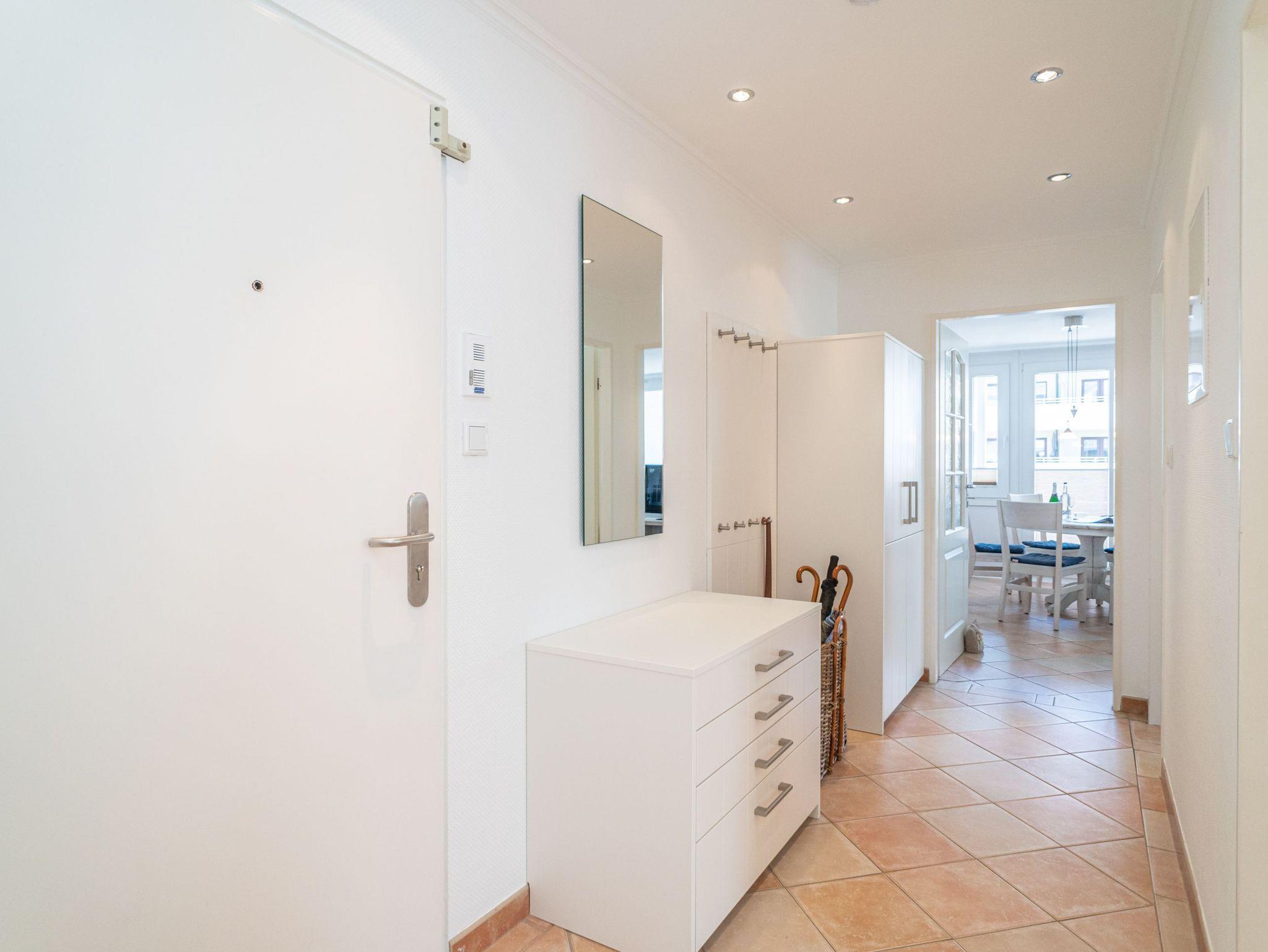 Schicke, komplett mit Fliesen ausgelegte 3-Zimmer-Ferienwohnung (ca. 63 qm) in der 3. Etage zur Landseite mit Ostloggia (Morgensonne, mit Balkonmöbeln und Auflagen) für max. 4 Personen.
