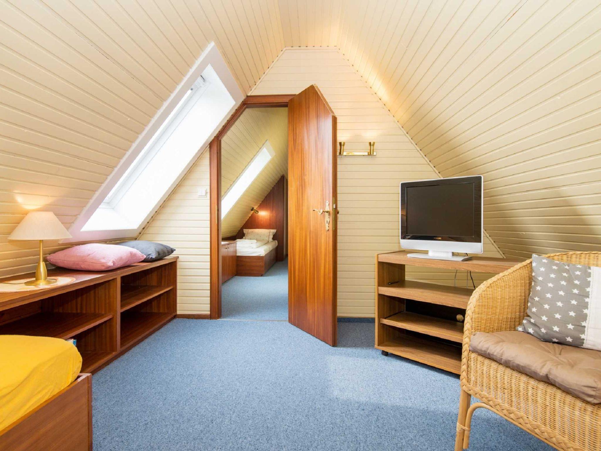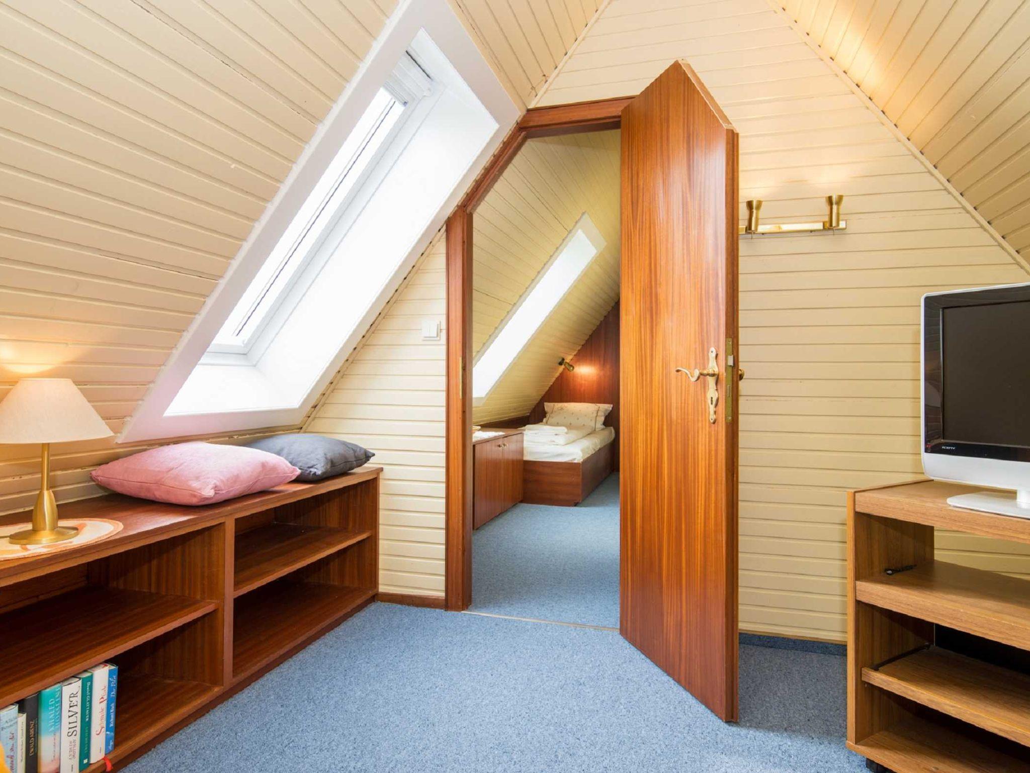 Das 1 Zimmerappartement befindet sich im Dachgeschoss. Hier haben Sie die gesamte Etage für sich allein. Ausgestattet für 2 Personen mit zwei getrennt stehenden Betten (90x190cm), 2 Korbsesseln und Tisch, Flachbild TV. Eine separate Küche mit Essgelegenheit, einem 2 Plattenkochherd, Kühlschrank mit Gefrierfach, Mikrowelle, Kaffeemaschine, Geschirr und Töpfe. Ein kleines Badezimmer mit Dusche/WC steht Ihnen zur Verfügung.