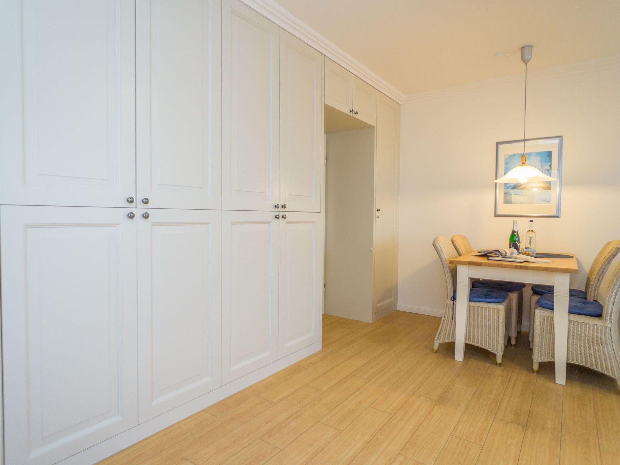 Im Vorflur befinden sich Einbauschränke und ein großer Spiegel an der Tür zum Bad.